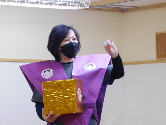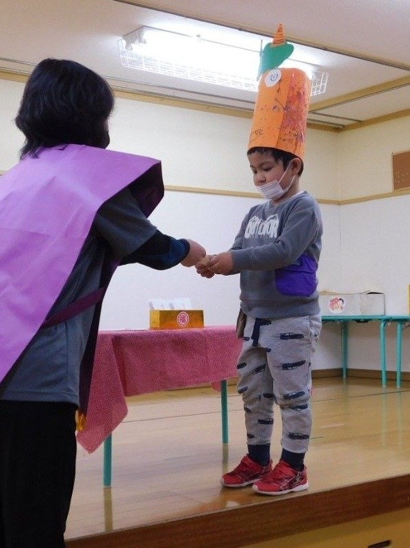 頑張ってオニに立ち向かった子ども達へ,最後は『福菓子拾い』のごほうびと,『福豆授与』がありました。幸せ(福菓子)をたくさん掴んだ子ども達,いい笑顔で締め括りました。