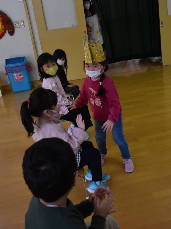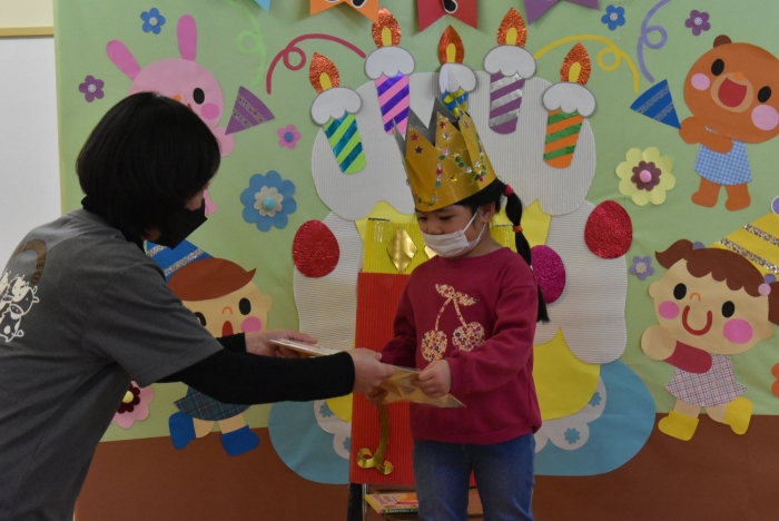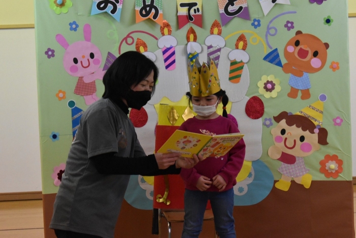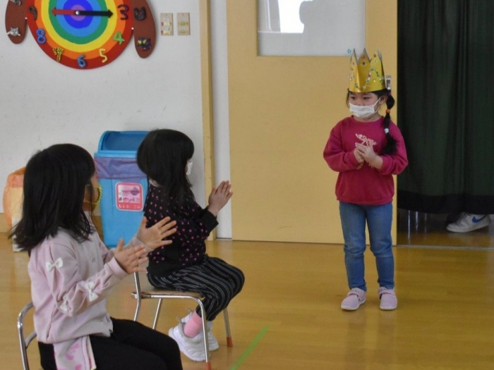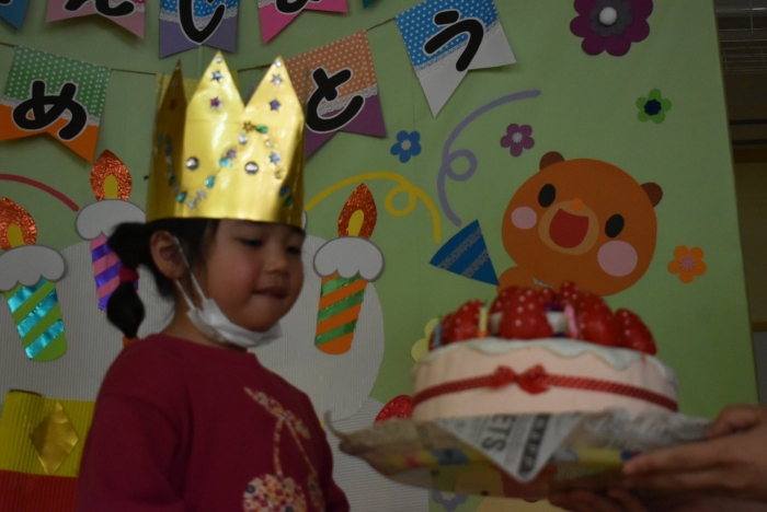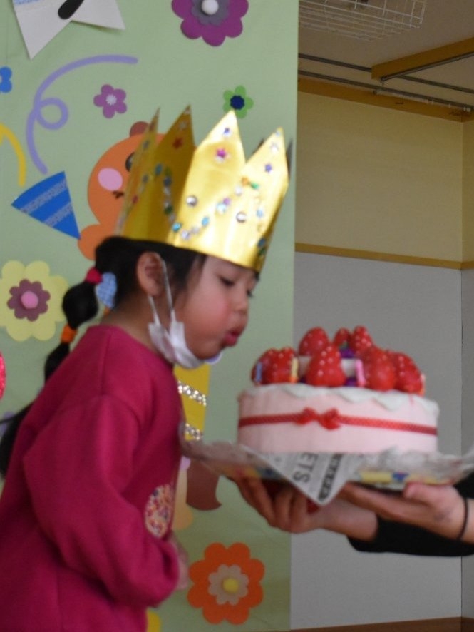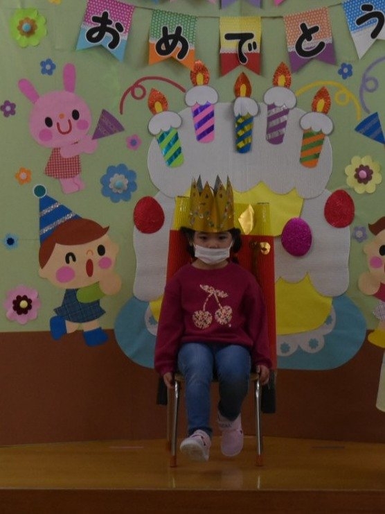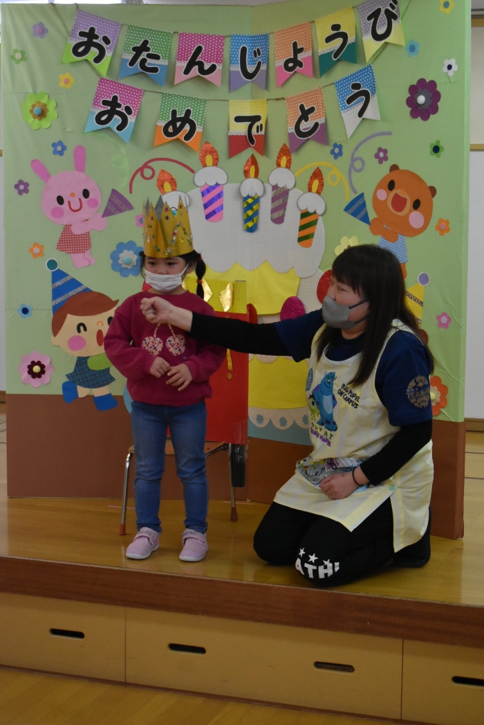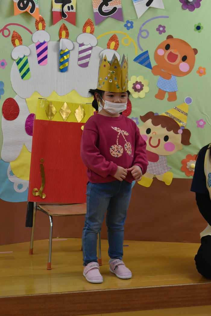 今年度最後となる『誕生会』。待ちに待った2月生まれの友達の喜び・嬉しさをみんなで共有しました。 友達がお祝いされる場面を見て,楽しみにしていた入・退場でのハイタッチ! 誕生児だけの特別仕様の椅子,お祝いの絵本やプレゼント授与,誕生日ケーキのロウソク吹き消し,それらを体験することができ,それは嬉しそうな表情でした。 ステージ上では ちょっぴり緊張しながらも,一つ大きくなった気持ちをもって自己紹介や,友達・先生からの質問に受け答えをしていました。その姿をほのぼの見つめる友達,祝福ムードで心が温まる誕生会でした。