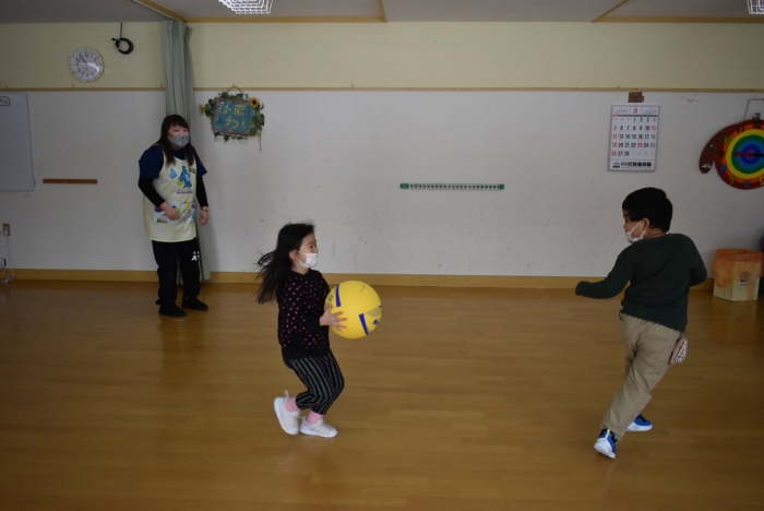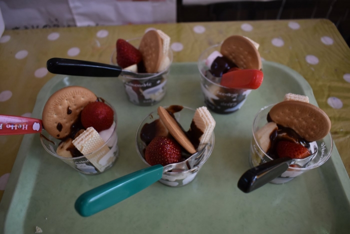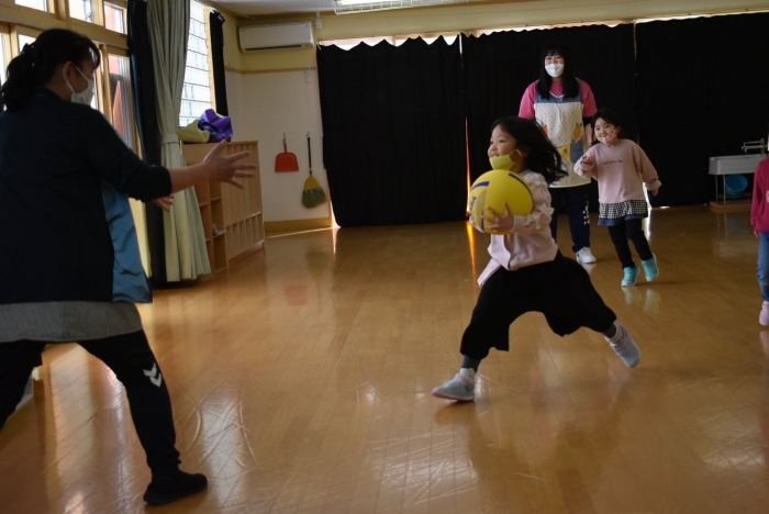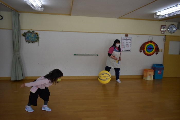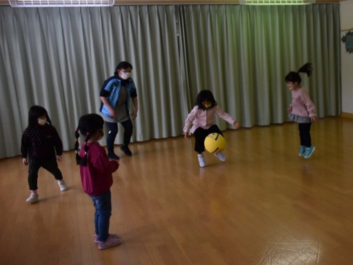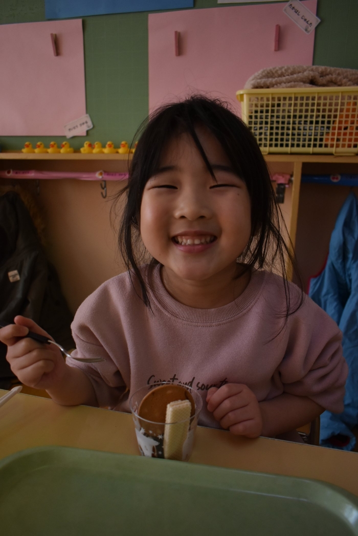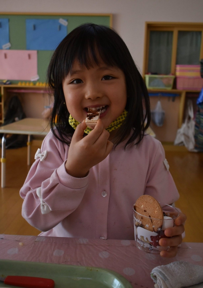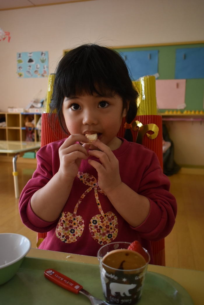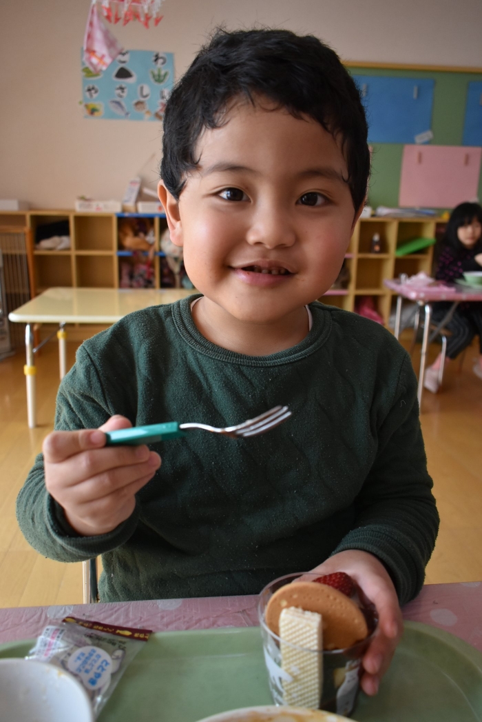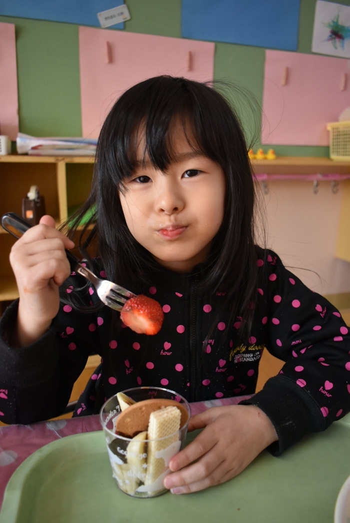 誕生会のお楽しみは,ボールを使った集団遊び『かたき』で燃えに燃え,カップに入ったフルーツ&菓子のチョコレートフォンデュに舌鼓,全園児が楽しさいっぱい! 幸せいっぱい!!の笑顔でした。