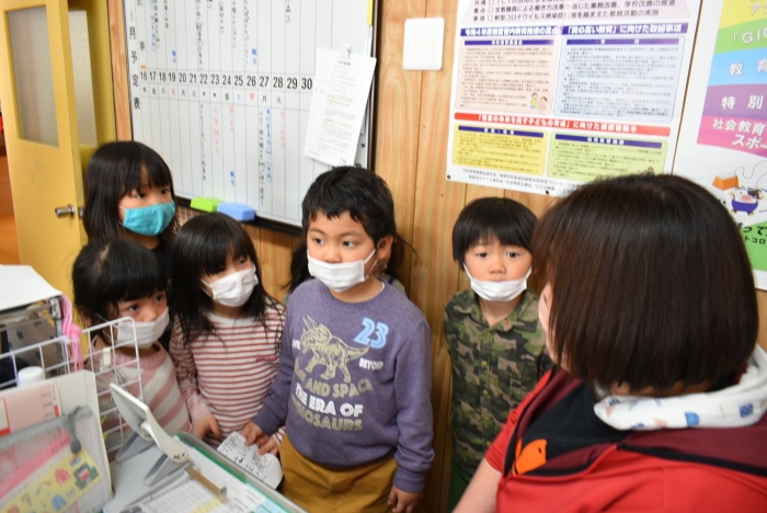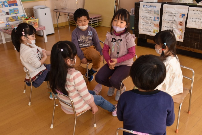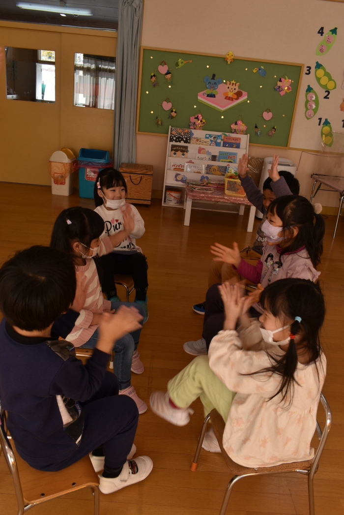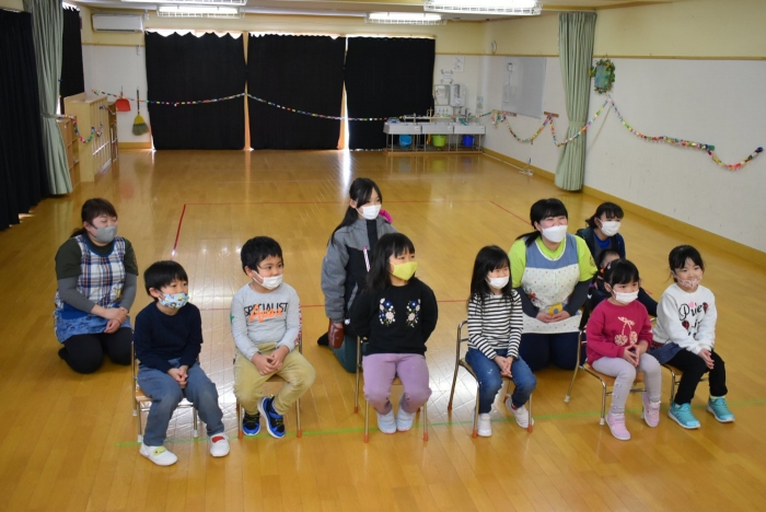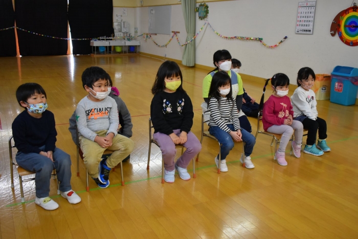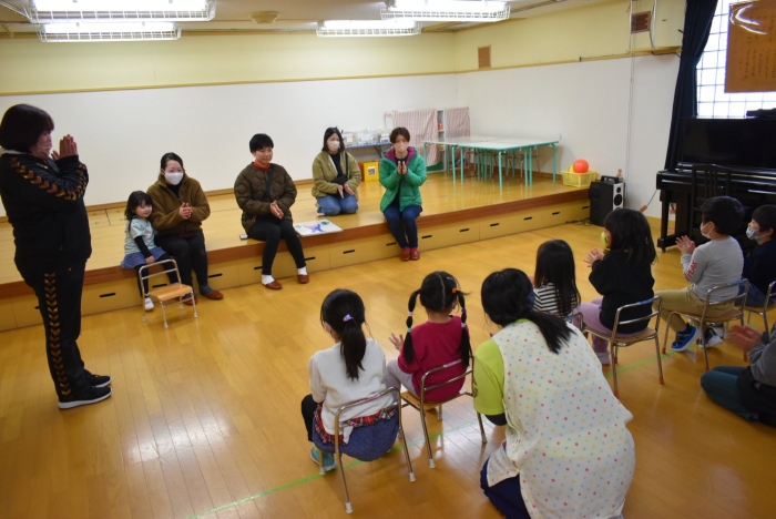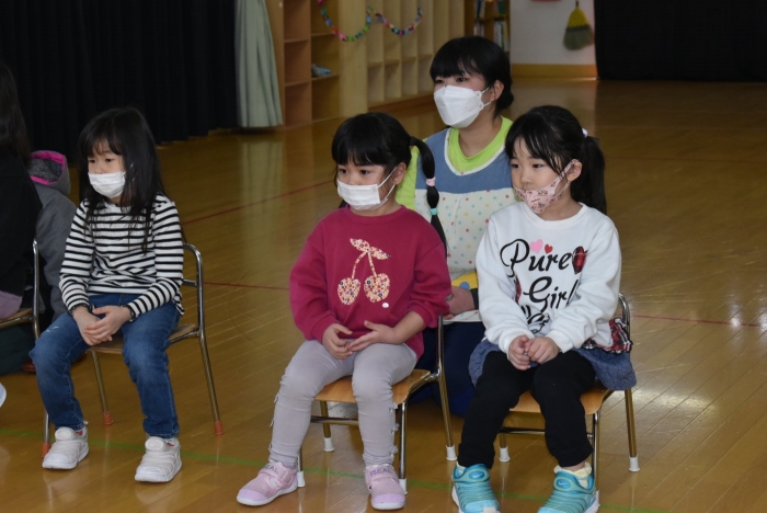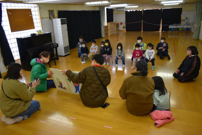 親と子の絵本の会『へそっこ』活動の締めくくりとして,『合同読み聞かせ』を行っていただきました。歴代の保護者の方が作成してくださった手作り絵本の中から,『アボカド・ベイビー』を読み聞かせしてくださいました。なんと,現保護者のお母さんが制作に携わった絵本だそうです! 改めて,受け継がれていく古き良き中西別幼稚園の文化を感じました。