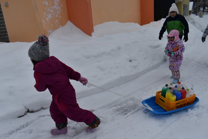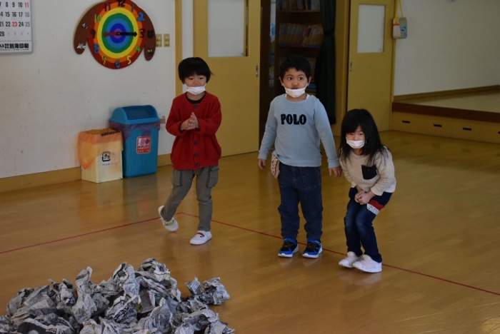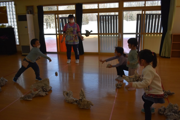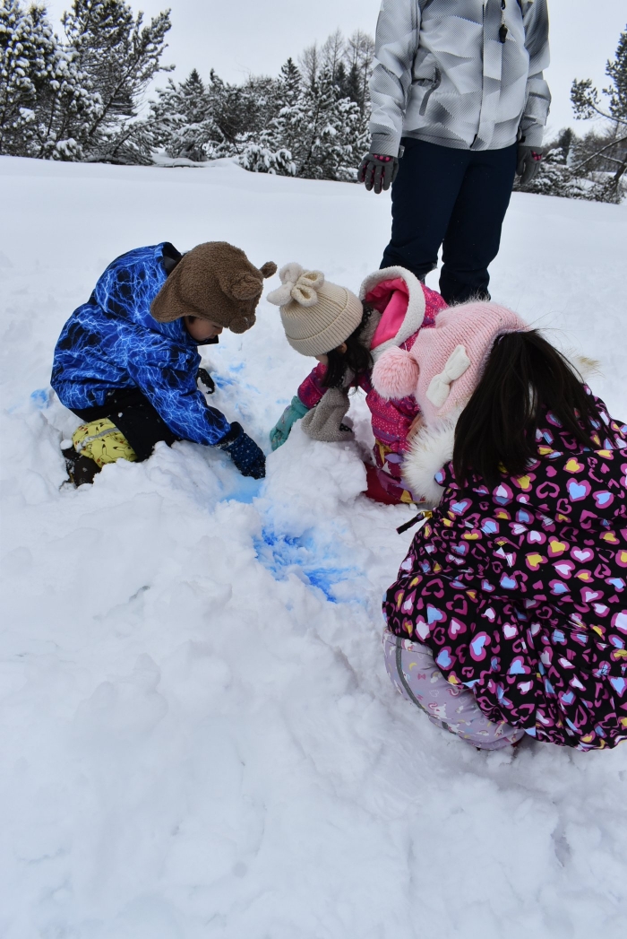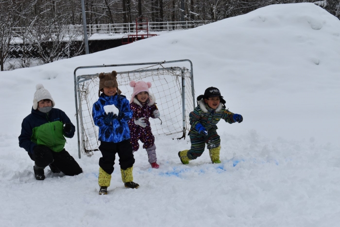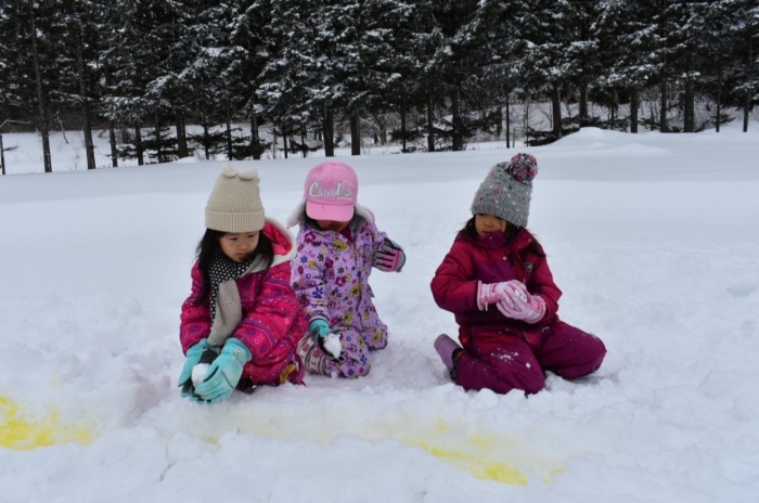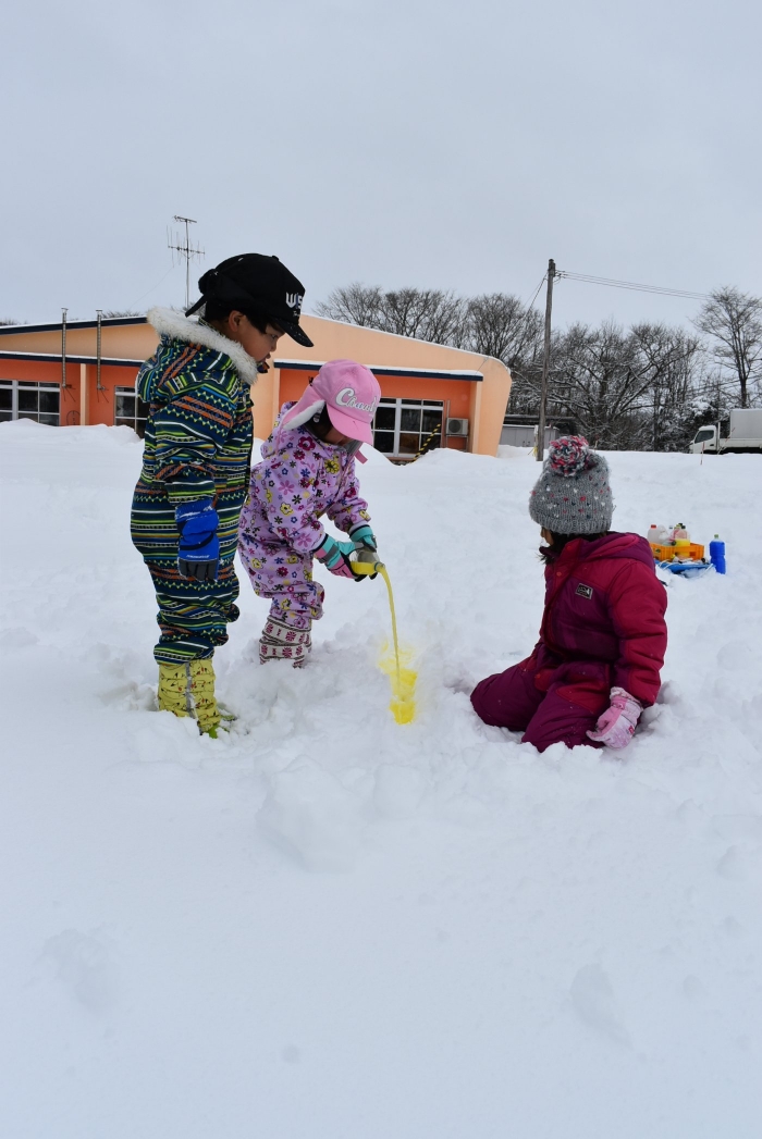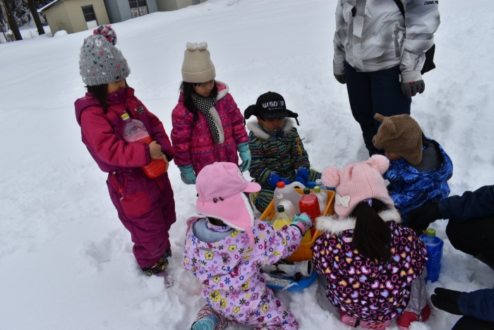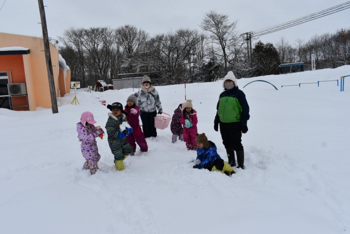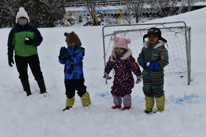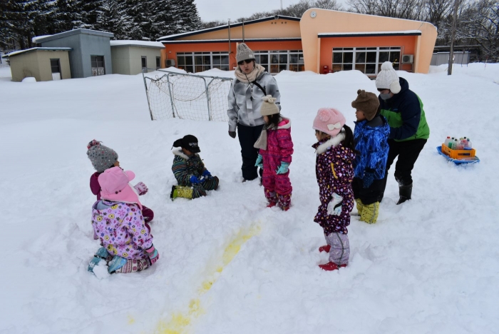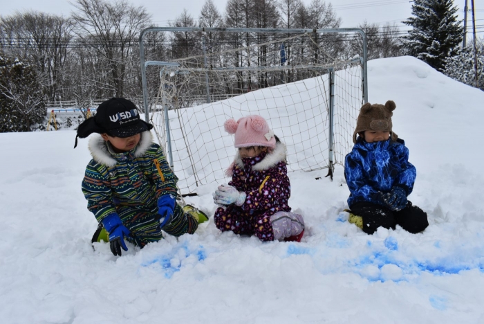以前の体験から,投げ合う範囲を決め色水で線を引いたり,平等にチームを分けたり,予め雪玉を作り並べて置く作戦を立てるなど,年中児を中心に遊びのルールをつくり出していた子ども達です。遊びを楽しむ中で,「今日の雪は固まりやすいな~」雪質の変化にも気づく姿もありました。雪玉を作りやすい,程よい重みで投げやすい飛びやすい,当てたり当たったりして雪合戦の面白さを満喫していました。