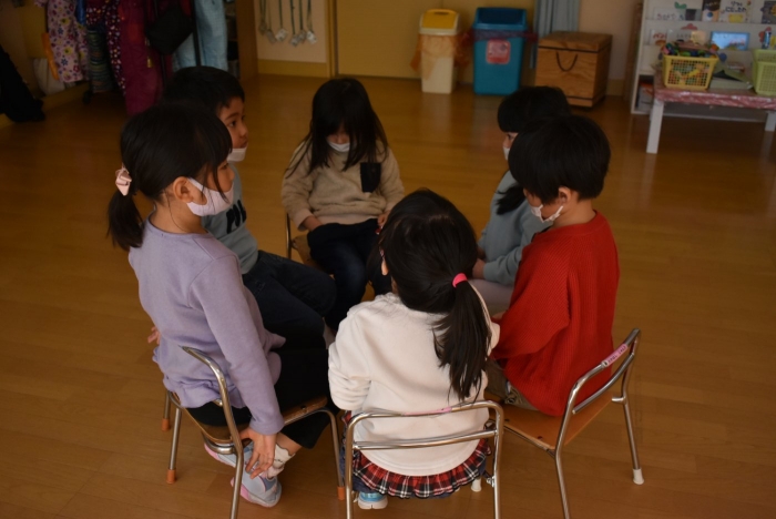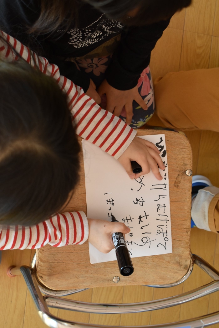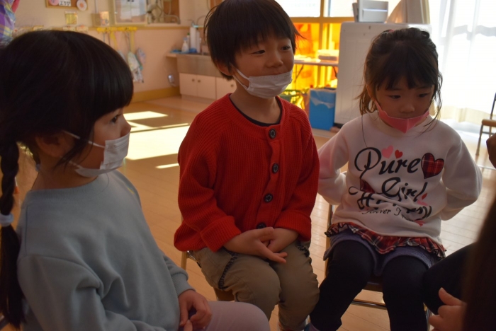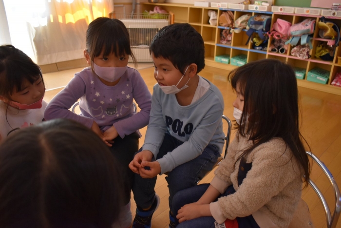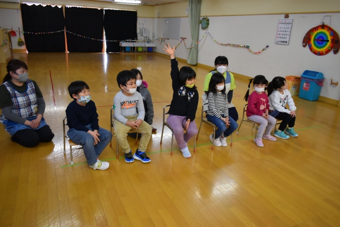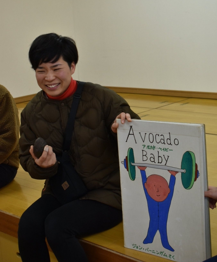 導入に本物のアボカドを見せてもらったり,アボカドを食べてスーパーベイビーに大変身した痛快な話にグイグイ引き込まれていった子ども達。終わった後には,アボカドを食べてみたい!という気持ちになり,目の前にいるお母さんに「アボカド買ってください」とお願いをする子もいました。