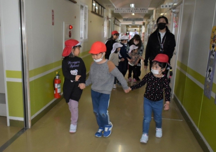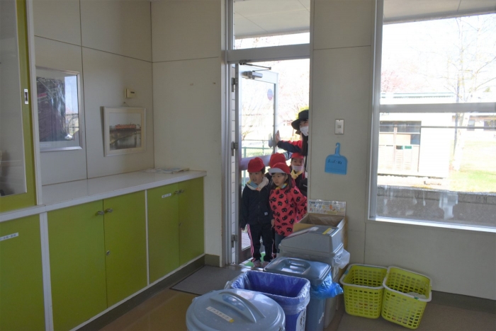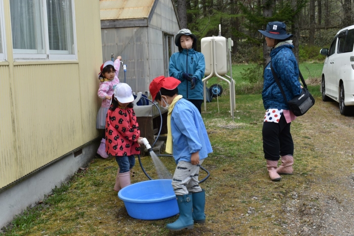 興味津々で年長児の様子を見に来ていた年少・年中児の姿も。再来週には,全園児でイモ植え体験をする予定です。