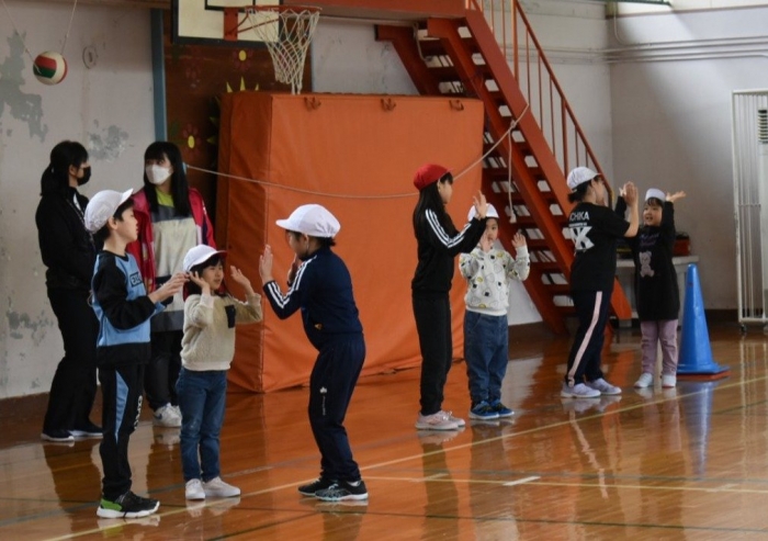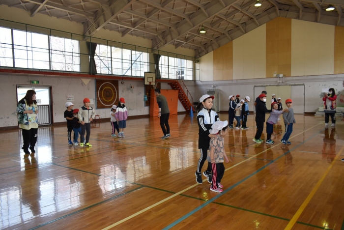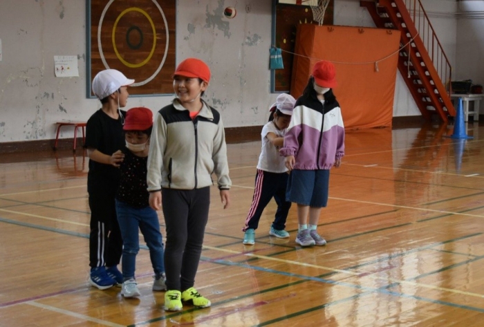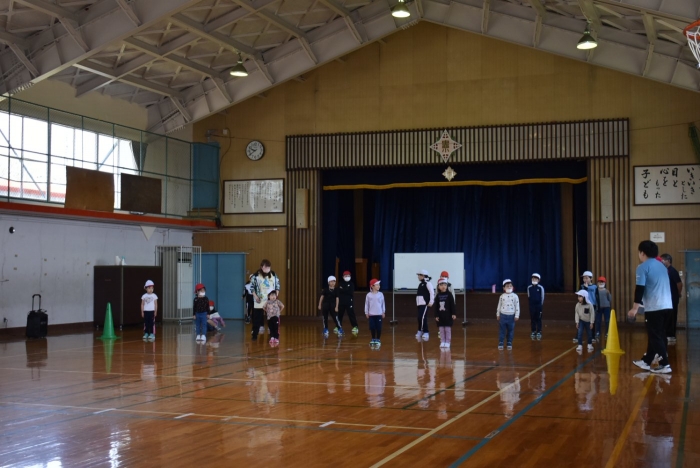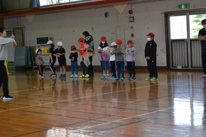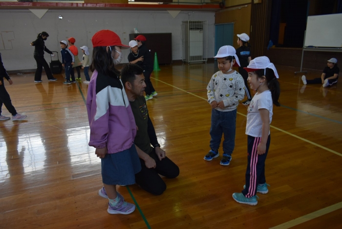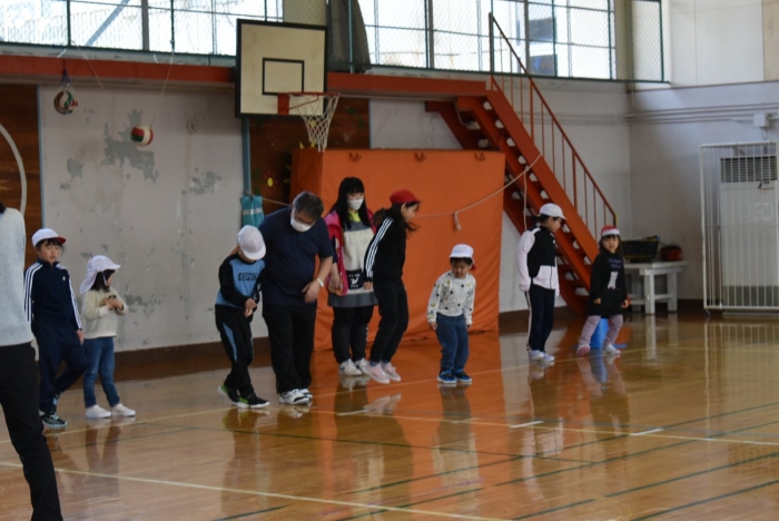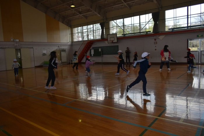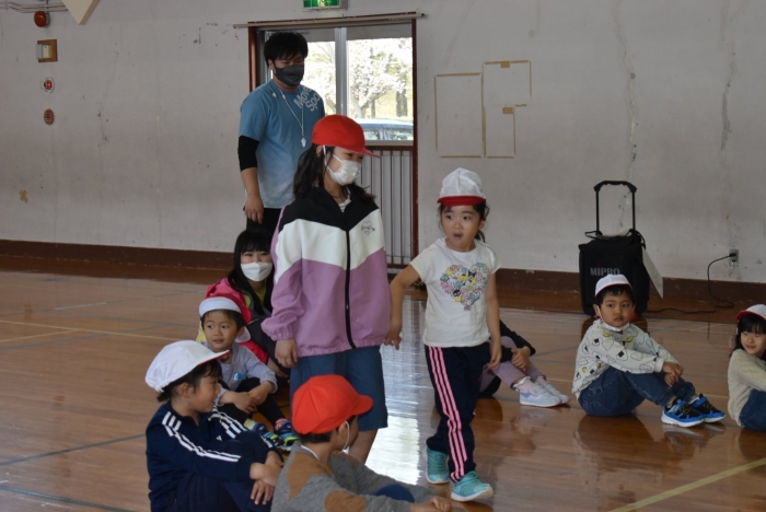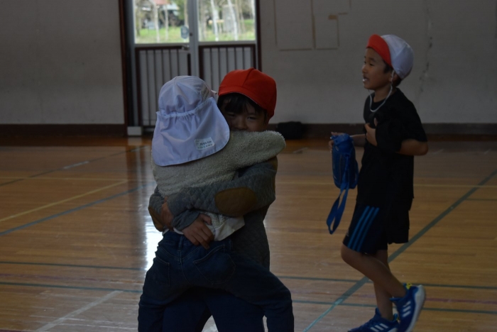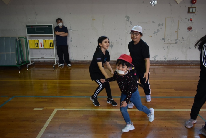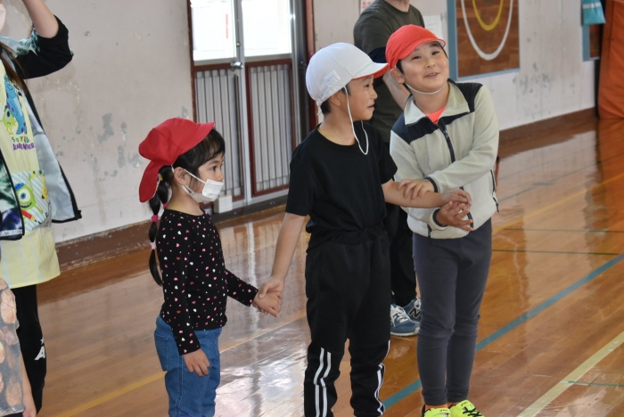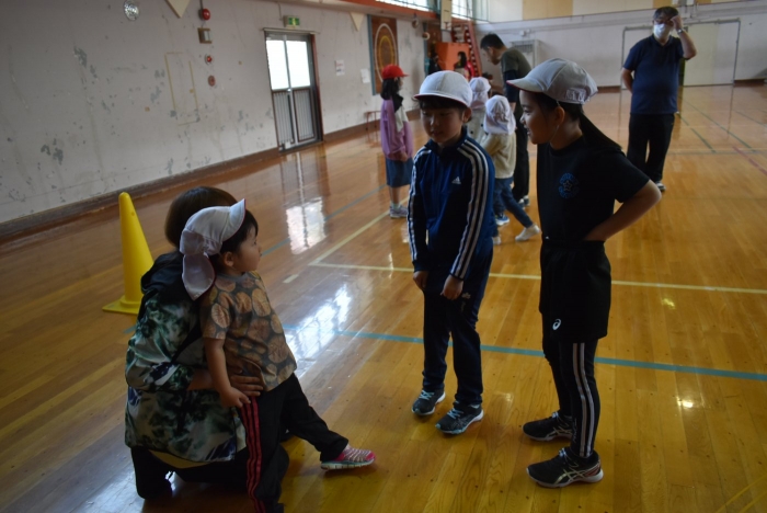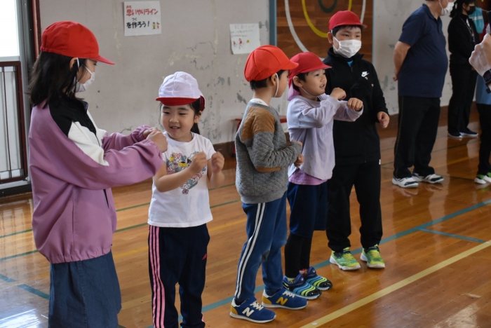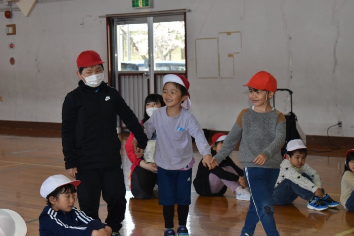 初めは緊張気味だった子も,園児の目線に合わせ,優しく楽しく接してくれる小学生や先生方のおかげで,終わる頃にはすっかり心がほぐれたようです。フォークダンスの後には,園児が楽しめるような遊びを提案してくれ,一緒にのびのび遊びました。