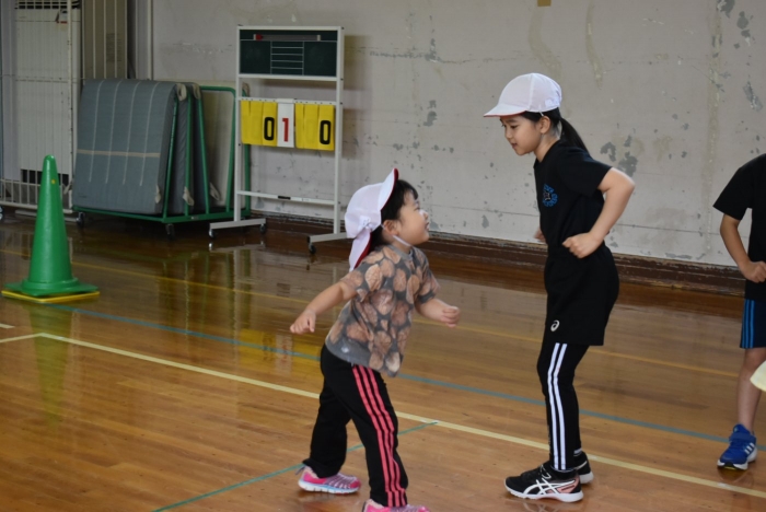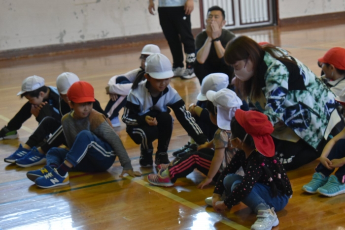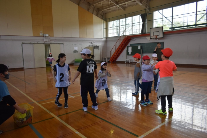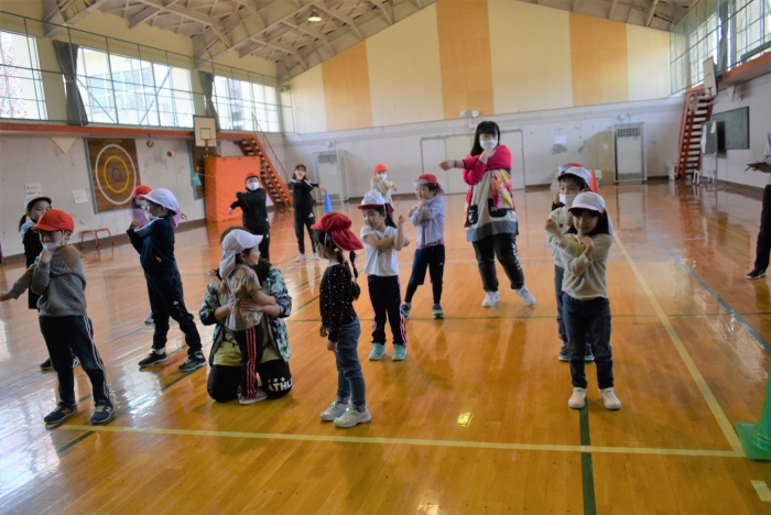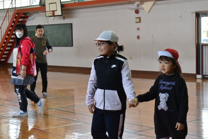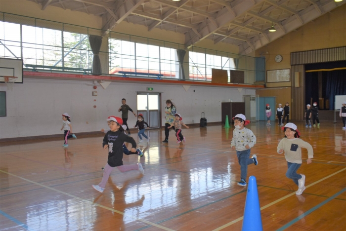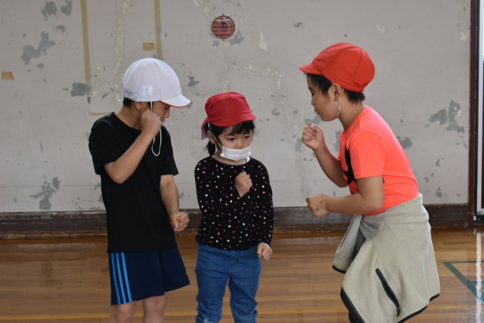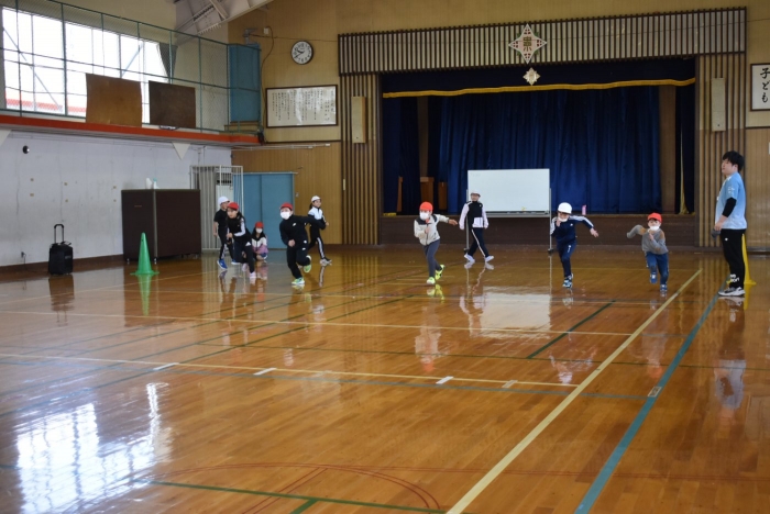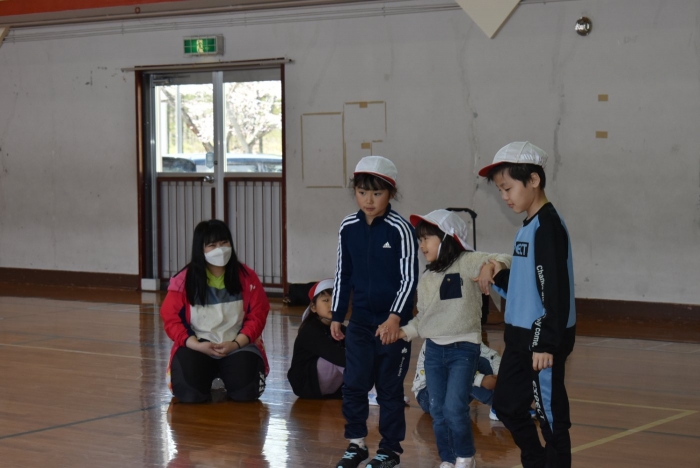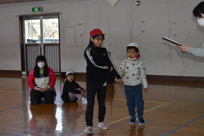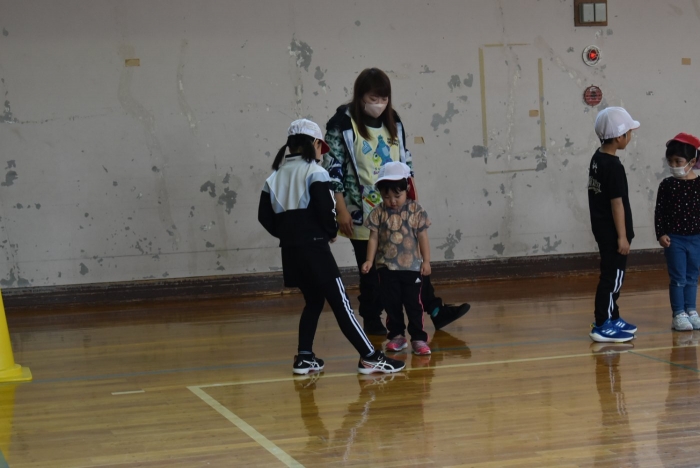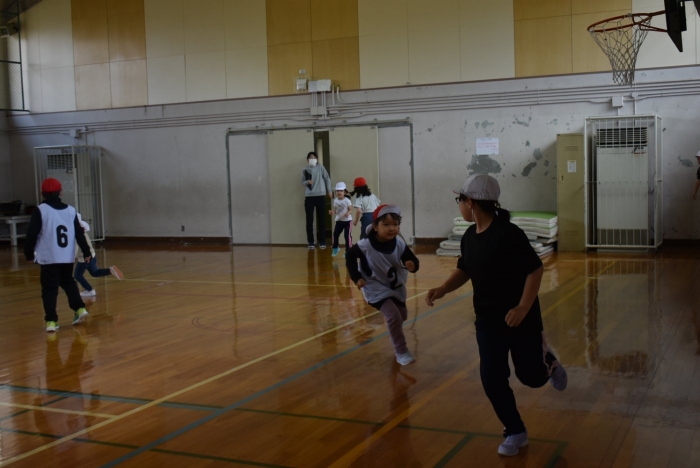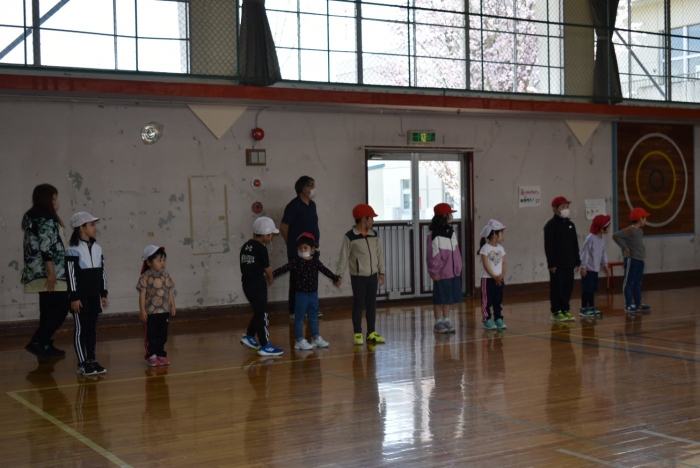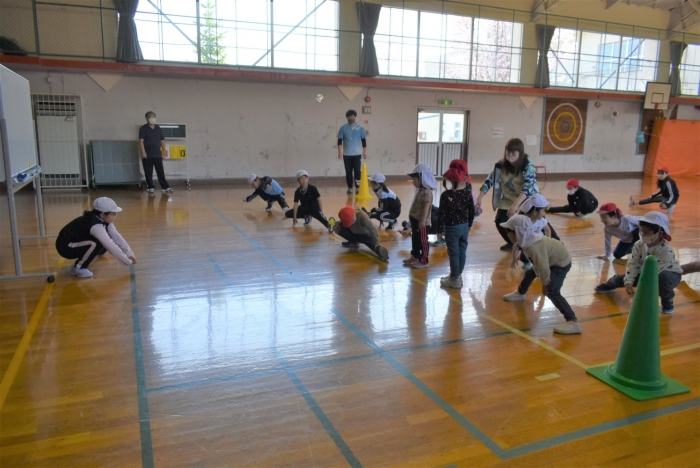初めは緊張気味だった子も,園児の目線に合わせ,優しく楽しく接してくれる小学生や先生方のおかげで,終わる頃にはすっかり心がほぐれたようです。フォークダンスの後には,園児が楽しめるような遊びを提案してくれ,一緒にのびのび遊びました。