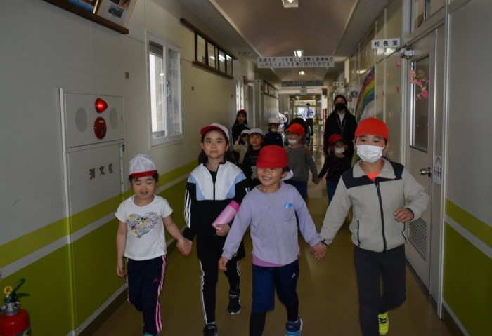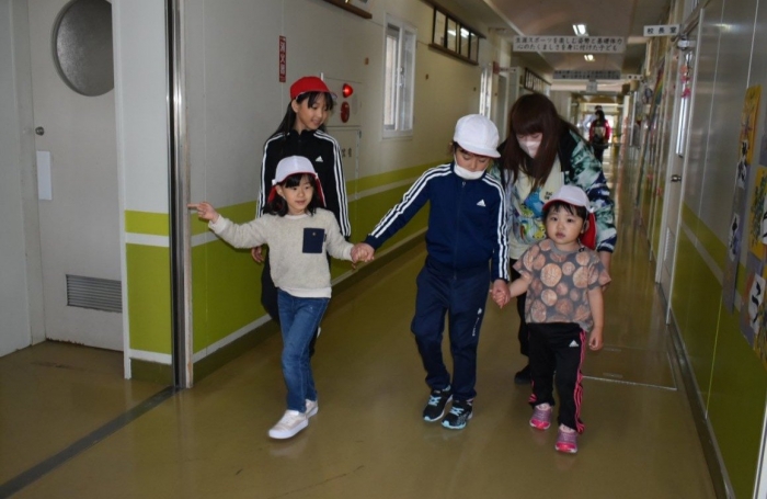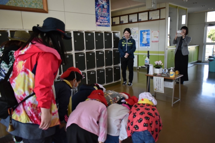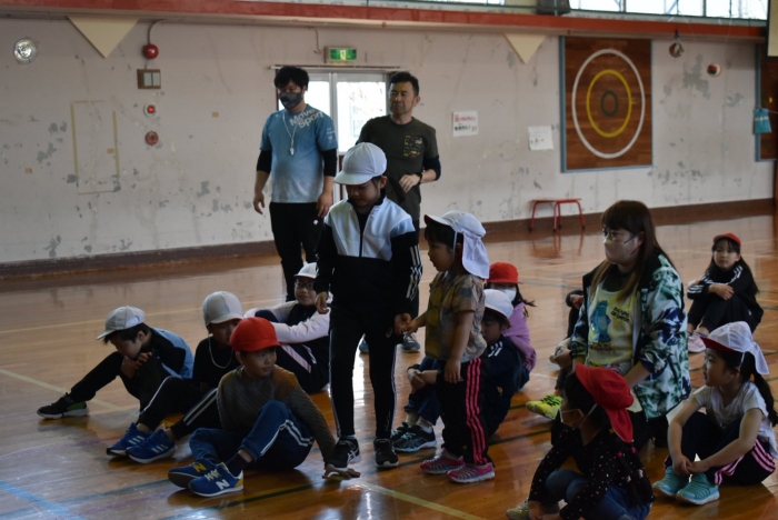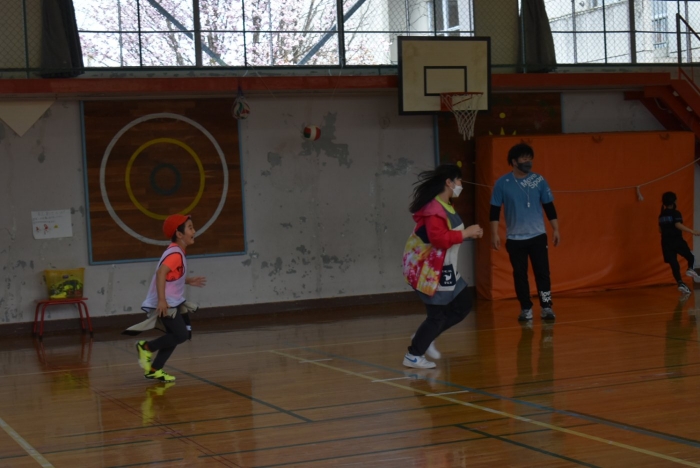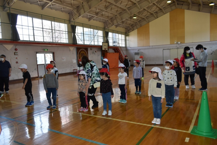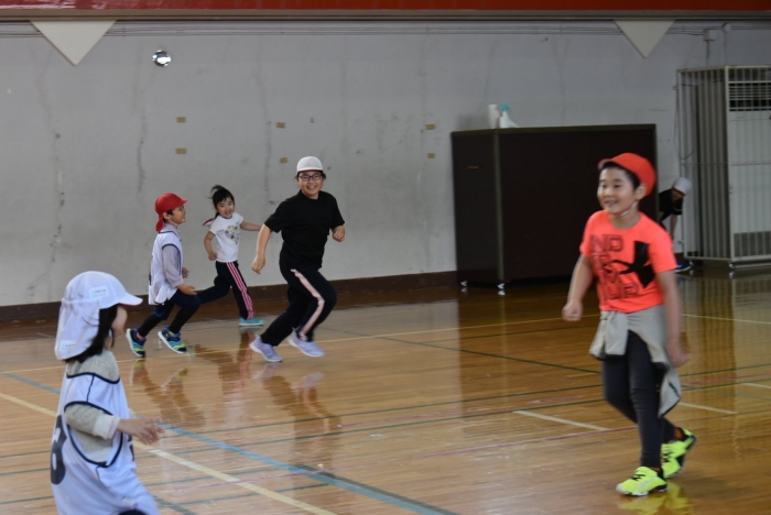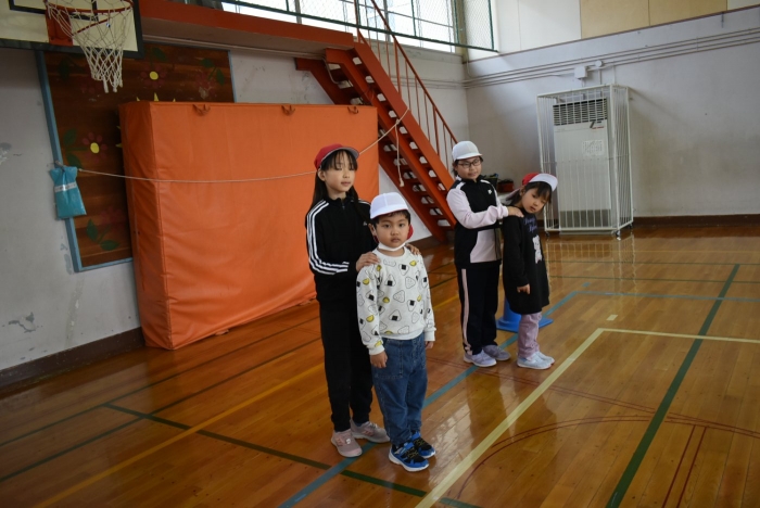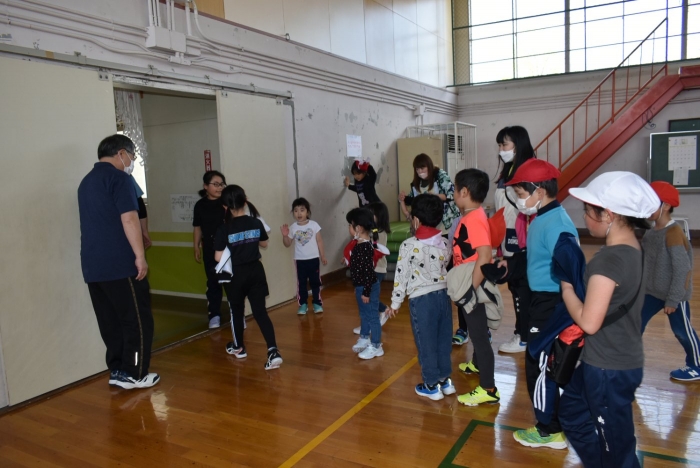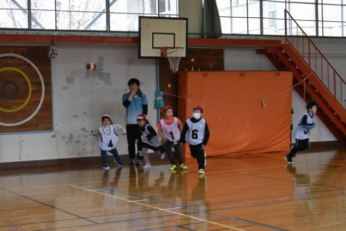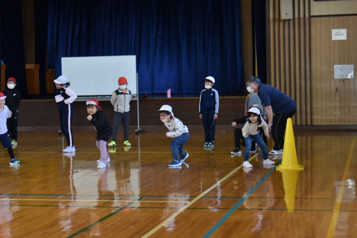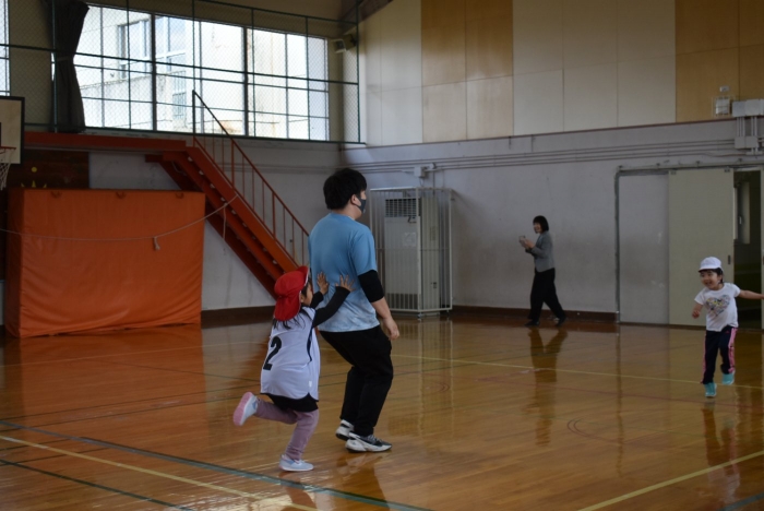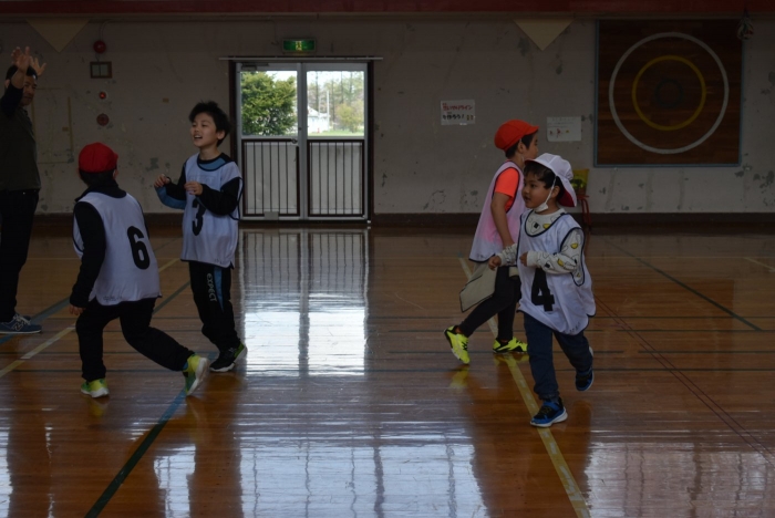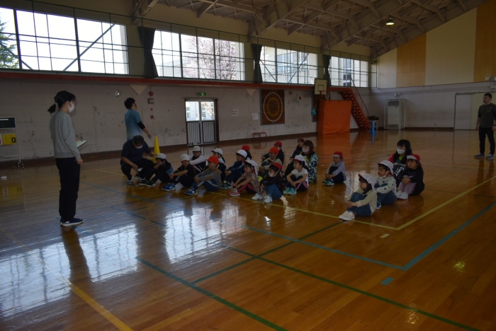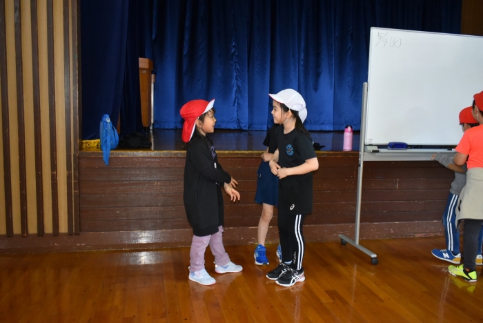 初めは緊張気味だった子も,園児の目線に合わせ,優しく楽しく接してくれる小学生や先生方のおかげで,終わる頃にはすっかり心がほぐれたようです。フォークダンスの後には,園児が楽しめるような遊びを提案してくれ,一緒にのびのび遊びました。