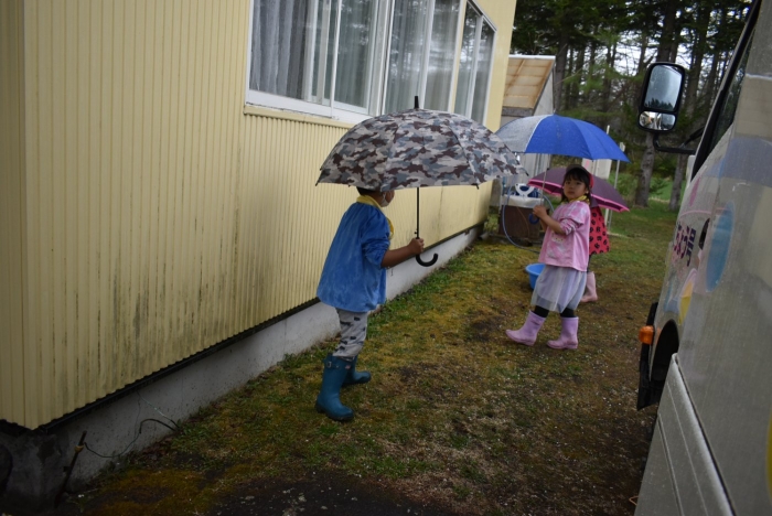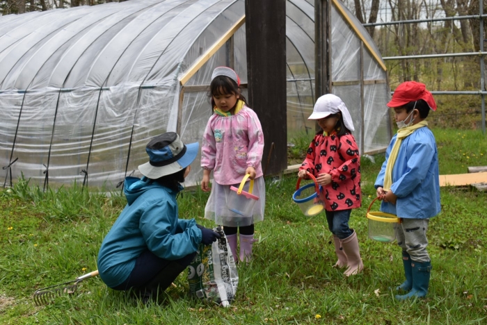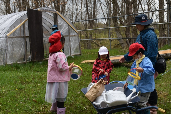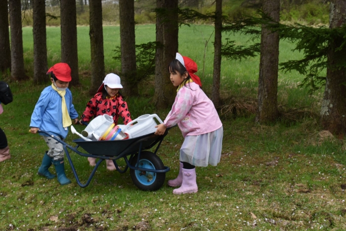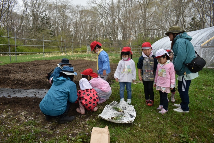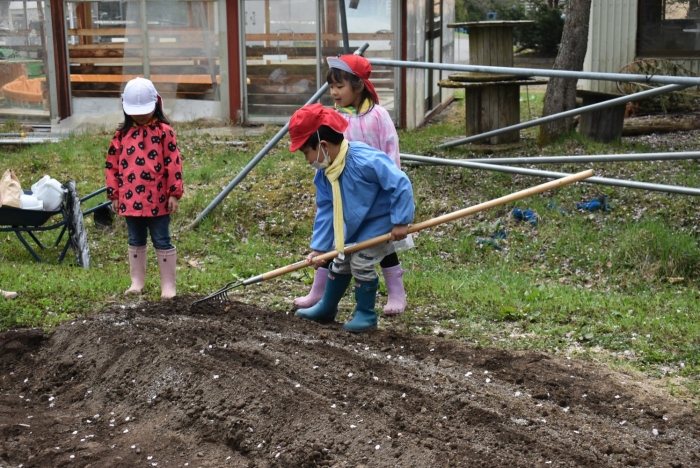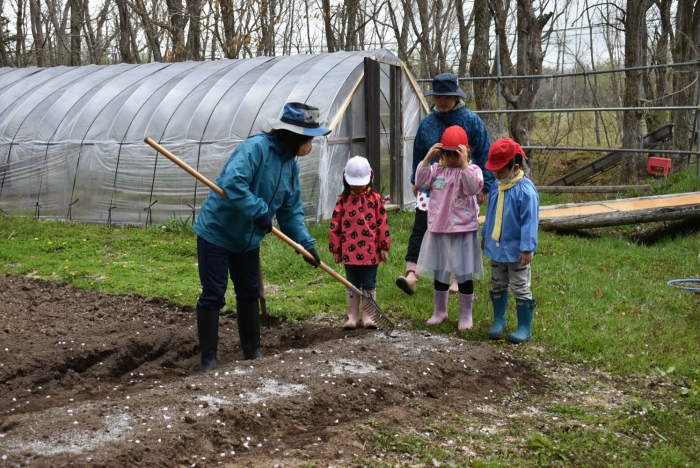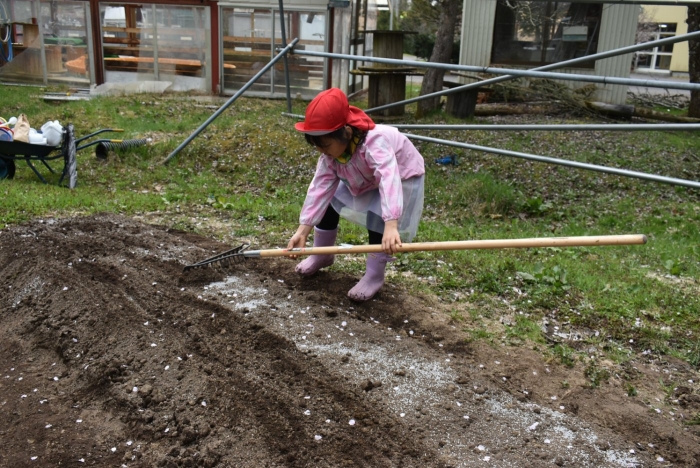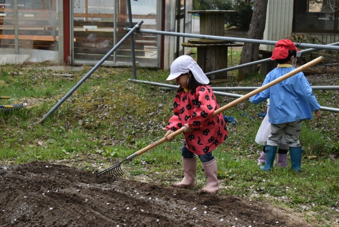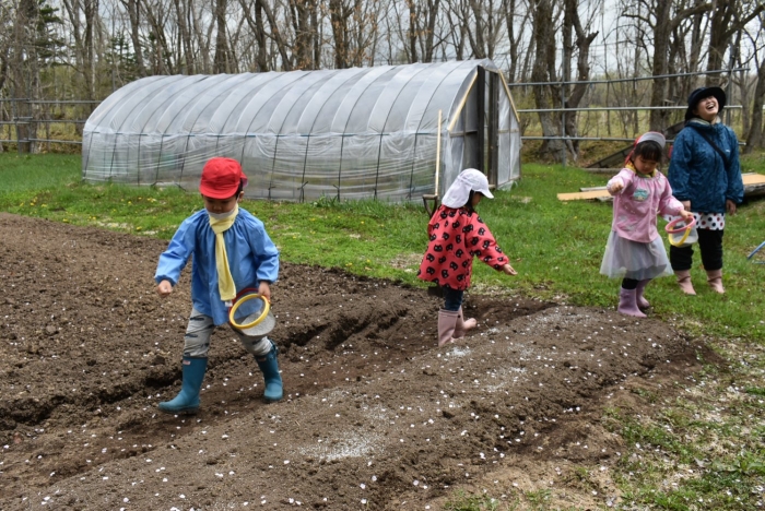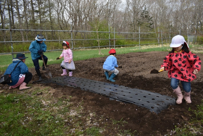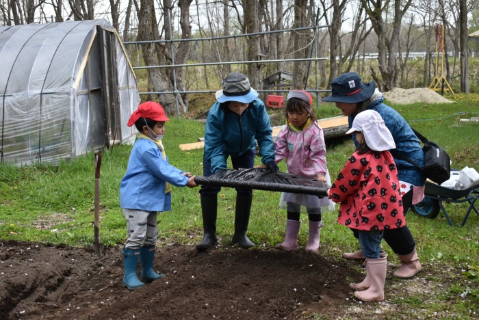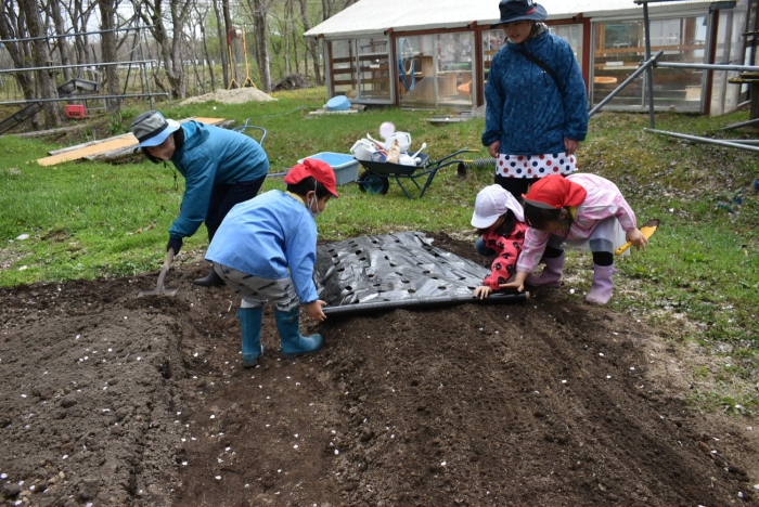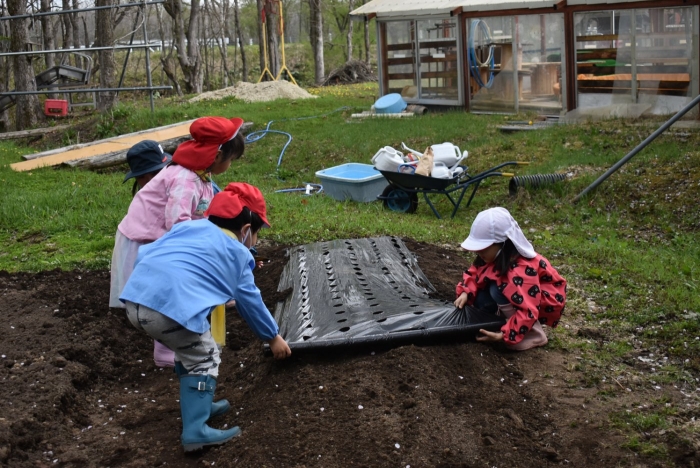 年長組で,畑作り第一弾! タマネギの苗植えを行いました。必要な道具の準備・運搬,肥料撒き,土ならし,マルチ敷き,苗植えと,一連の作業を体験! 途中,雨が降るハプニングもありましたが,そんな事態も楽しみながら手際よく苗植えを行った年長児。昨年度の経験がしっかりと生きていました。