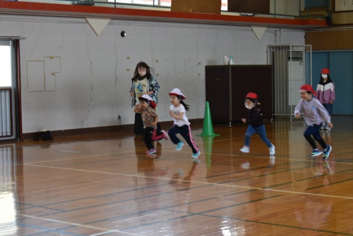 今年度の運動会では,フォークダンスの他,幼稚園・小学校と一緒に行う競技(リレー,玉入れ)や活動(プログラム表紙絵,スローガン彩色)を多く取り入れることになりました。この交流の機会を有意義に活用し,学校という環境や関わりのある人に親しみがもてるような援助をしていきたいと思います。