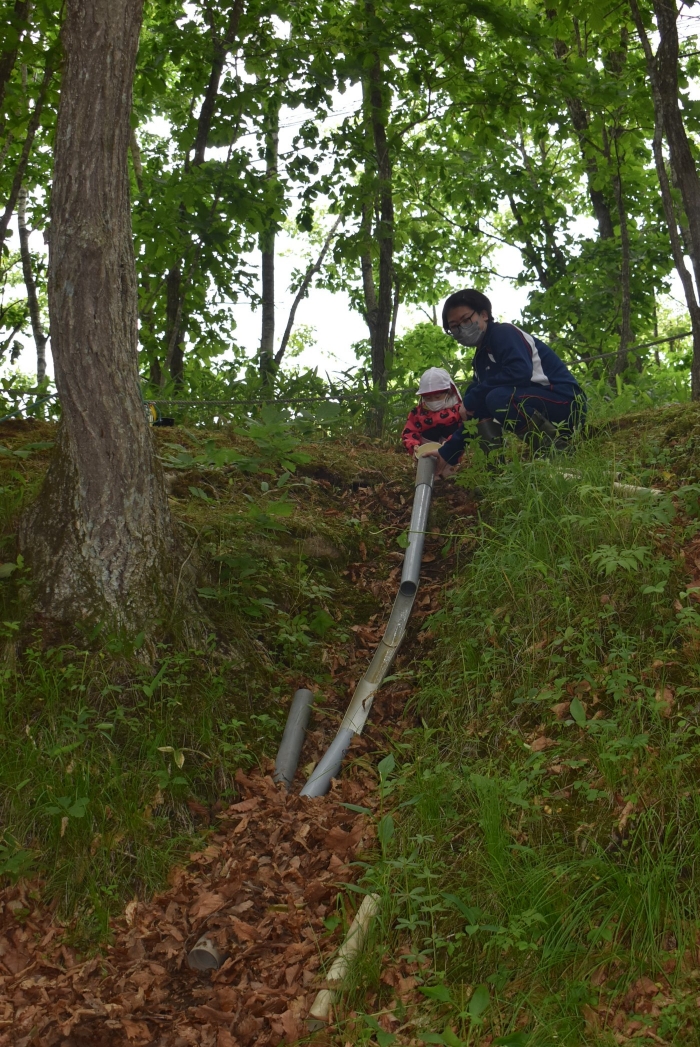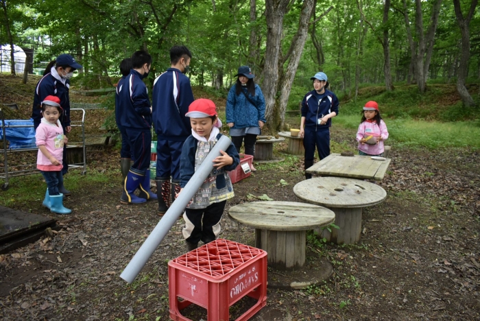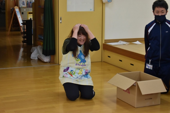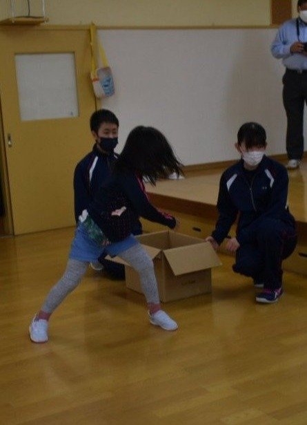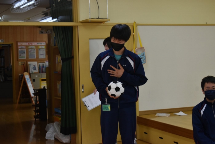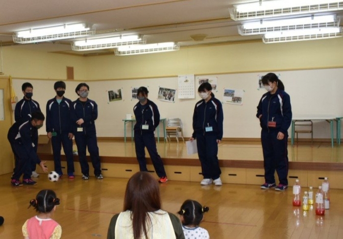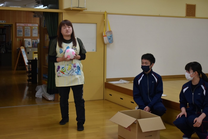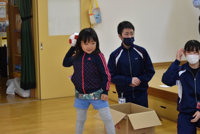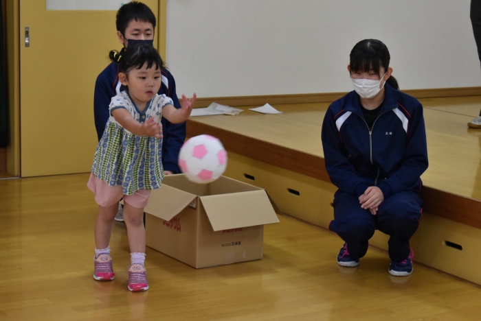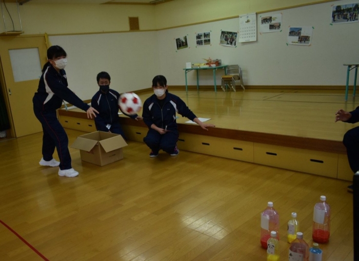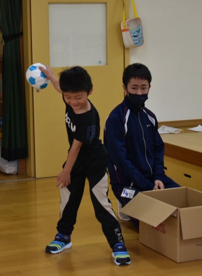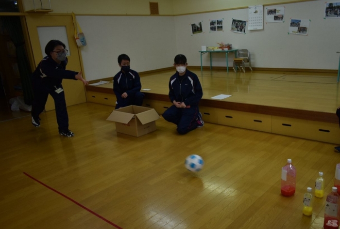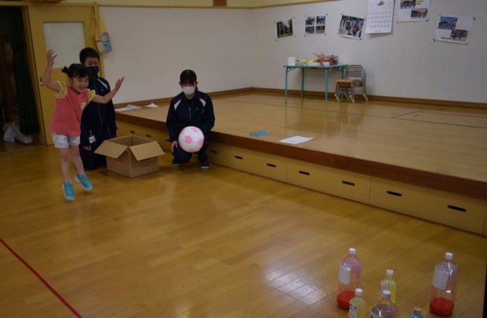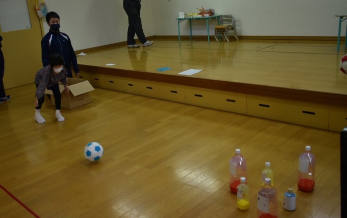 中学生が考案してくれたゲームは『わくわくボーリング』! 中学生お手製のサッカーボールを使い,中学生との混合チーム戦で競い合いました。ピンに当たると拍手喝采を受け嬉しさを感じたり,投げる前には『呼吸』が大事とアドバイスをする年中児まで現れ,大盛り上がりのボーリングでした。