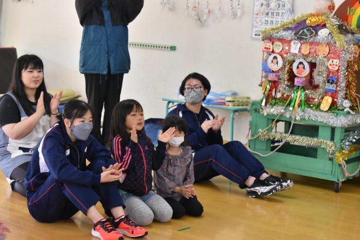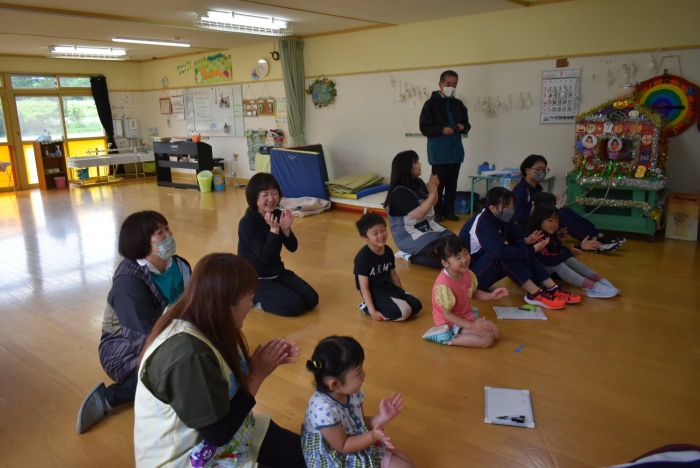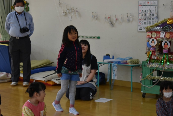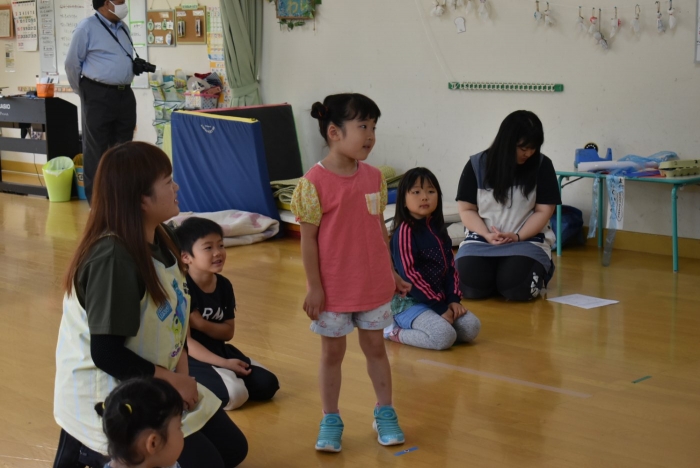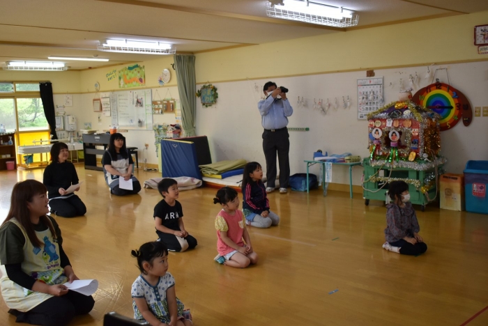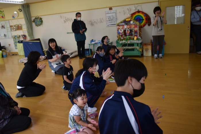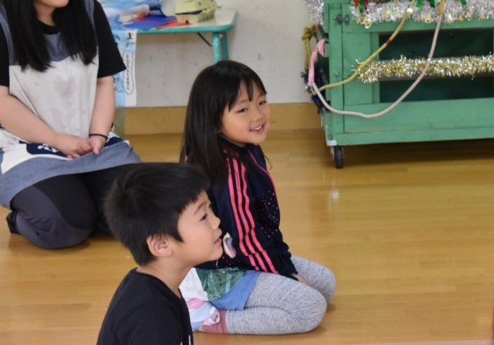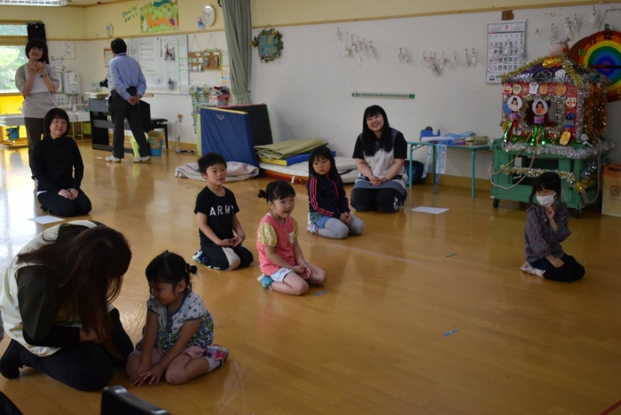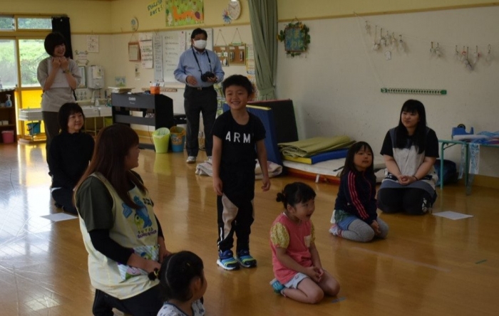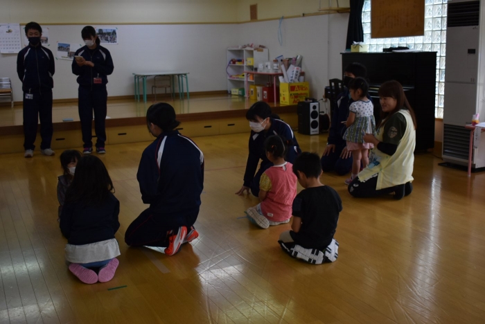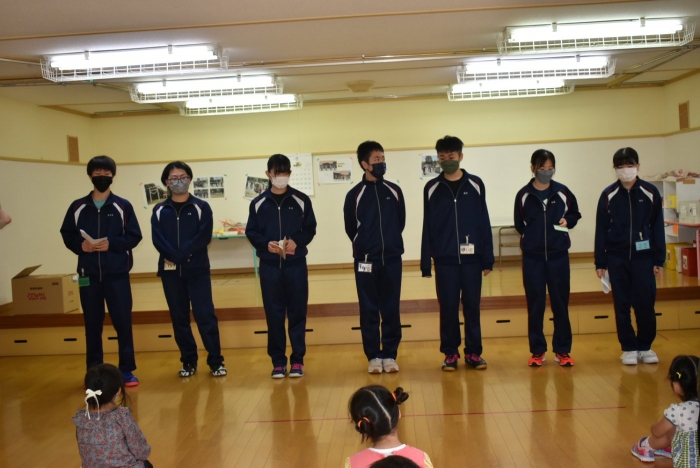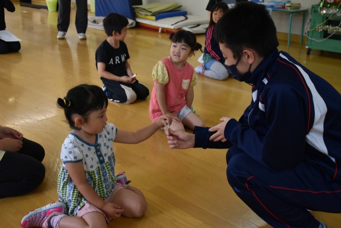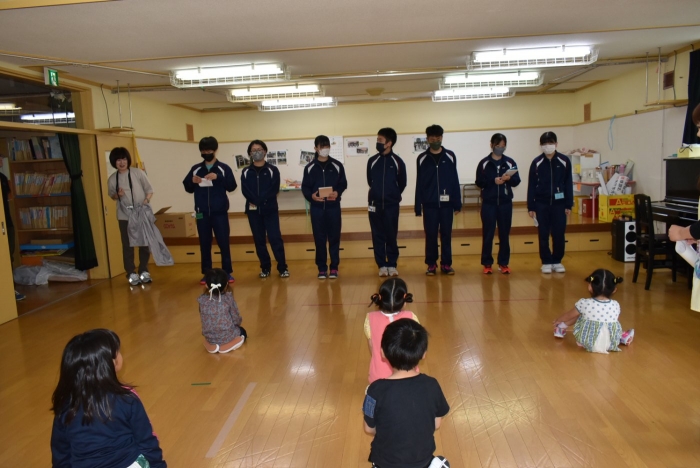 来園を心待ちにし,率先して挨拶をする園児たち。中学生の進行による『始まりの集会』では,中学生の自己紹介に引き続き,園児からも自己紹介(名前&好きな食物)をしてほしいと促されると,緊張しながらも堂々と発言する年長児。はにかみながらも自己紹介をする年中児。緊張のあまり中学生の顔を見れなくなった年少児。自分たちも,こんな時があったな…と,微笑ましく見守ってくれていた中学生です。