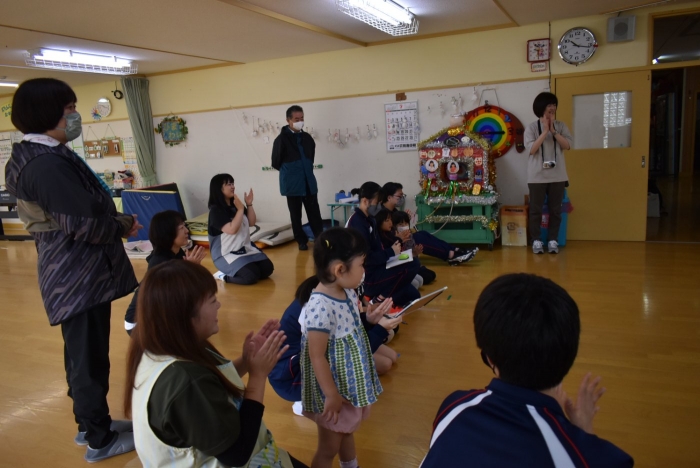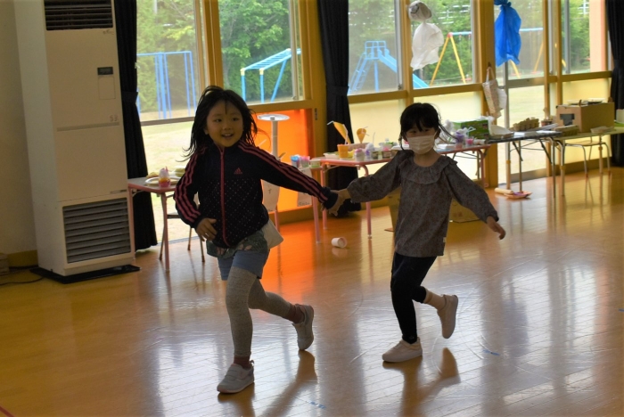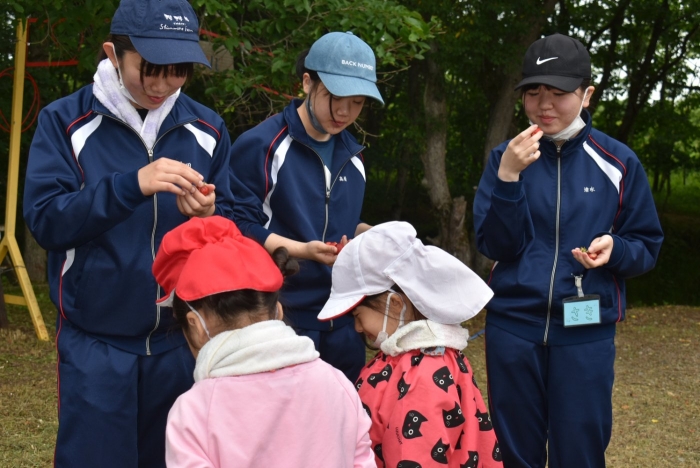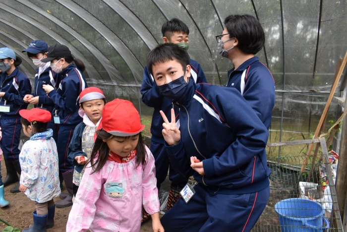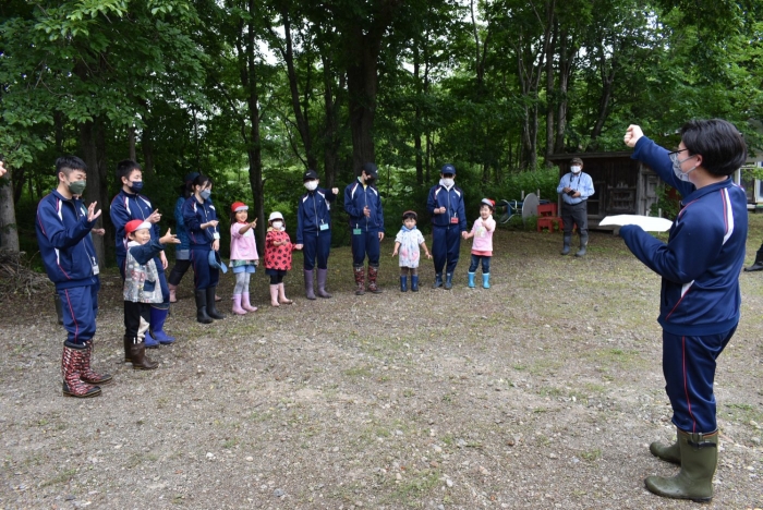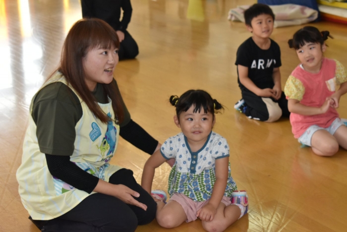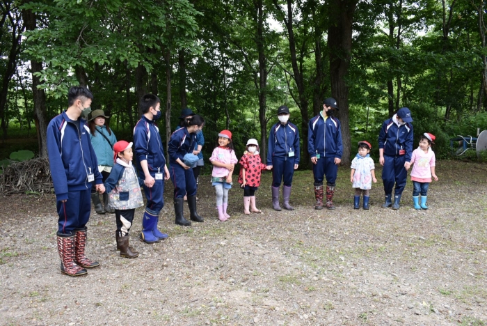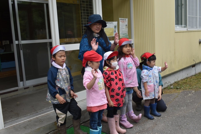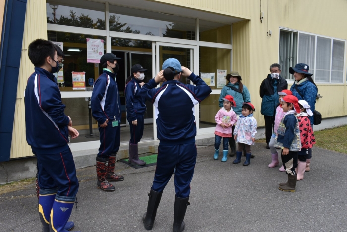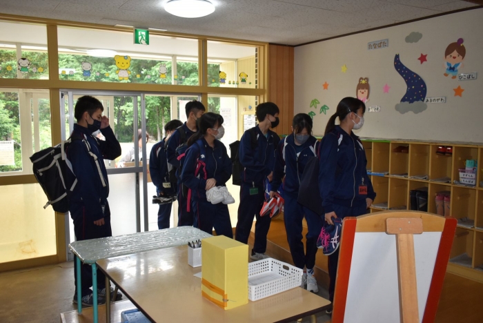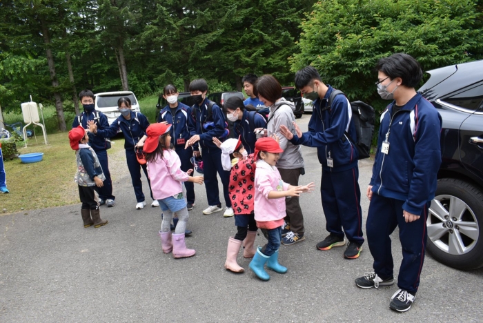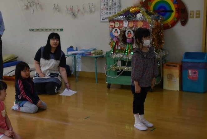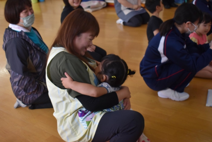 来園を心待ちにし,率先して挨拶をする園児たち。中学生の進行による『始まりの集会』では,中学生の自己紹介に引き続き,園児からも自己紹介(名前&好きな食物)をしてほしいと促されると,緊張しながらも堂々と発言する年長児。はにかみながらも自己紹介をする年中児。緊張のあまり中学生の顔を見れなくなった年少児。自分たちも,こんな時があったな…と,微笑ましく見守ってくれていた中学生です。