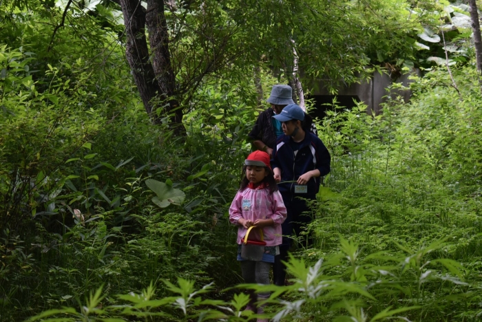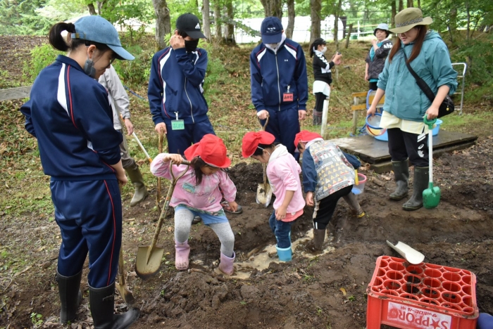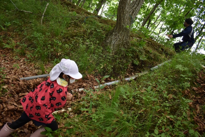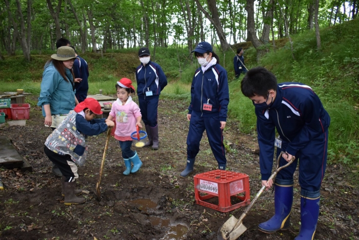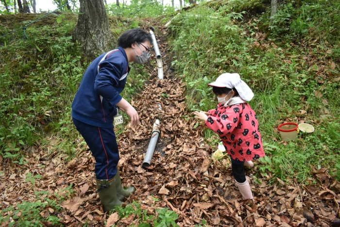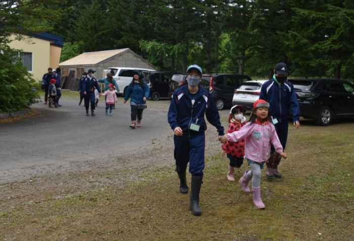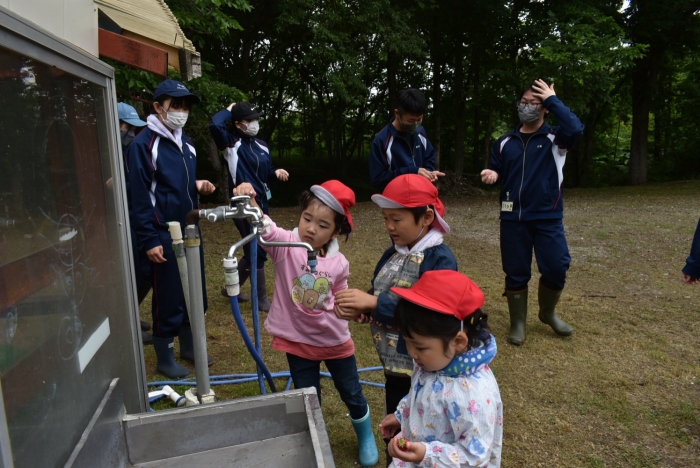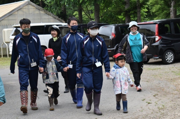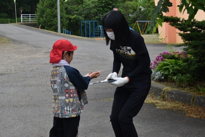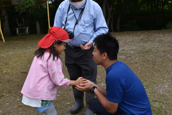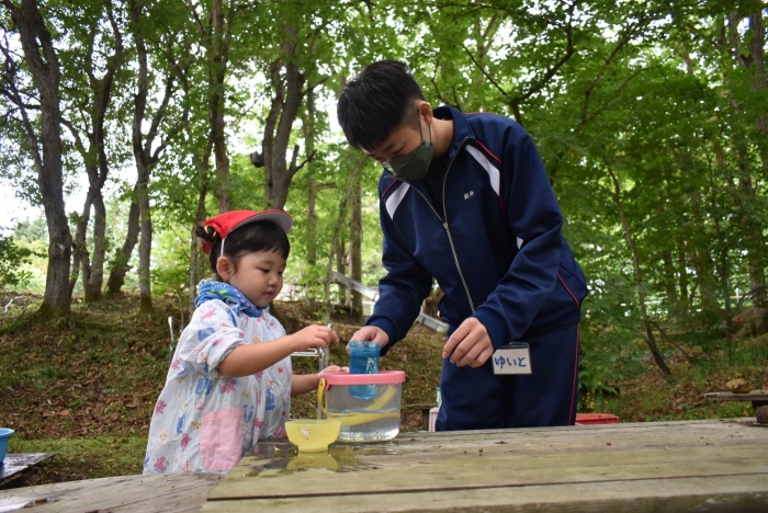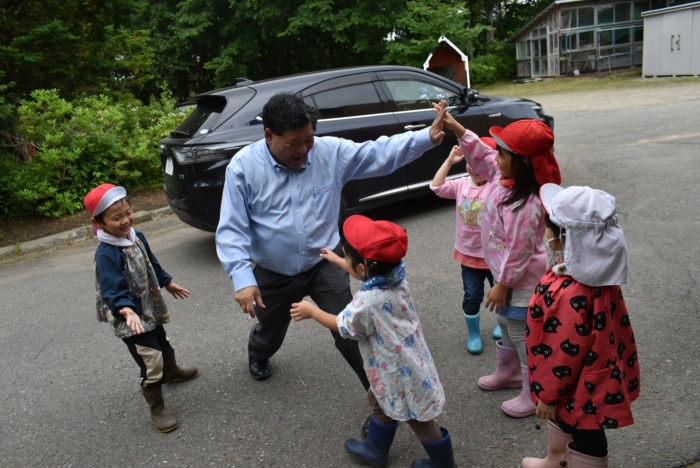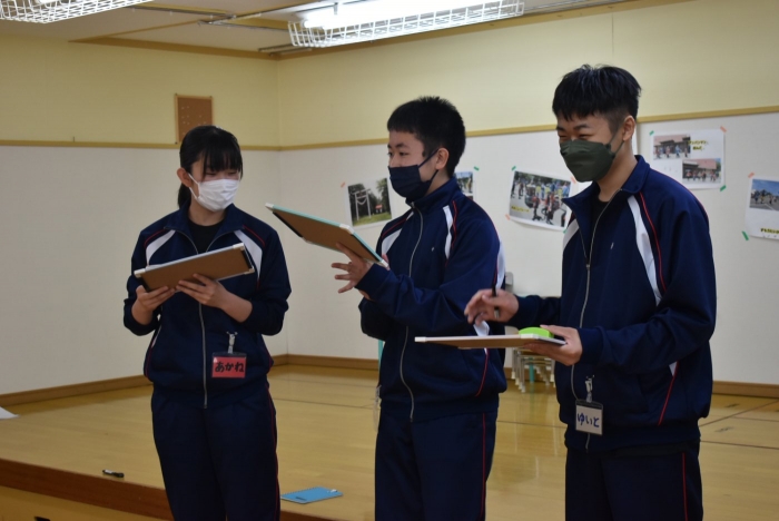 来園を心待ちにし,率先して挨拶をする園児たち。中学生の進行による『始まりの集会』では,中学生の自己紹介に引き続き,園児からも自己紹介(名前&好きな食物)をしてほしいと促されると,緊張しながらも堂々と発言する年長児。はにかみながらも自己紹介をする年中児。緊張のあまり中学生の顔を見れなくなった年少児。自分たちも,こんな時があったな…と,微笑ましく見守ってくれていた中学生です。