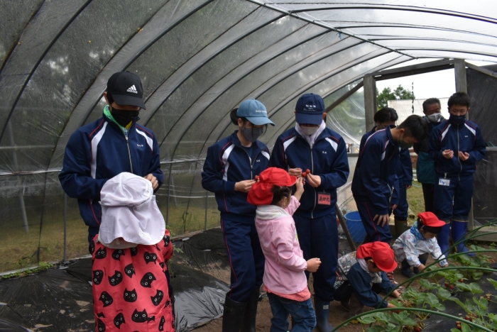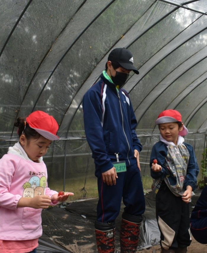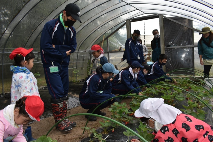 その後は,ハウスまで案内をしてイチゴ狩りを楽しんだり,わくわくジャングルで楽しんでいる遊びに中学生を誘ったり,触れ合うごとに心もほぐれ笑顔があふれていた子ども達です。別れの時には,恒例の園児によるエンドレスバイバイにもお付き合いいただき有難うございます。今度は,園児が中学校で行われるスポーツフェスティバルへ行く予定です。そこでの再会を楽しみにしている子ども達です。