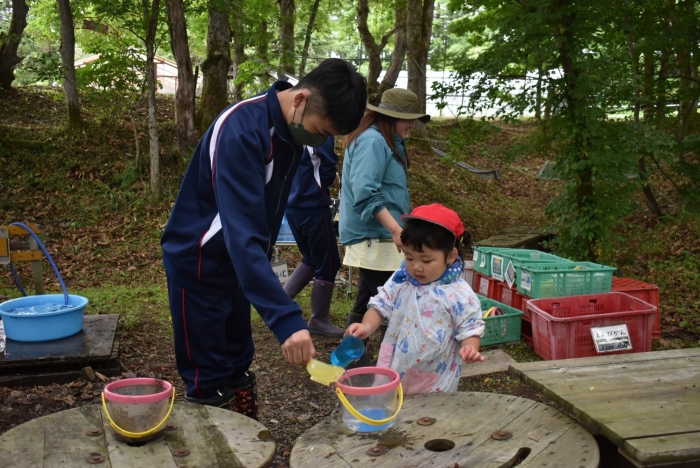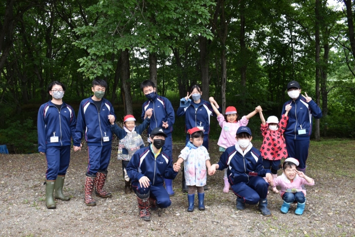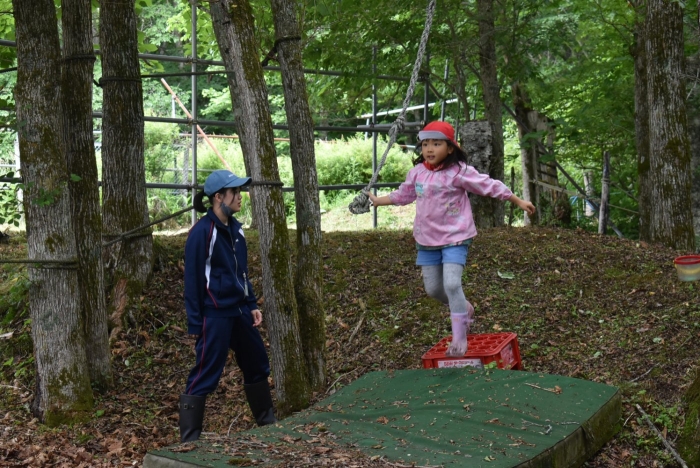 7/4(火)家庭科学習の一環『幼稚園実習』で,中学校3年生が来園しました。自己紹介をしたり中学生が考案したゲームをしたり,中学生にとっては懐かしのわくわくジャングルでの遊びで交流を図りました。