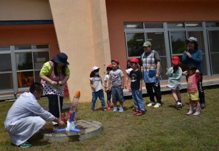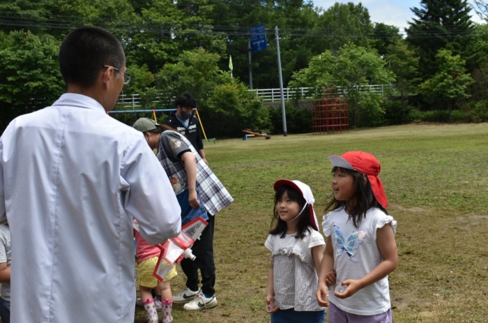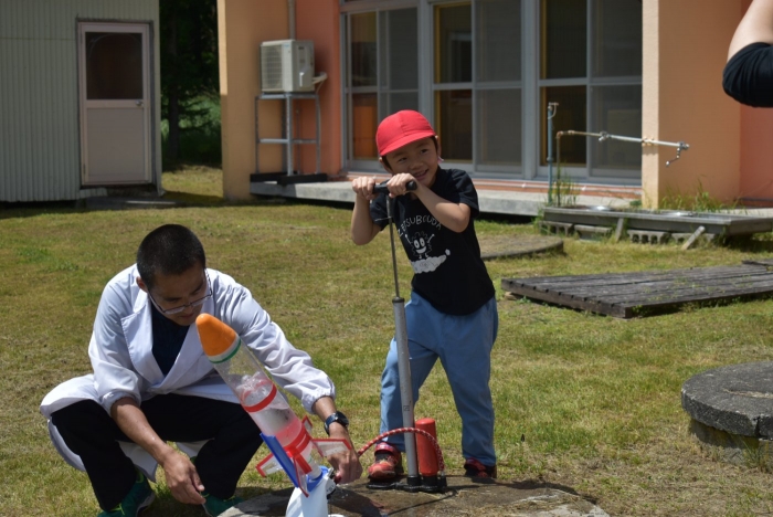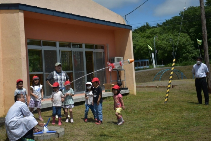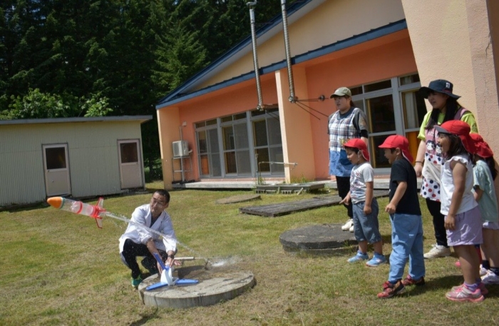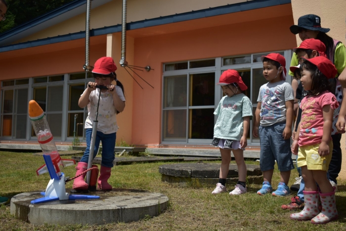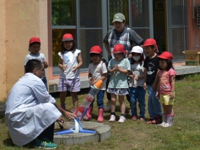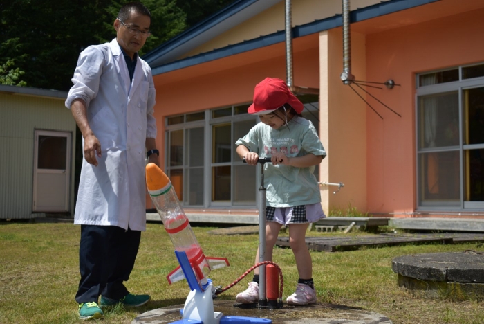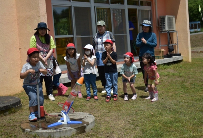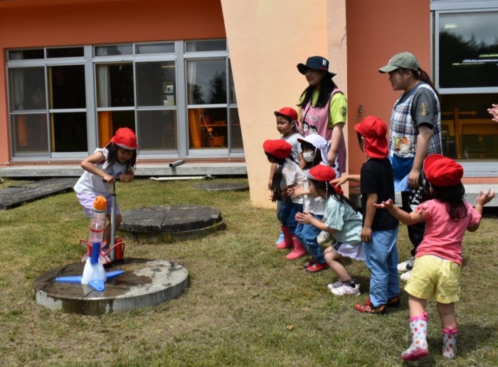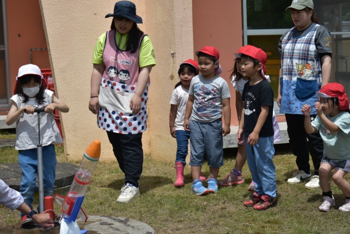 理科の出前授業で3年間お世話になっているF先生。今年は,どんな楽しいことが待っているのか期待を膨らませている様子がありました。1年目は『静電気』,2年目『空気砲』,そして今年は 『ロケット』! クエン酸&重曹&水,すりおろし野菜&オキシドールの化学反応で飛ばす『フィルムケースロケット』,水&圧縮空気で飛ばす『ペットボトルロケット』の化学実験を体験を行いました。わくわくする導入と仕掛けに,「面白そう!」 「やってみたい!! 」「えーっ,なんで!?」「なかなか飛ばない…今度こそ!」と,目を輝かせながらF先生との関わりや実験を楽しんでいた子ども達。より一層,F先生に親しみを感じている様子でした。