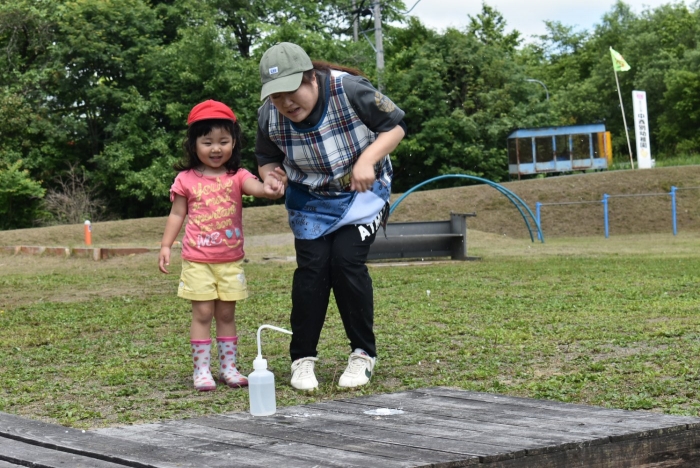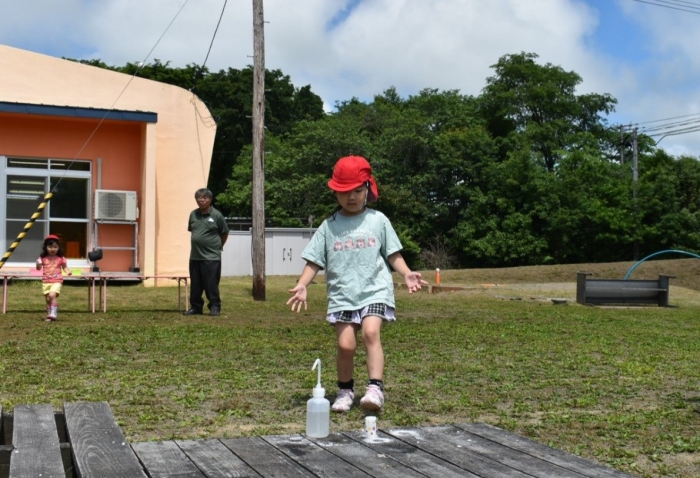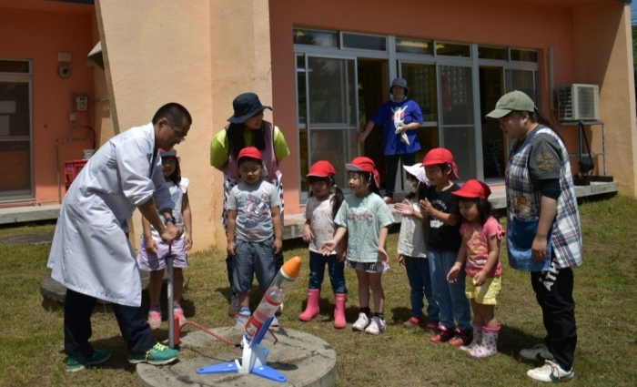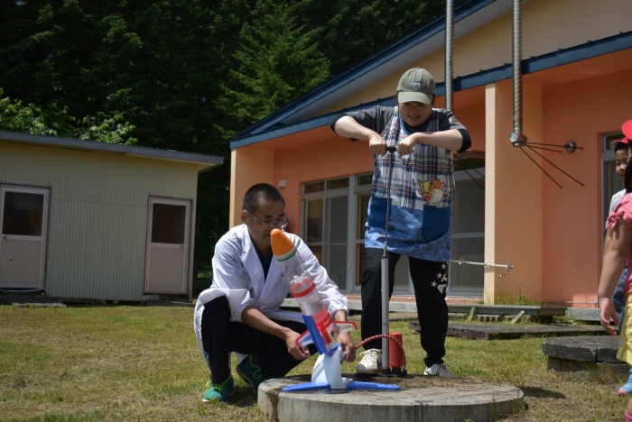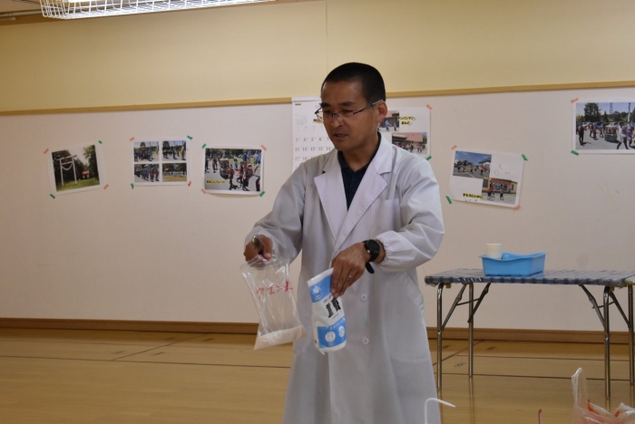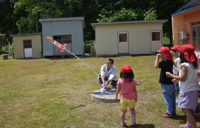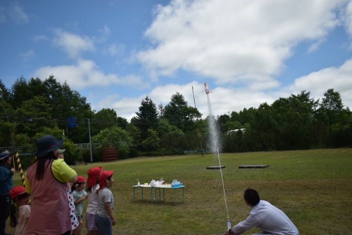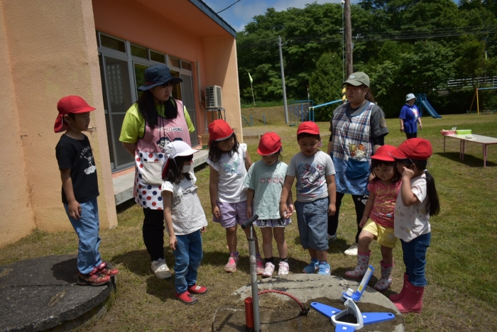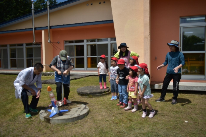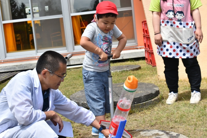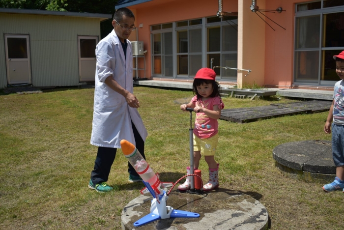 理科の出前授業で3年間お世話になっているF先生。今年は,どんな楽しいことが待っているのか期待を膨らませている様子がありました。1年目は『静電気』,2年目『空気砲』,そして今年は 『ロケット』! クエン酸&重曹&水,すりおろし野菜&オキシドールの化学反応で飛ばす『フィルムケースロケット』,水&圧縮空気で飛ばす『ペットボトルロケット』の化学実験を体験を行いました。わくわくする導入と仕掛けに,「面白そう!」 「やってみたい!! 」「えーっ,なんで!?」「なかなか飛ばない…今度こそ!」と,目を輝かせながらF先生との関わりや実験を楽しんでいた子ども達。より一層,F先生に親しみを感じている様子でした。