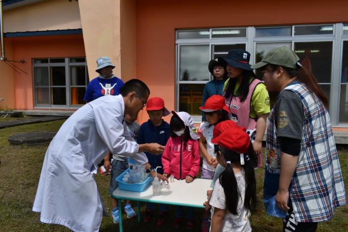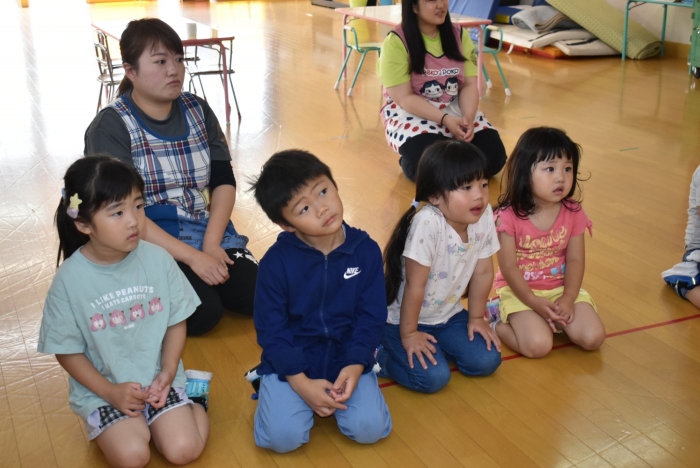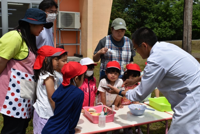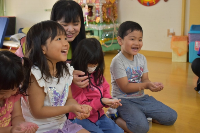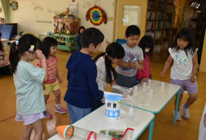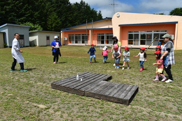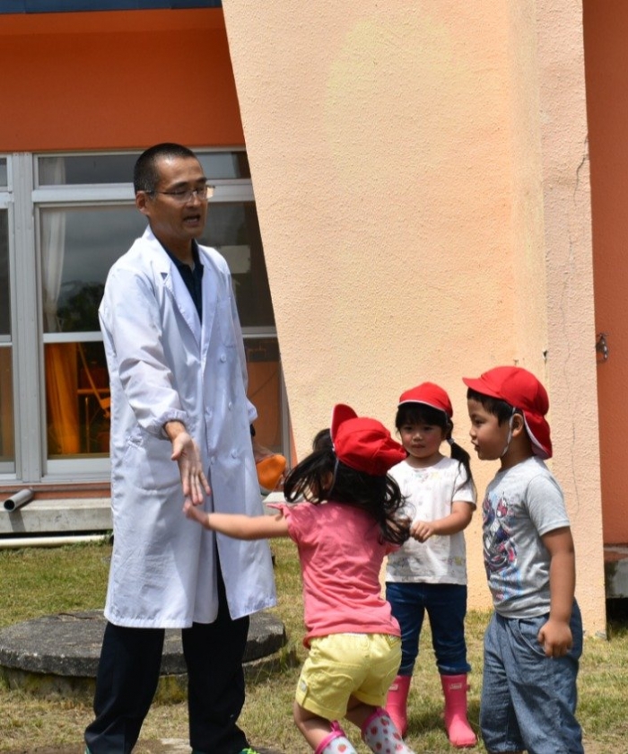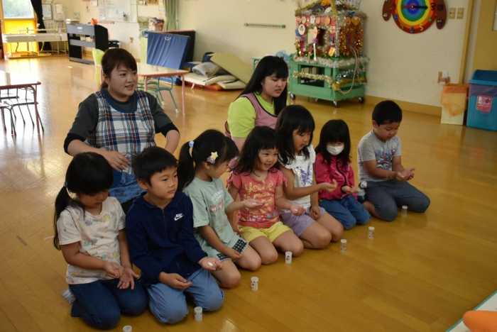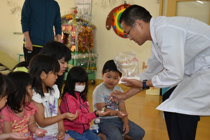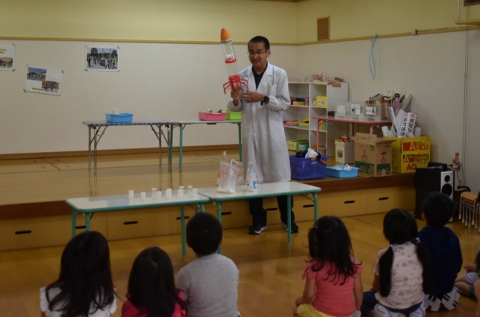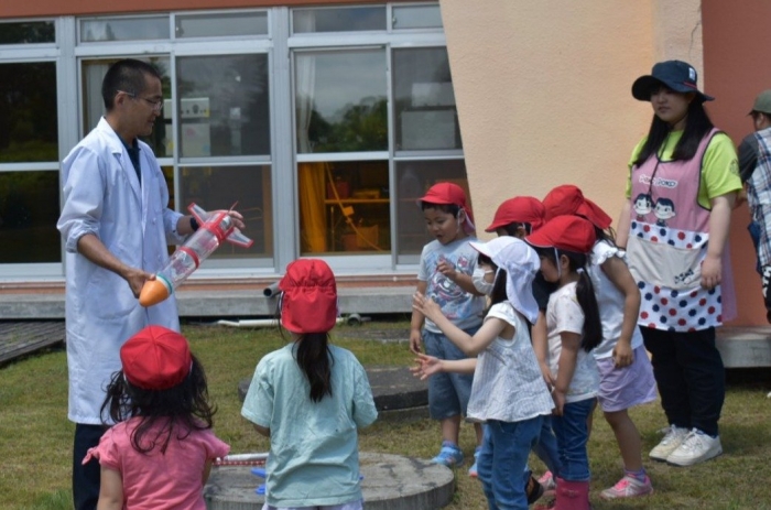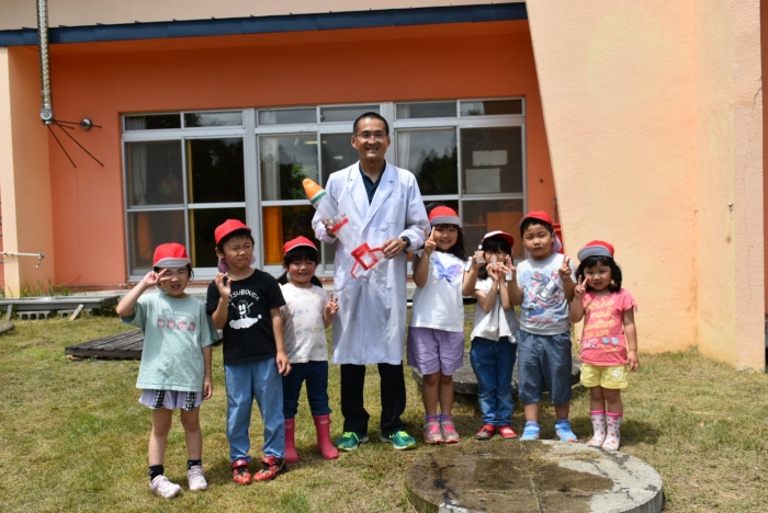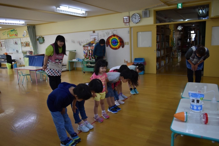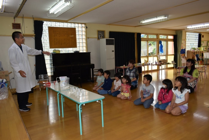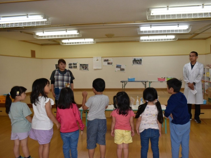 お忙しい中,子ども達の好奇心・探求心を湧き立たせる出前授業を行ってくださったF先生,本当に有難うございました。今後とも,親しみや憧れの気持ちから学校を身近に感じたり,幼児期での知的好奇心から学校への自覚的な学びへとつなぐきっかけを大切にしていきたいと思います。