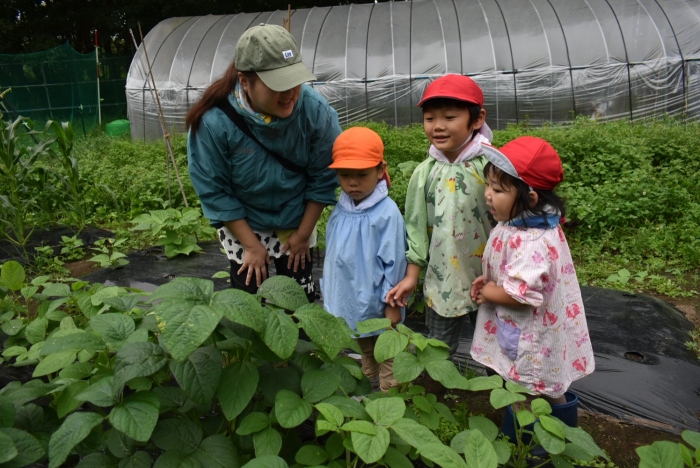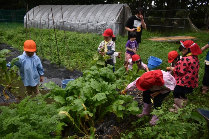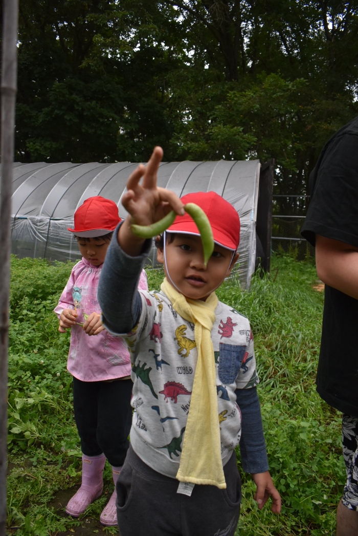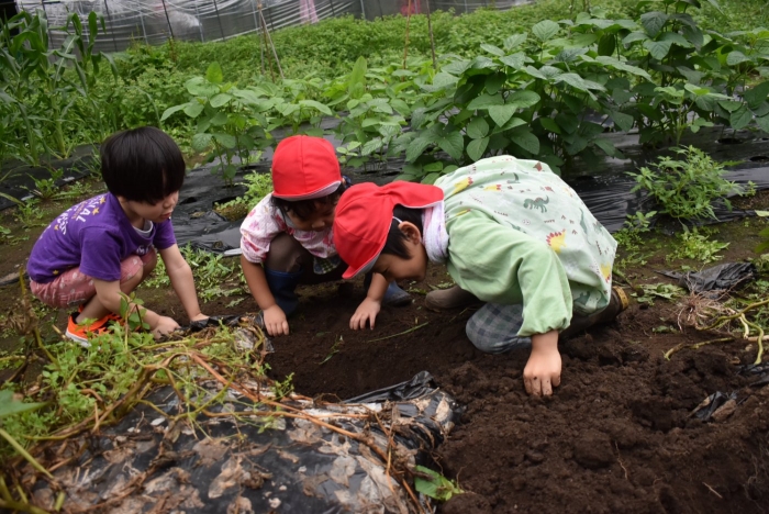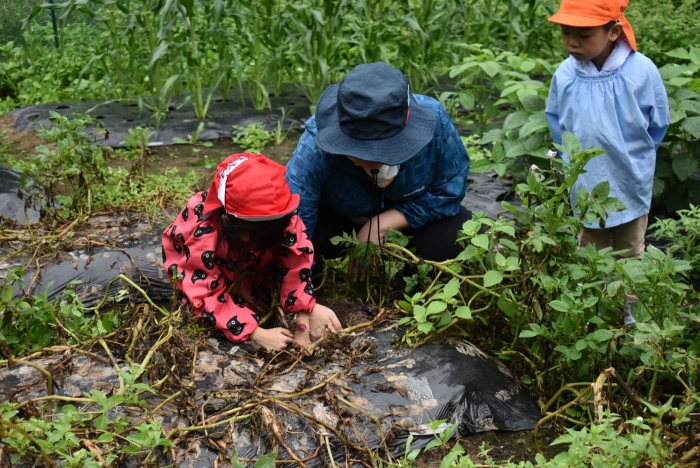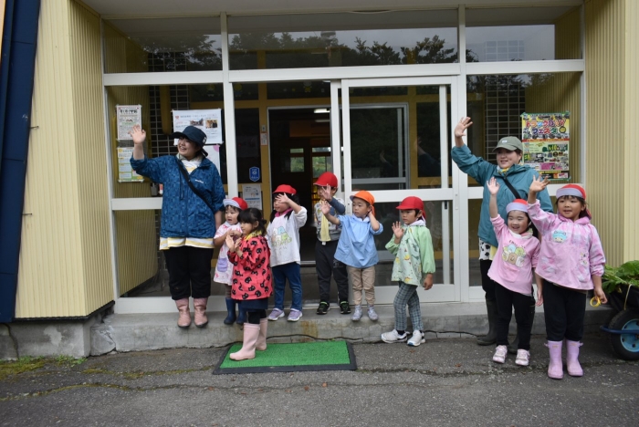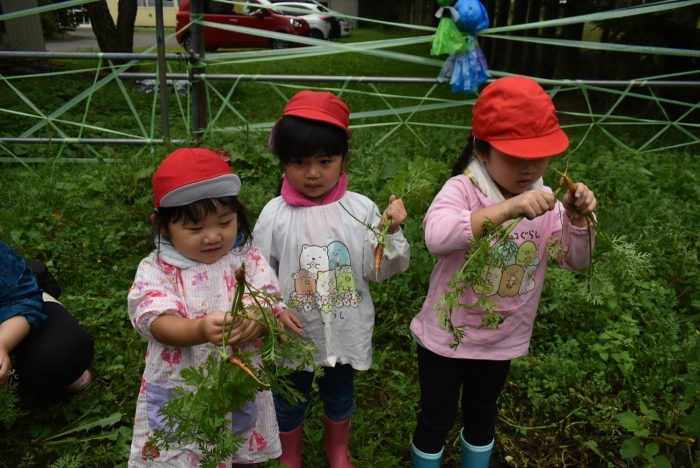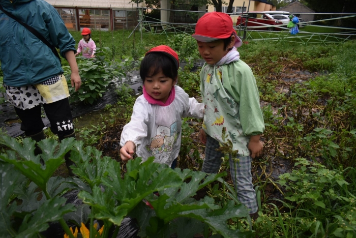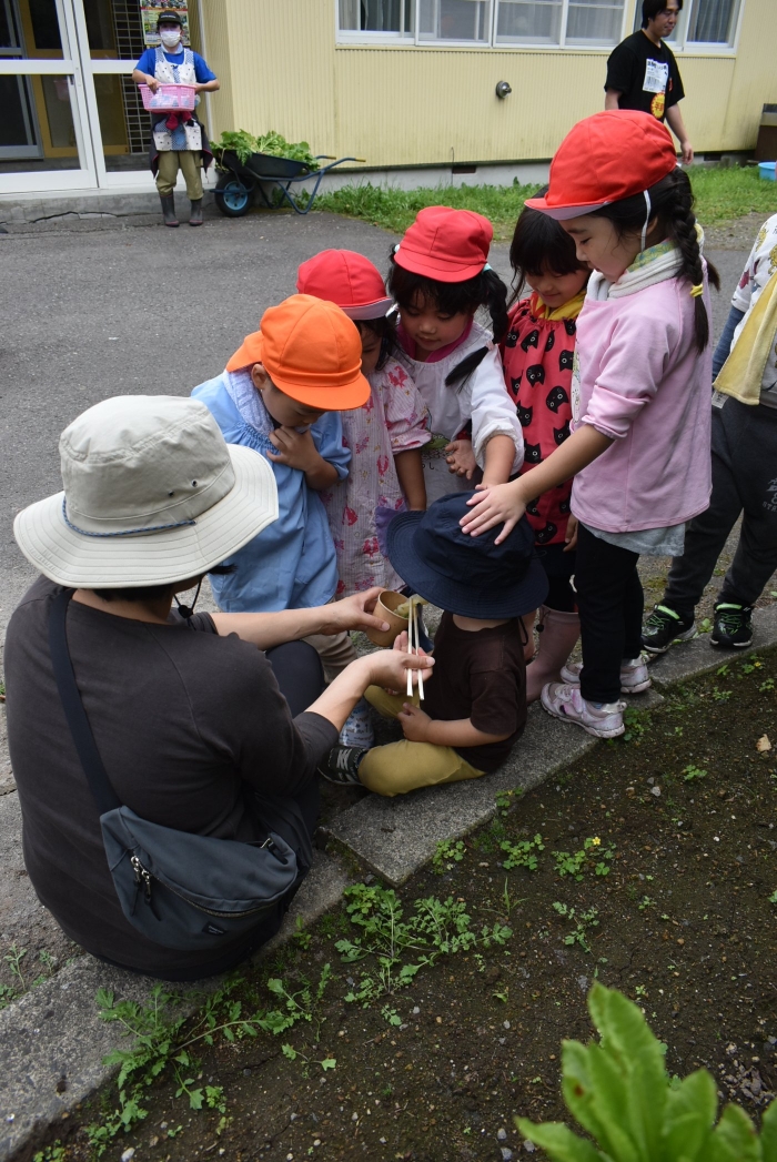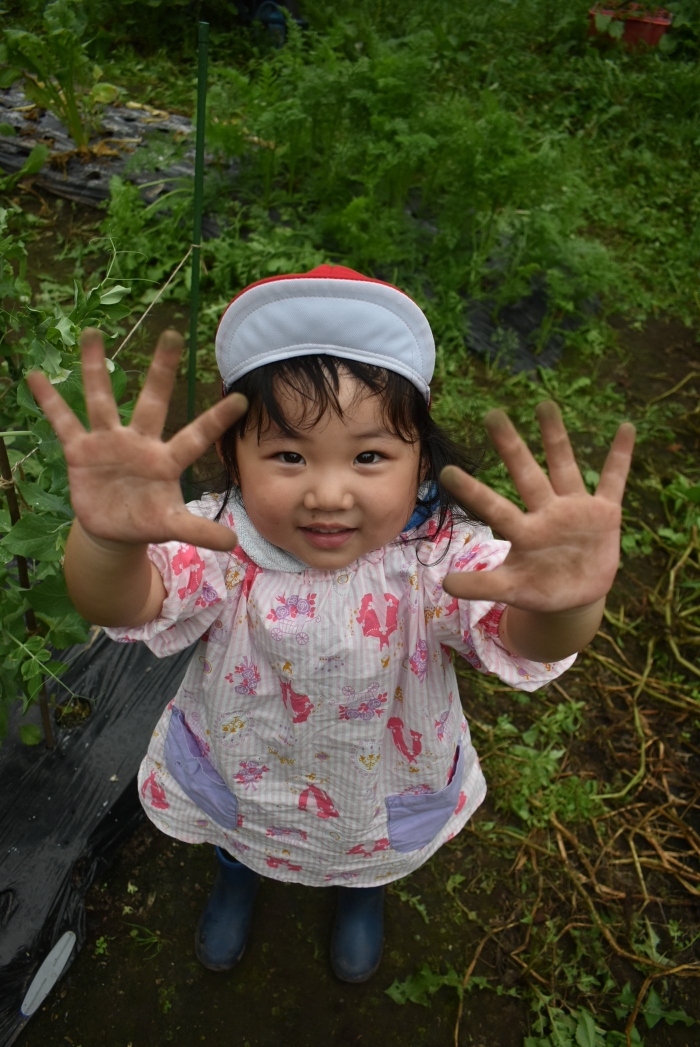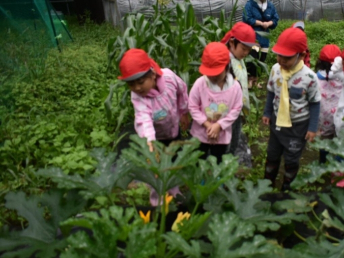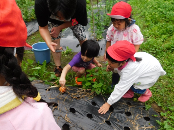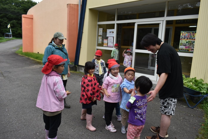 戸外では,ぴよぴよさんと一緒に食べ頃となった野菜を収穫したり,砂場や固定遊具で遊んだりしました。自分たちがやっていることに興味をもって一緒に野菜を採ったり,遊びを真似たり,自分たちが育てた野菜(タマネギ・エンドウの天ぷら)を頬張る姿に,愛おしそうな表情をみせていた園児たち。別れの時には,ハイタッチを交わしている姿は,何とも微笑ましい場面でした。