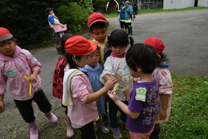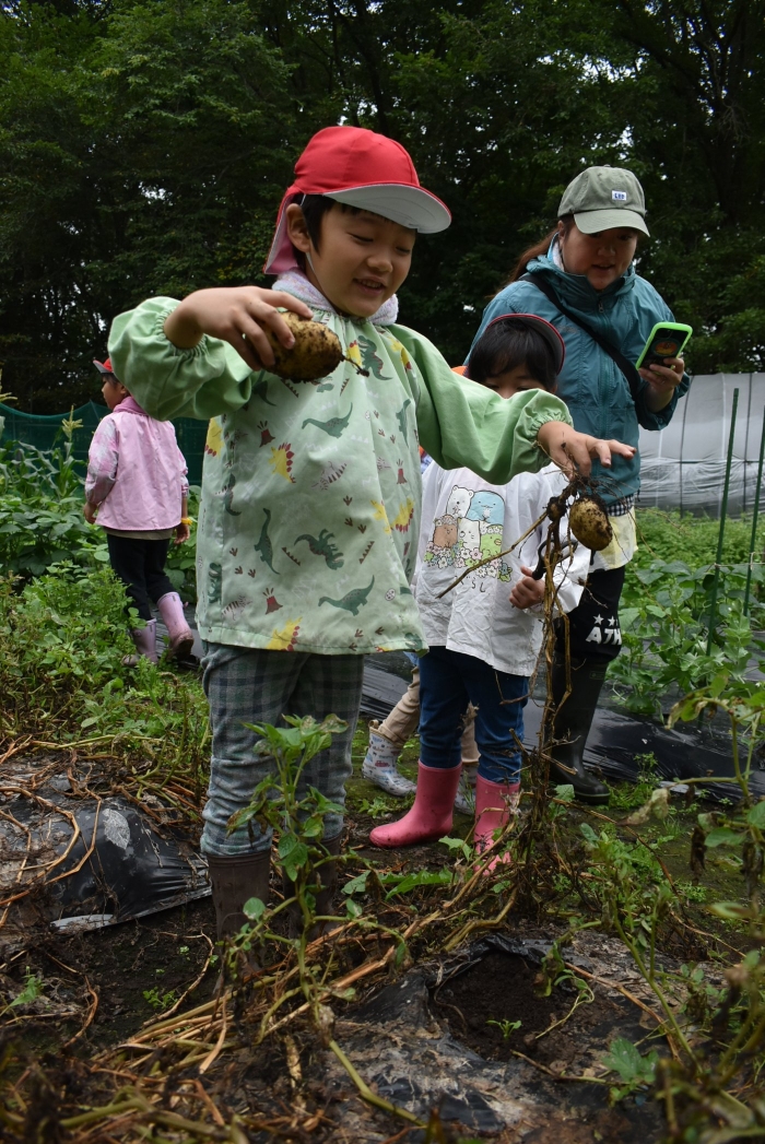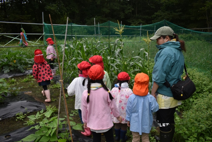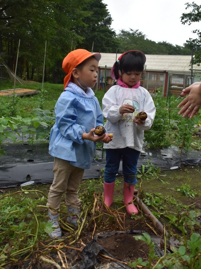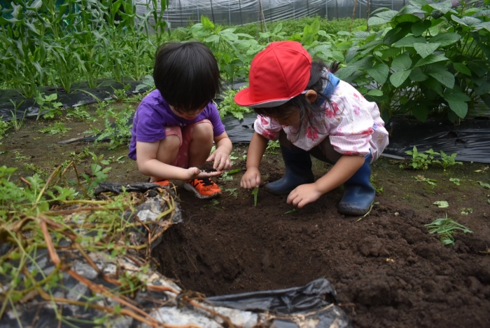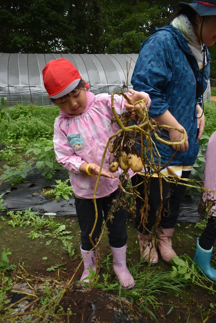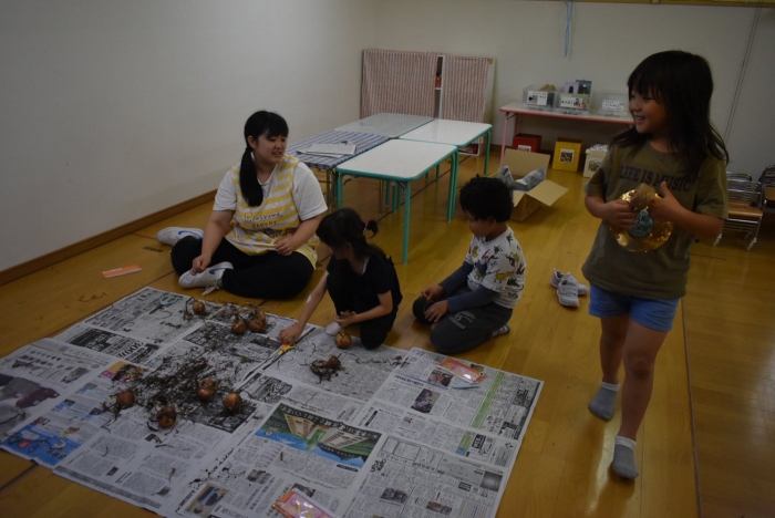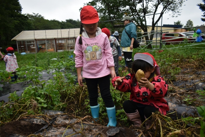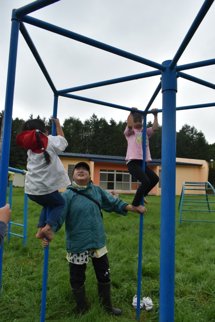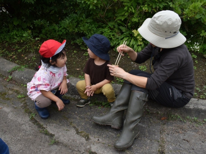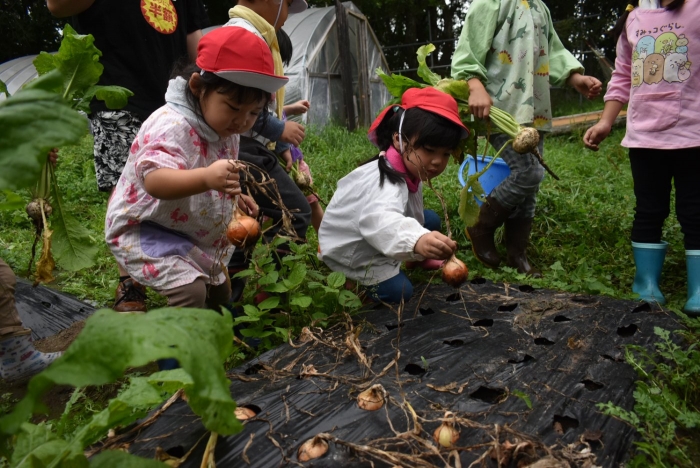 戸外では,ぴよぴよさんと一緒に食べ頃となった野菜を収穫したり,砂場や固定遊具で遊んだりしました。自分たちがやっていることに興味をもって一緒に野菜を採ったり,遊びを真似たり,自分たちが育てた野菜(タマネギ・エンドウの天ぷら)を頬張る姿に,愛おしそうな表情をみせていた園児たち。別れの時には,ハイタッチを交わしている姿は,何とも微笑ましい場面でした。