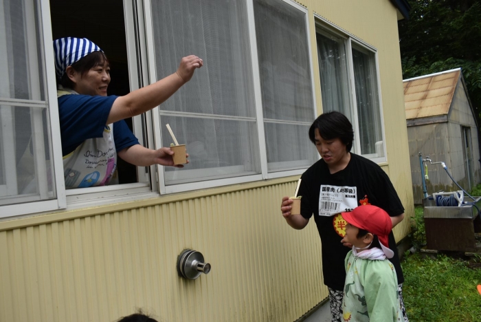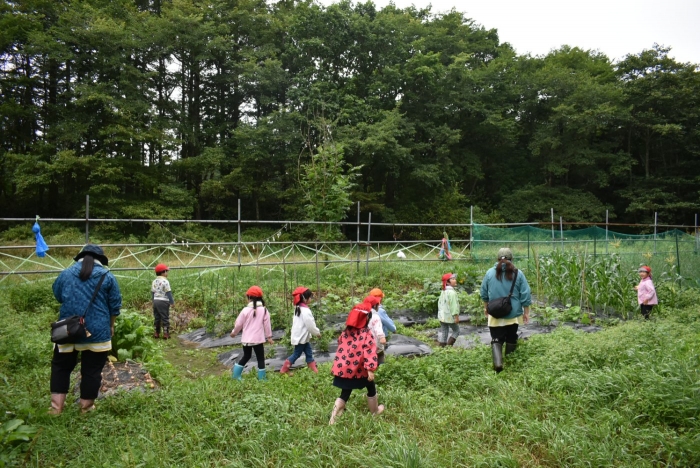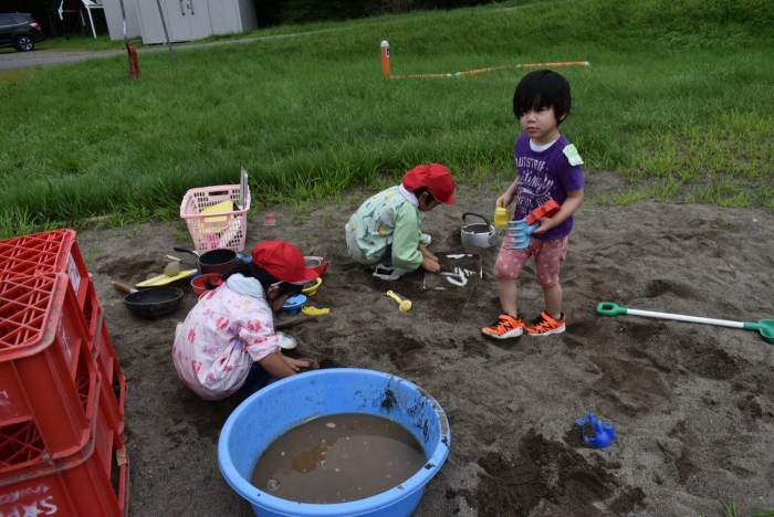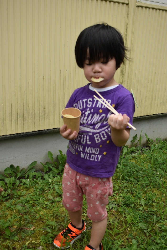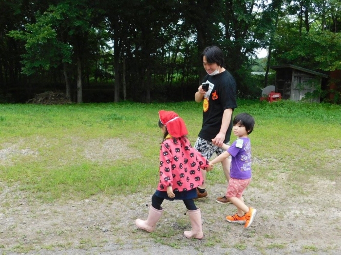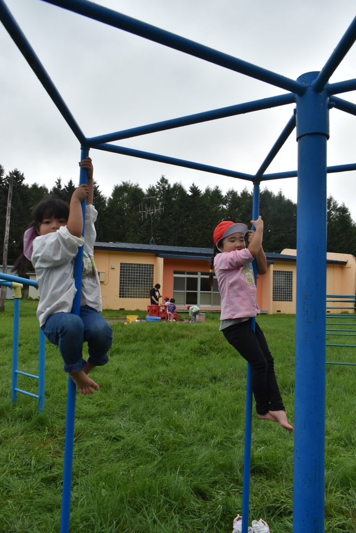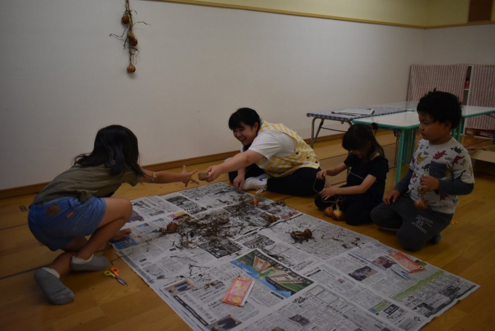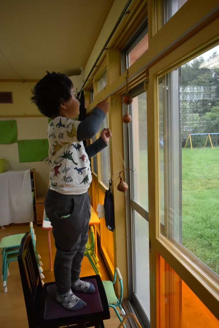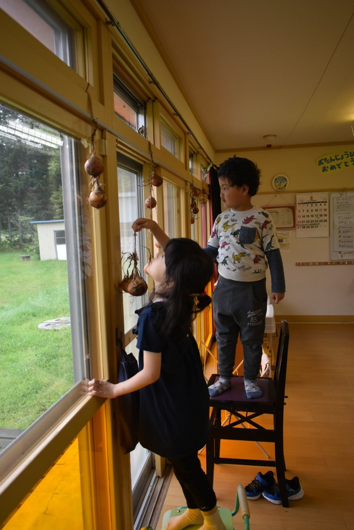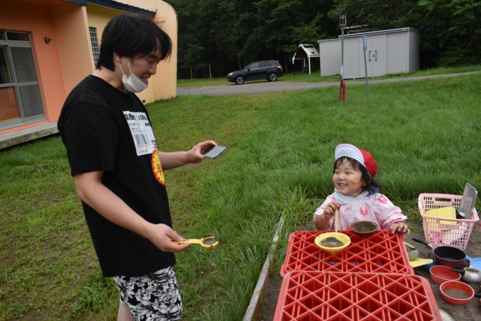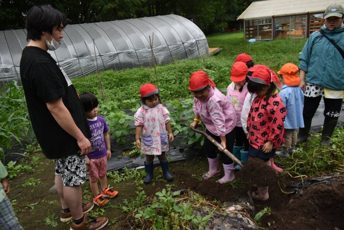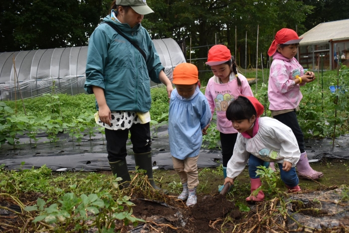 戸外では,ぴよぴよさんと一緒に食べ頃となった野菜を収穫したり,砂場や固定遊具で遊んだりしました。自分たちがやっていることに興味をもって一緒に野菜を採ったり,遊びを真似たり,自分たちが育てた野菜(タマネギ・エンドウの天ぷら)を頬張る姿に,愛おしそうな表情をみせていた園児たち。別れの時には,ハイタッチを交わしている姿は,何とも微笑ましい場面でした。