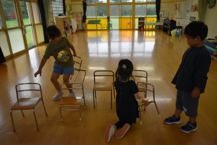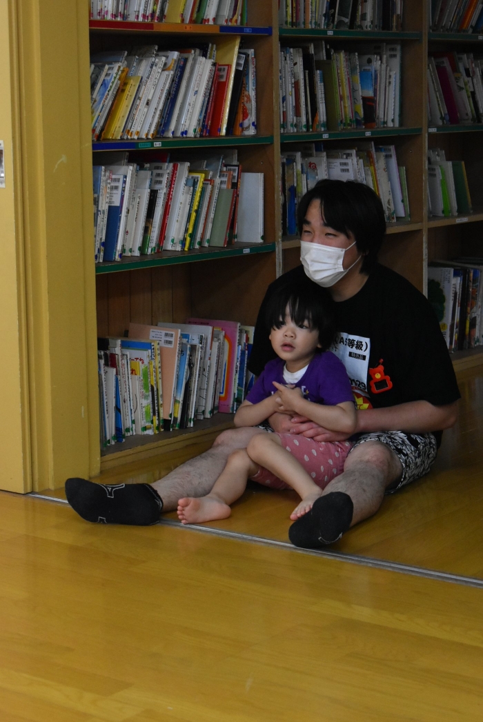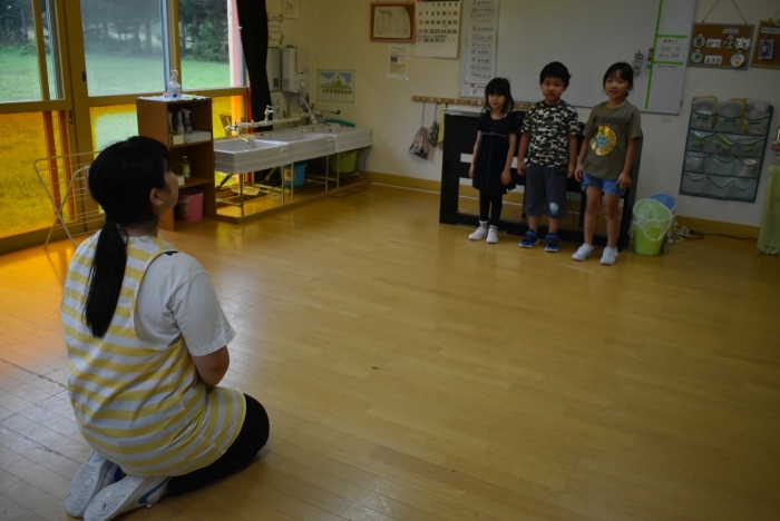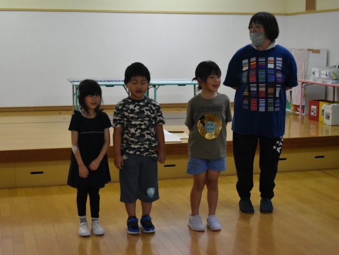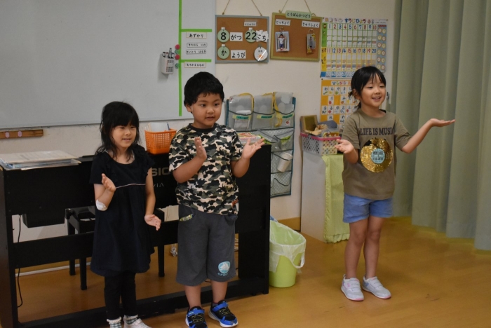 年長ひまわり組が進行役をする朝の会では, 昨日から打合せをしたり,直前まで披露する手遊びの練習をしたりしていました。ぴよぴよさんの方は久しぶりの幼稚園とあり,ちょっぴり緊張,早く外で遊びたい!! の思いが先立ち遊戯室に入るのが難しかったのですが,楽しそうな雰囲気をつくったり気持ちがほぐれるような接し方を考えたりしながら朝の会をしていた園児たち。一生懸命関わった分,ぴよぴよさんが笑顔になった時には大喜びしている姿がありました。