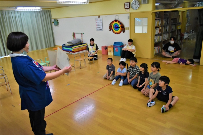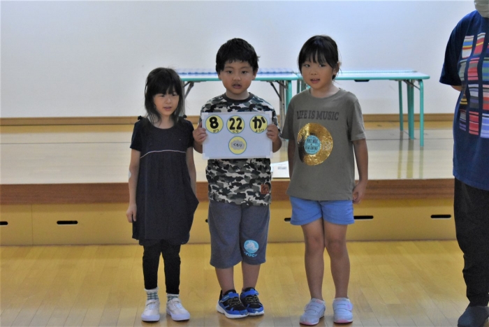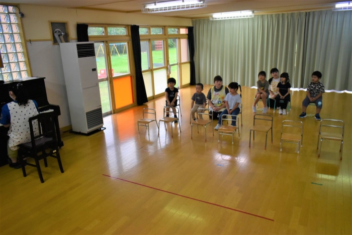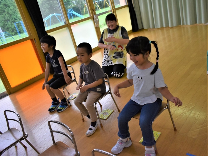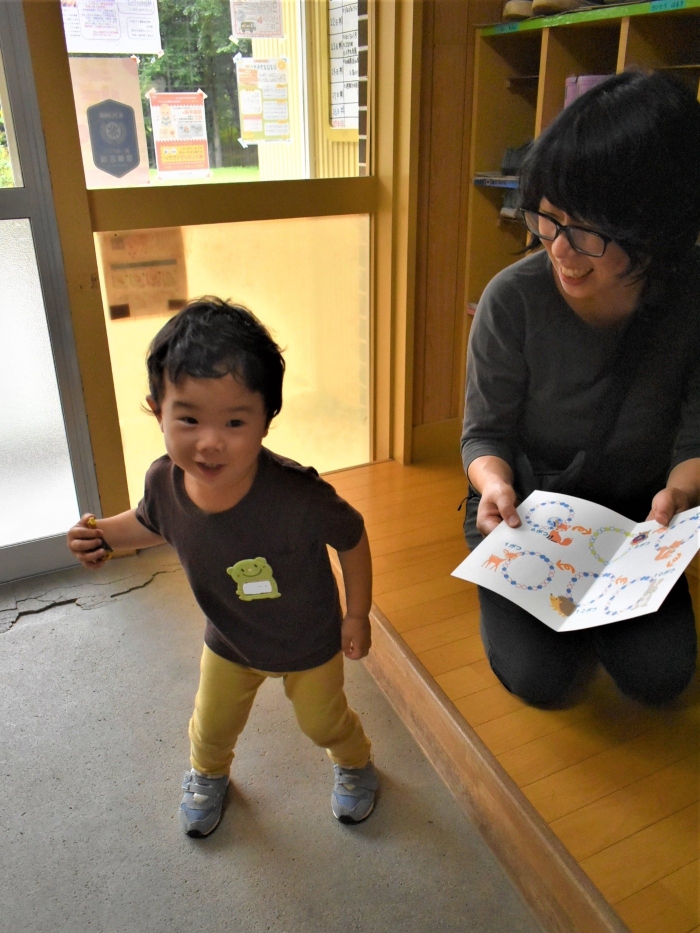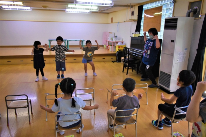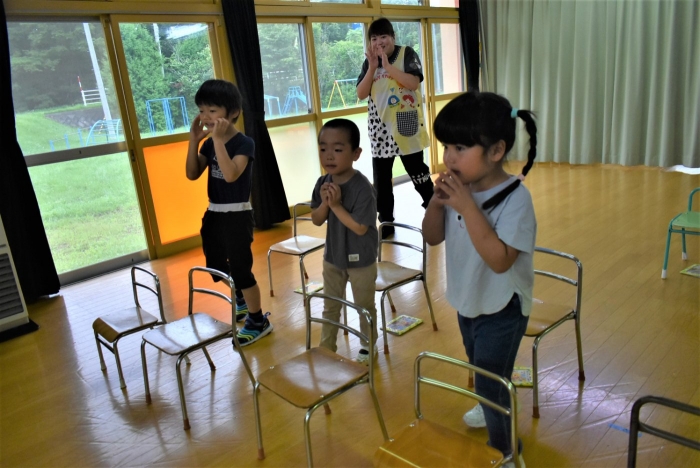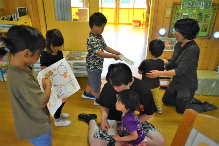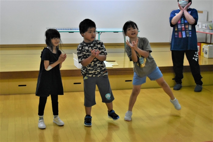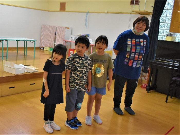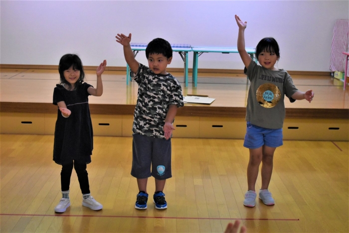 年長ひまわり組が進行役をする朝の会では, 昨日から打合せをしたり,直前まで披露する手遊びの練習をしたりしていました。ぴよぴよさんの方は久しぶりの幼稚園とあり,ちょっぴり緊張,早く外で遊びたい!! の思いが先立ち遊戯室に入るのが難しかったのですが,楽しそうな雰囲気をつくったり気持ちがほぐれるような接し方を考えたりしながら朝の会をしていた園児たち。一生懸命関わった分,ぴよぴよさんが笑顔になった時には大喜びしている姿がありました。