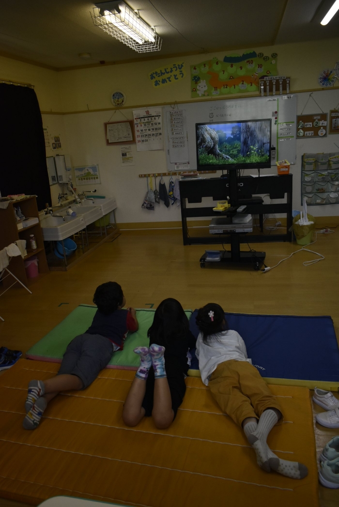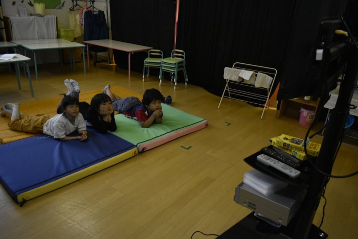 給食・お腹休めの遊び後は,ビデオを観ながらリラックスタイム