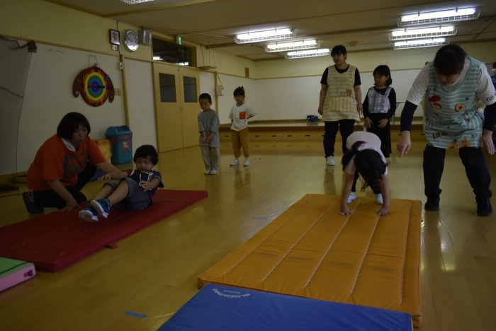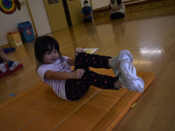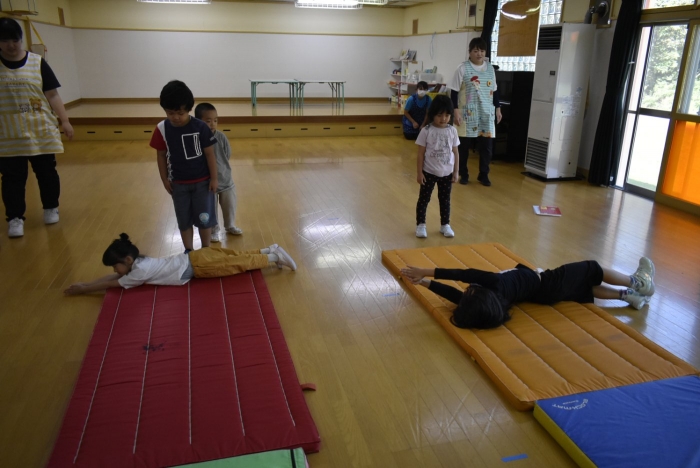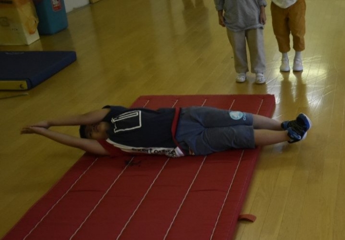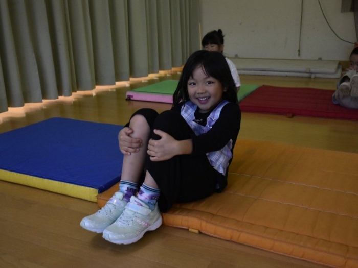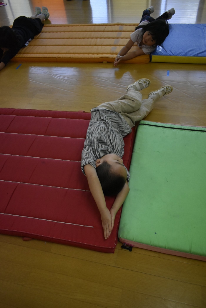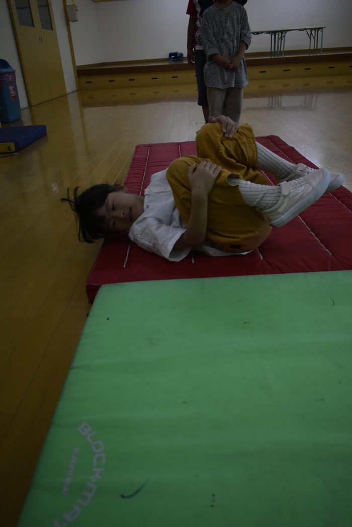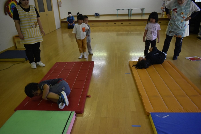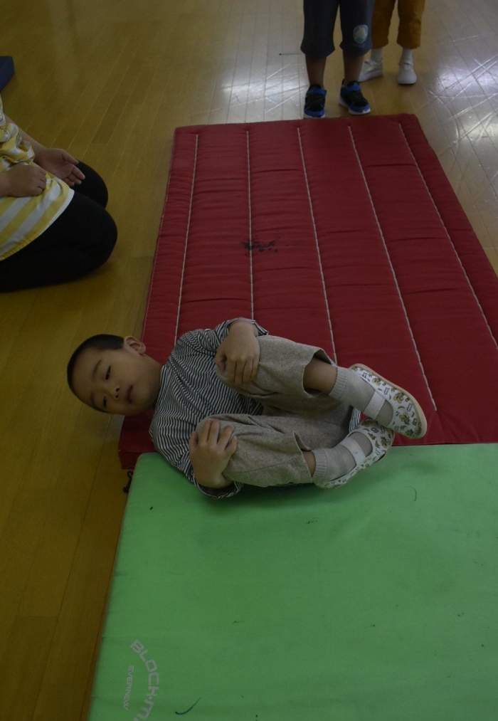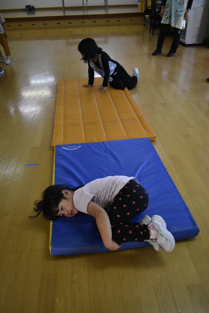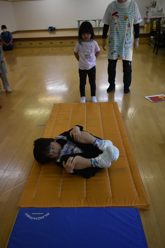 隔週月曜日は『体で遊ぼう!』の日。今日は『マット運動』を行いました。回転感覚を体感し,前転や側転のボディーイメージ・コントロールを養う『揺りカゴ(体育座りで起き上がりこぼし)』『サツマイモ(手足を伸ばし横回転)』『ジャガイモ(手足を縮め横回転)』という動きをしました。『揺りカゴ』の動きから前転にも挑戦!  でんぐり返しの経験はあるものの,正しい前転の仕方(足の間へ頭を丸め込む,膝を縮めながら回転して立ち上がる)は,なかなか難易度が高かったようです。
