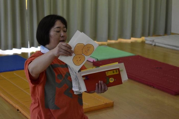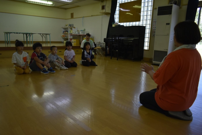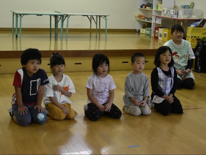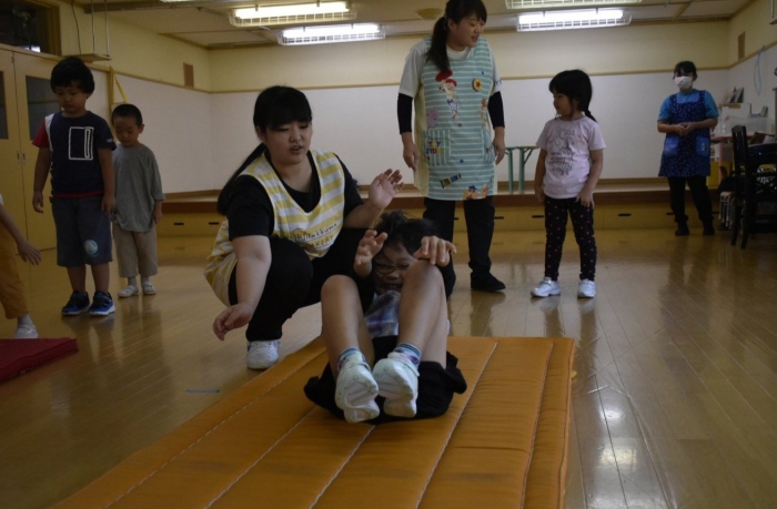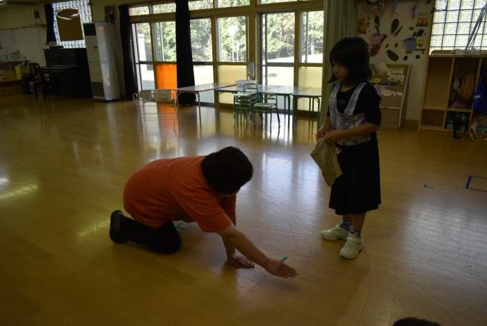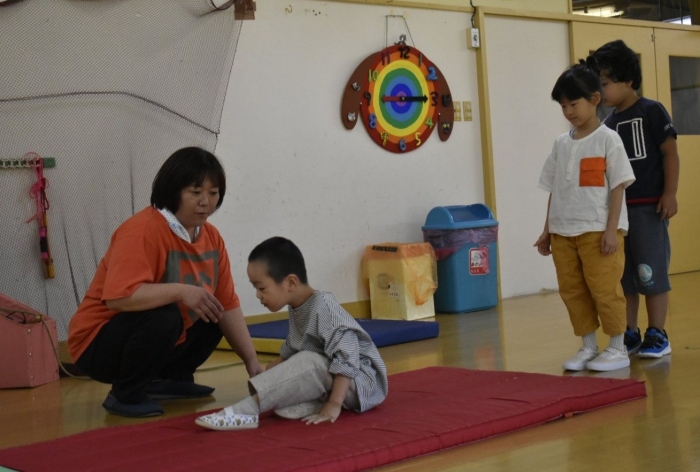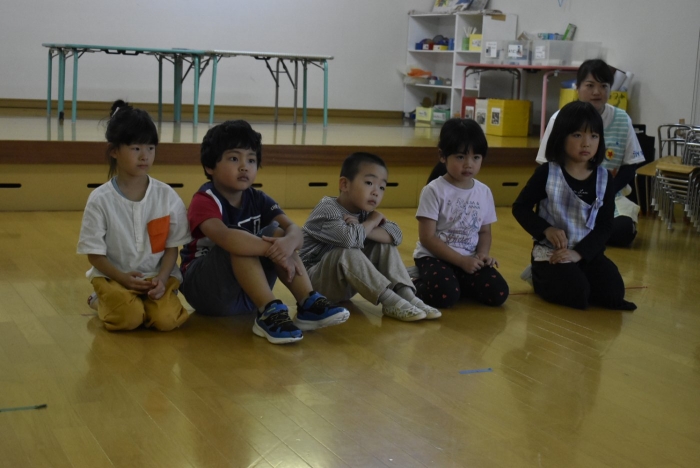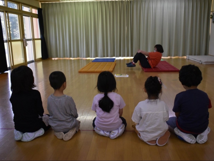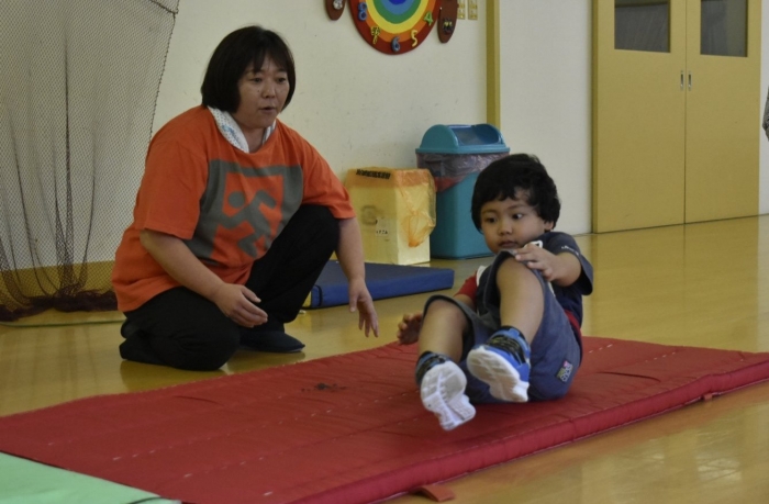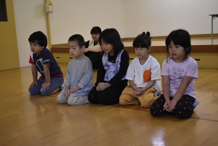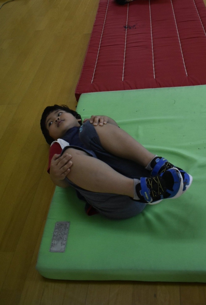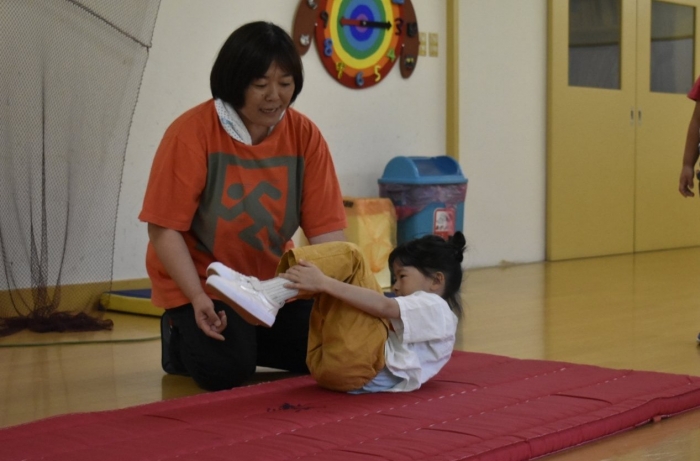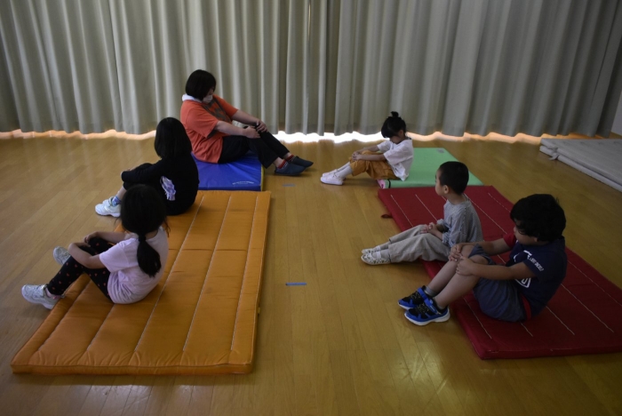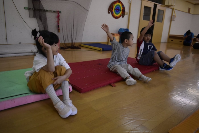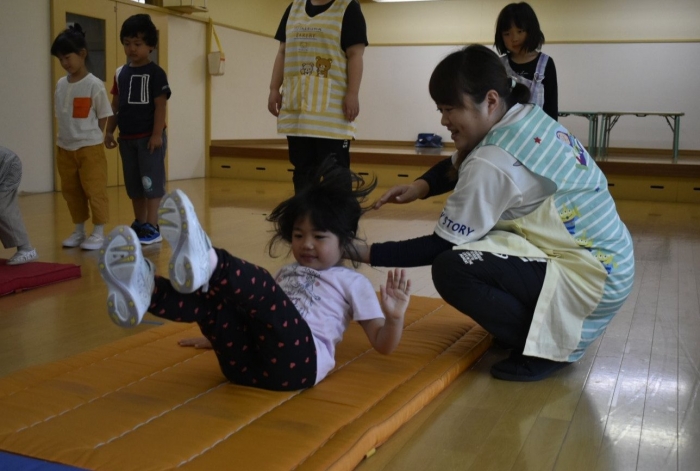 隔週月曜日は『体で遊ぼう!』の日。今日は『マット運動』を行いました。回転感覚を体感し,前転や側転のボディーイメージ・コントロールを養う『揺りカゴ(体育座りで起き上がりこぼし)』『サツマイモ(手足を伸ばし横回転)』『ジャガイモ(手足を縮め横回転)』という動きをしました。『揺りカゴ』の動きから前転にも挑戦!  でんぐり返しの経験はあるものの,正しい前転の仕方(足の間へ頭を丸め込む,膝を縮めながら回転して立ち上がる)は,なかなか難易度が高かったようです。
