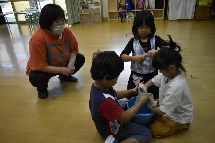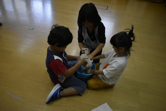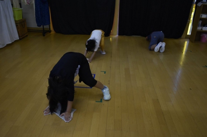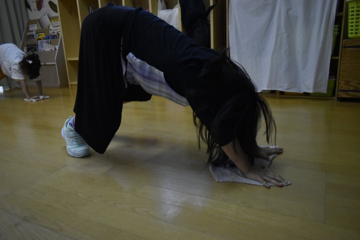 ④雑巾がけ  「ちょっと狭い」と言い合いながら3人同時に雑巾絞り