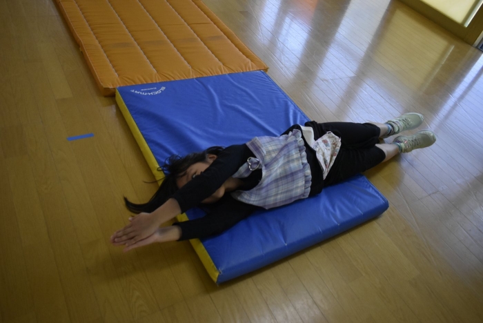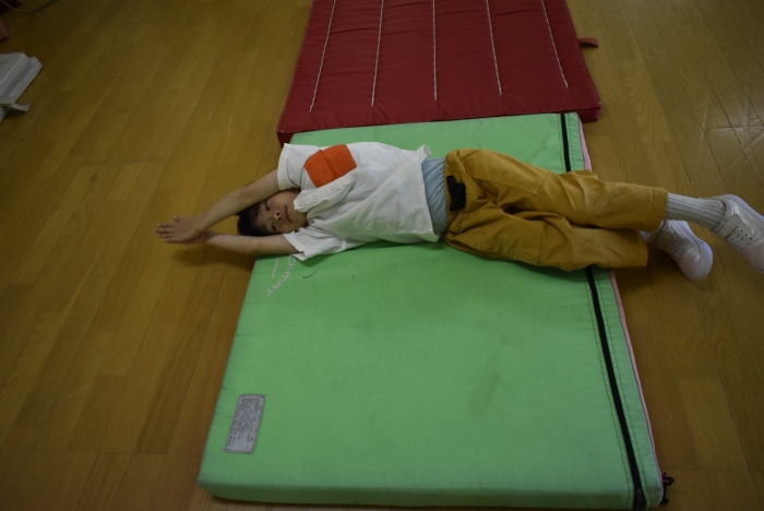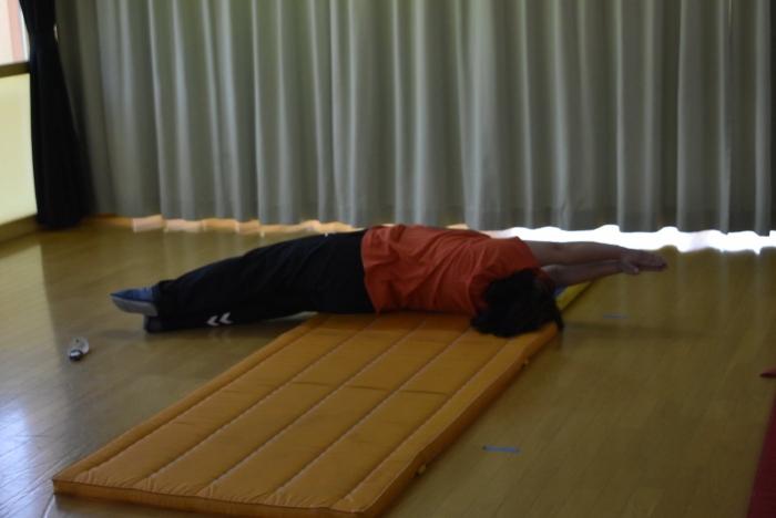こちらは『サツマイモ』の動き  両手,両足をピーンと伸ばし,目線を上にし横回転