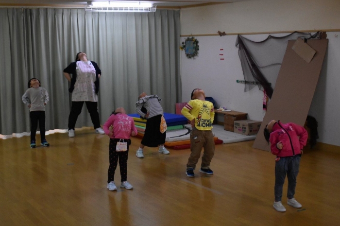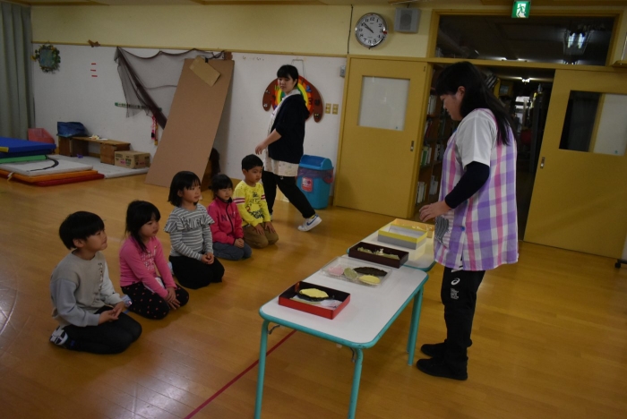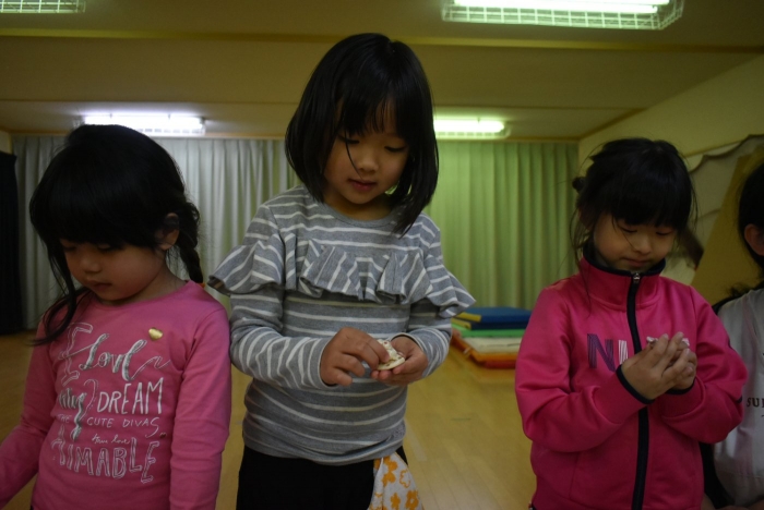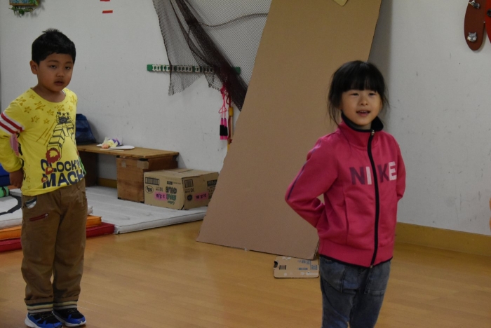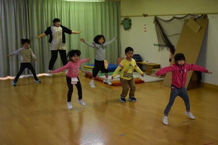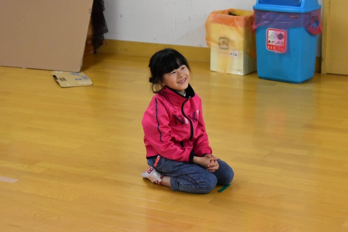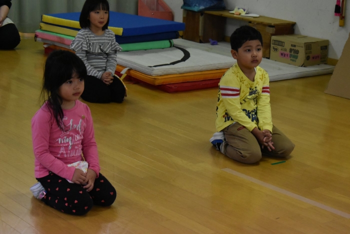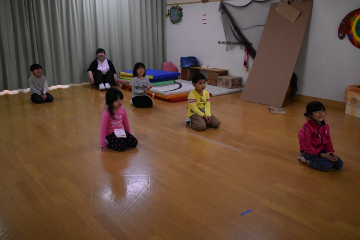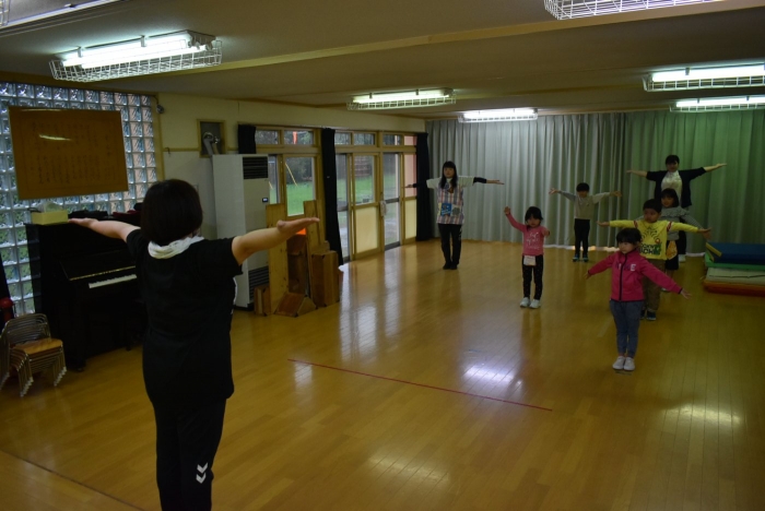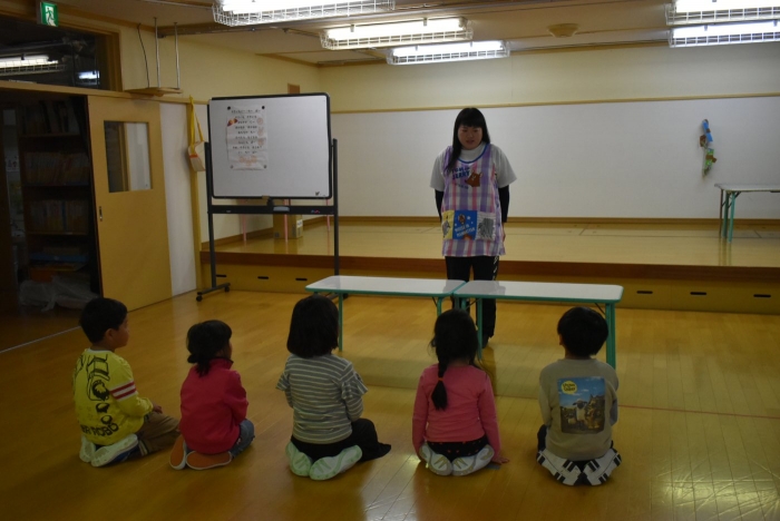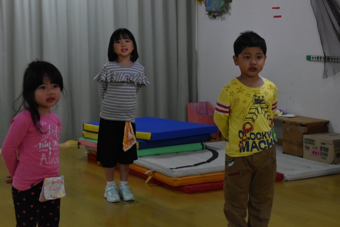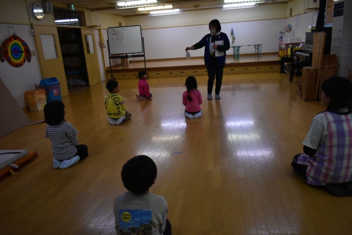 さて,今日は『全園集会』があました。お話タイムでは,『運動会』や『一緒に遊ぶ日(父親参観日)』『雪上お楽しみ会』など,体を動かす行事の時には欠かせない『ラジオ体操』についての話がありました。ラジオ体操には,95年の歴史があること,実は歌があったり,キャラクターがいることを知ったり,新らしい豆知識に目を輝かせながら受け答えしていました。中でも盛り上がったのは,ラジオ体操のキャラクター名あてクイズです。さて,話をしっかり聴いて覚えているか,答えはぜひお子さんに聞いてみてください。由来を聞いた後のラジオ体操は,また一味違った感覚で踊れたようです。