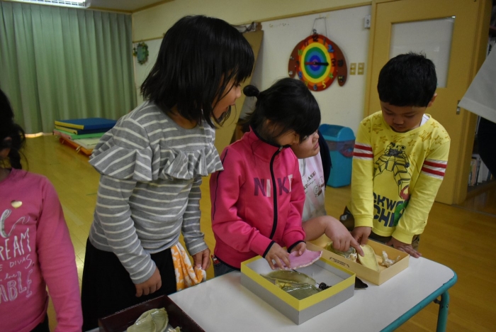 その後,先日行った出前授業『陶芸体験』での作品お披露目を行いました。出来上がった作品を手に取り,粘土だった時とは違う手触りや風合いを味わったり,友達と見せ合ったりしながら感動を分かち合っていた子ども達です。お忙しい中,仕上げ作業を手掛けてくださった渡辺師匠に,心よりお礼申し上げます。