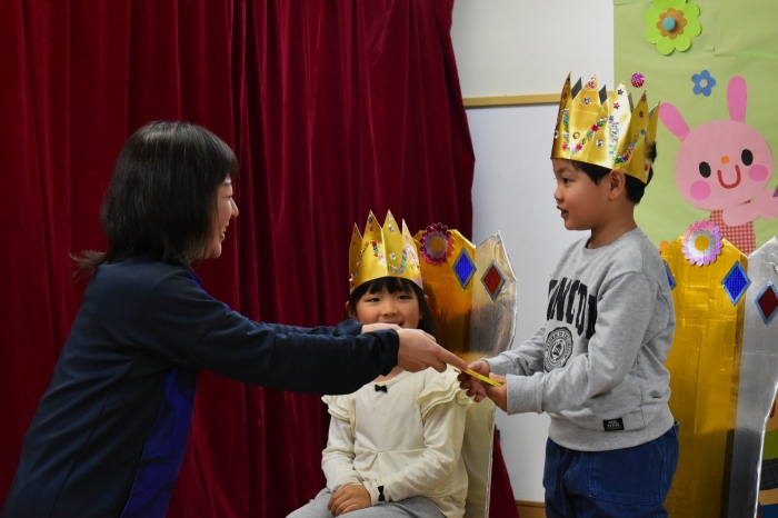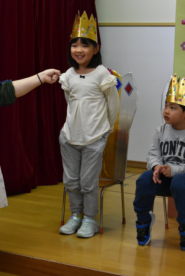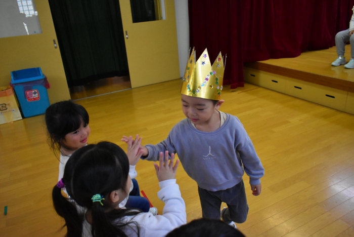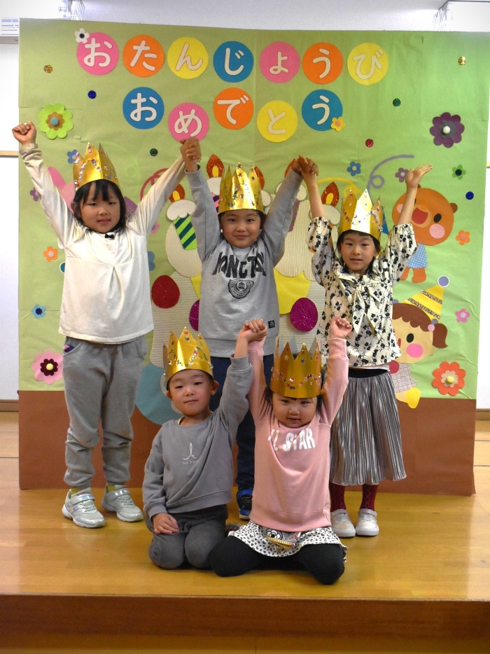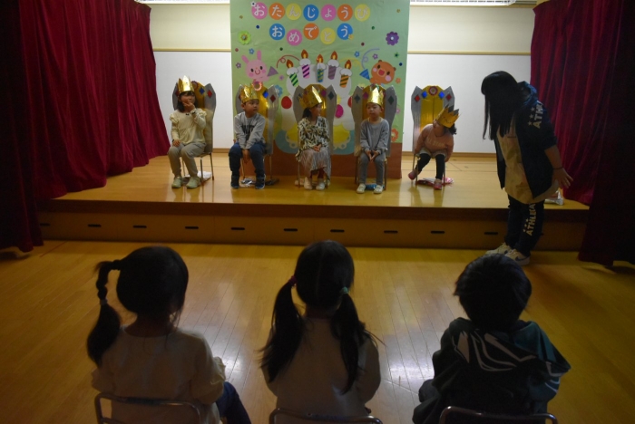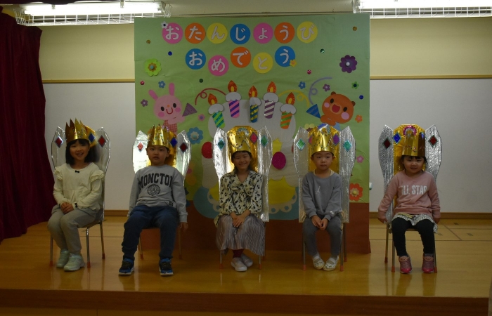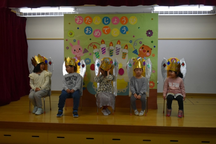 今日は,10月生まれの『誕生会』がありました。なんと,全園児8名中5名の友達が10月生まれ! お祝いする側は少人数でしたが,年中児3名で手拍子・拍手にと全力で祝福していました。この日を待ちに待っていた5名の誕生児たちは,祝福の言葉にとびきりの笑顔でハイタッチ入場☆彡 一つ大きくなったという自覚と喜びにあふれ,ステージ上で堂々と自己紹介や質問への受け答えをしていました。 素直に喜びを表現する姿も,とても可愛くステキだなと思いました。