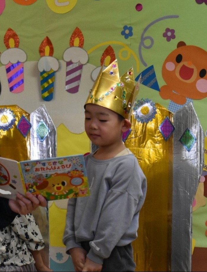 家族や担任からのメッセージも添えてある誕生日絵本&オリジナル絵本バックのプレゼント,友達からのお祝いの歌,誕生日ケーキのロウソク消し…,特別な一日に笑顔があふれていた誕生児。お祝いする側の友達も笑顔がいっぱい,誕生児同士でも拍手を送り合っている姿には絆の深まりを感じます。