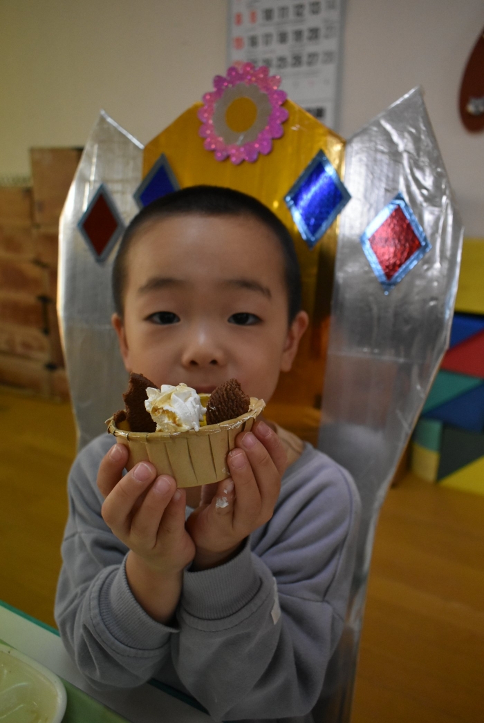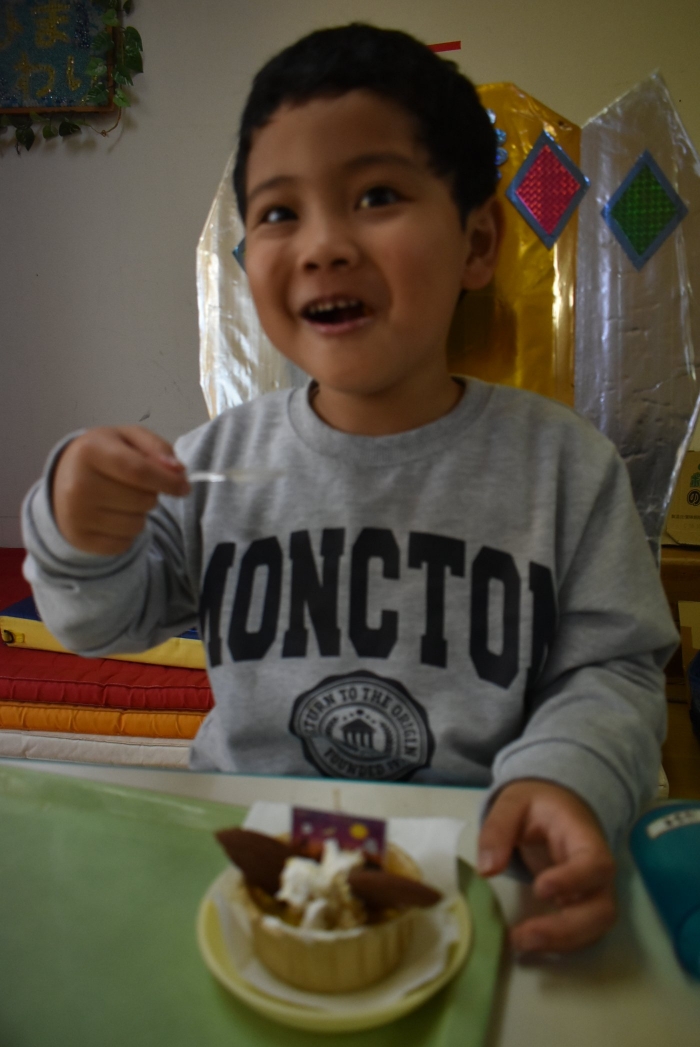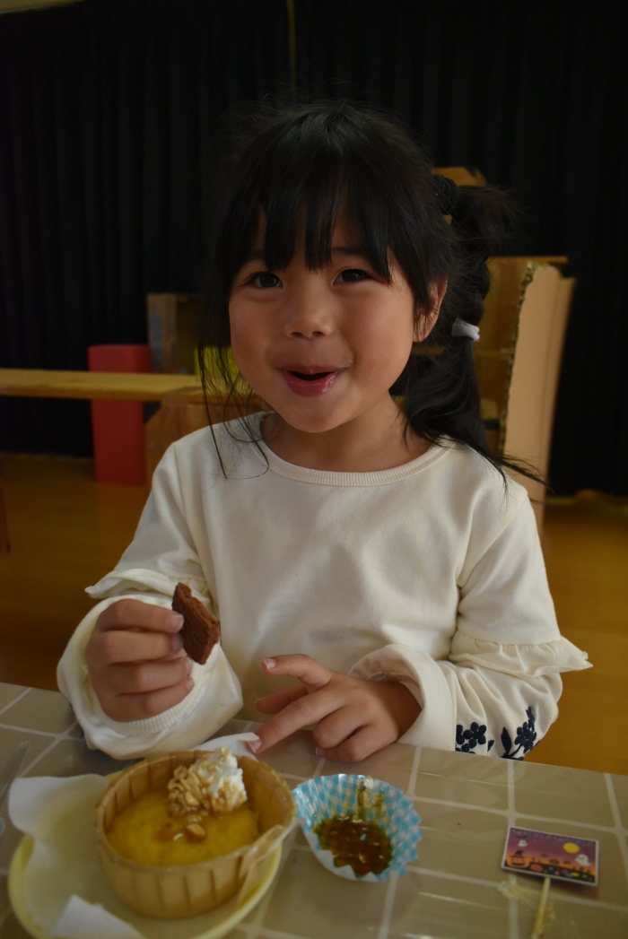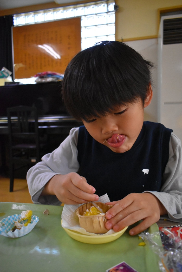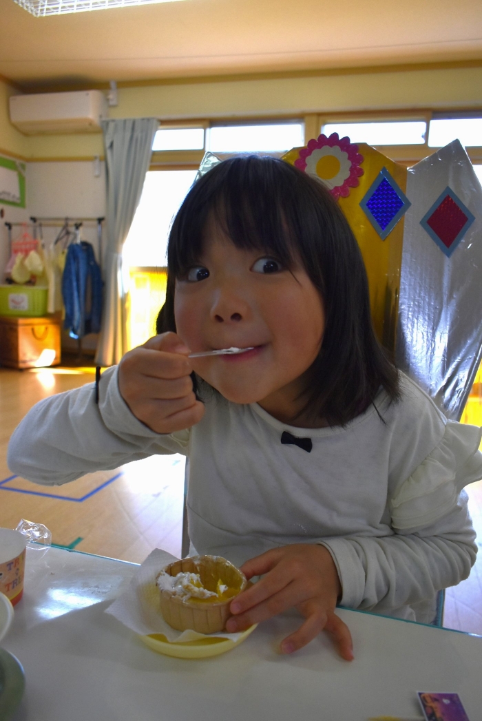誕生会のお楽しみでは,集団ゲーム『フルーツバスケット(果物バージョン・動物バージョン)』で大いに盛り上がり,誕生会おやつではハロウィン仕様の『カボチャ蒸しパン』を味わいました。楽しいゲーム,みんなで味わう給食&美味しいおやつに,幸せを噛み締めていた子ども達です。