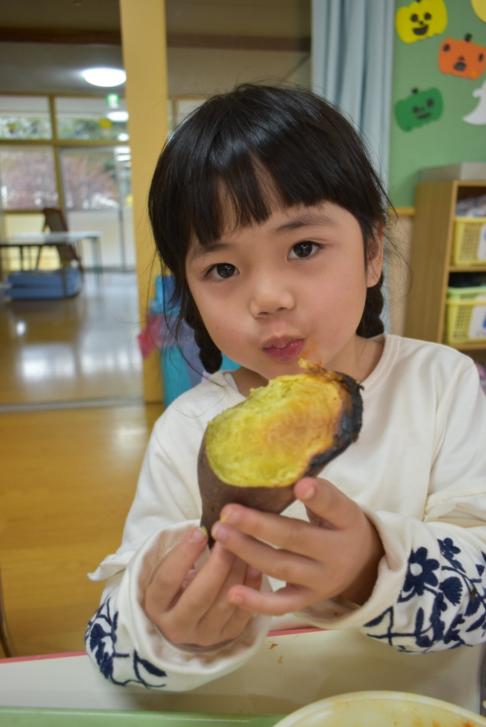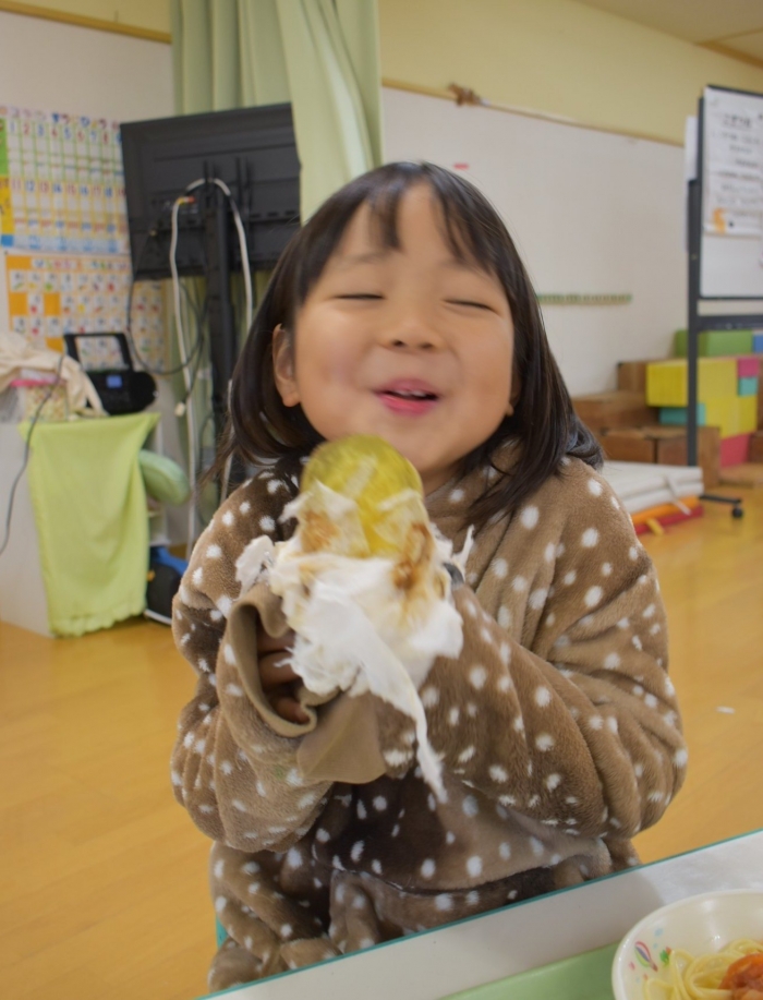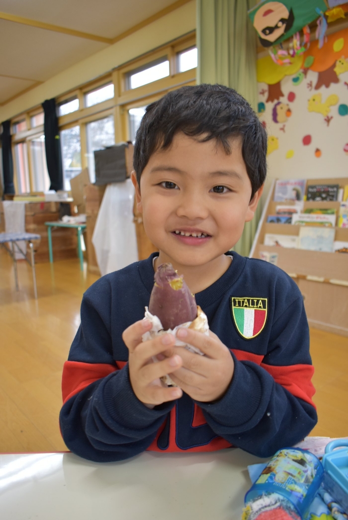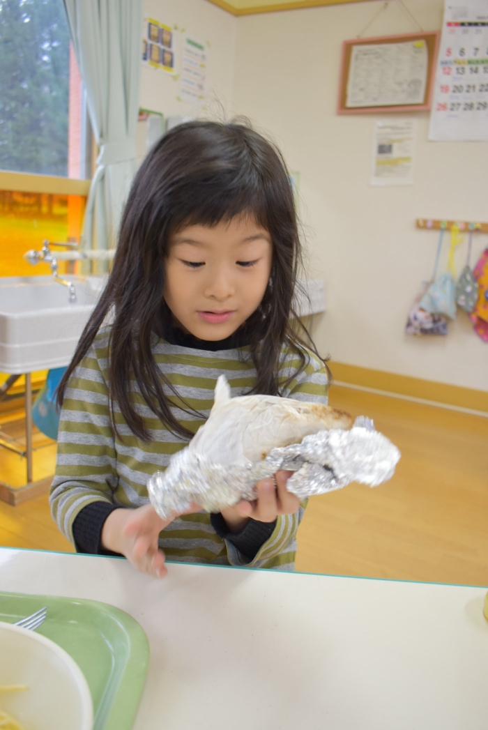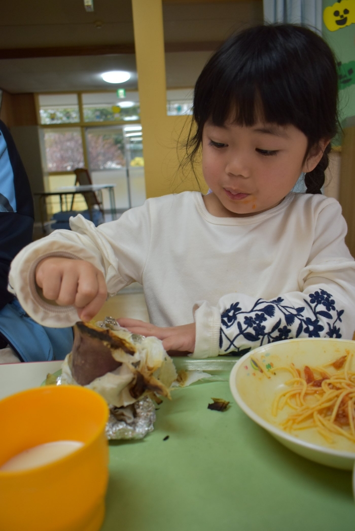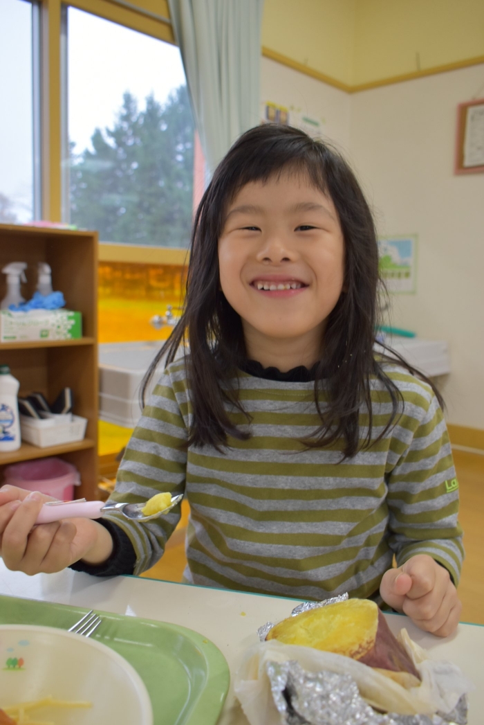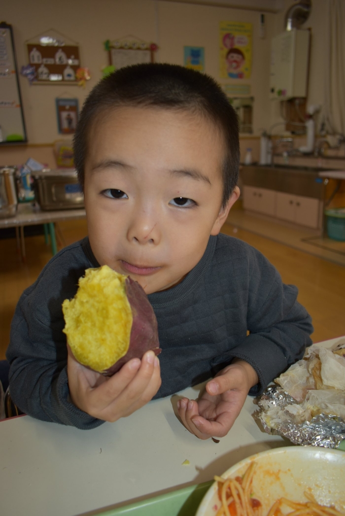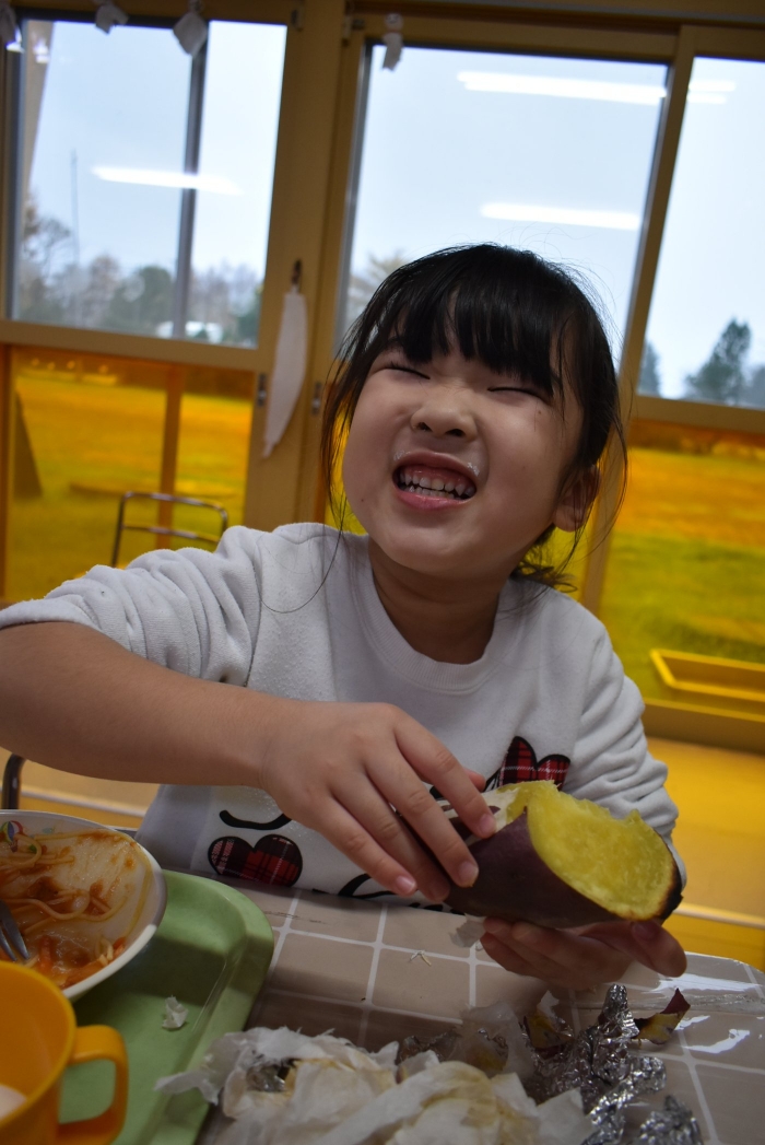 ちょうど給食時間に焼き上がり☆彡 漂ってくる甘い匂いに鼻をクンクン,熱さと格闘しながらアルミホイルを剥がしていくと真っ黄色になったサツマイモが! 大興奮で焼きたてほかほかの焼きイモを頬張り,至福の表情を浮かべていた子ども達です。