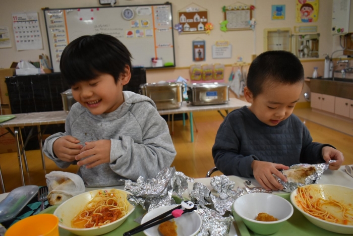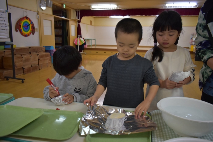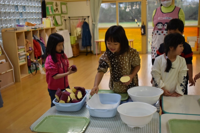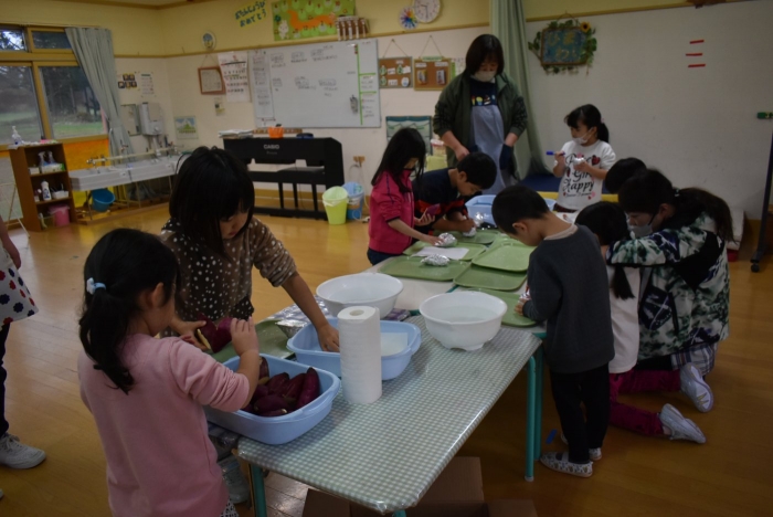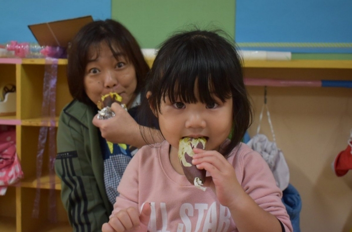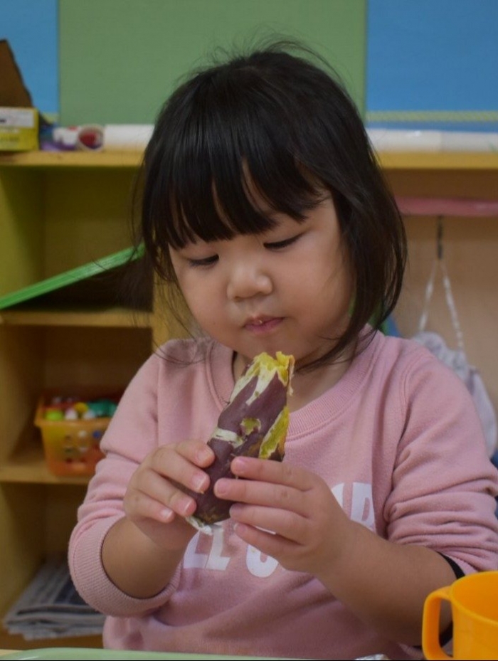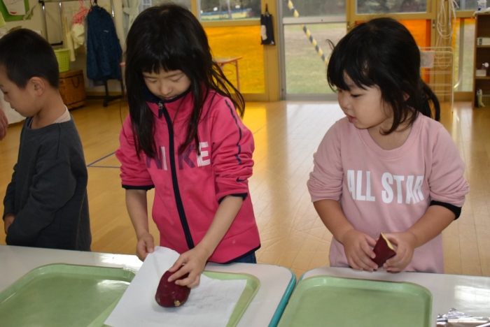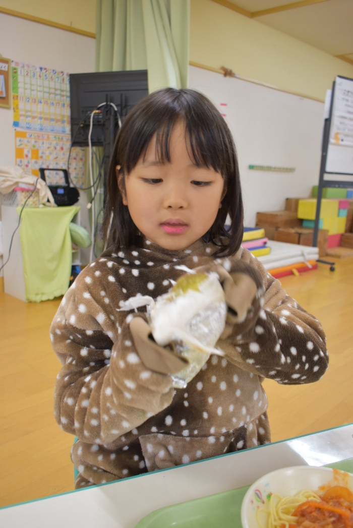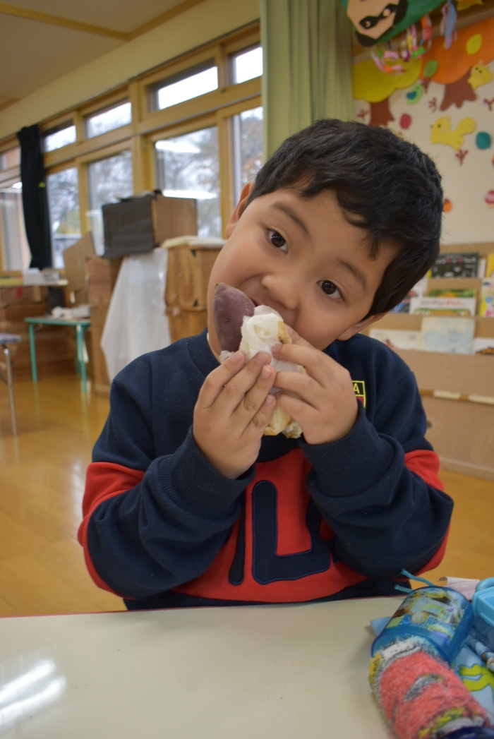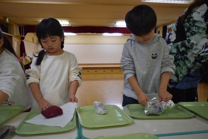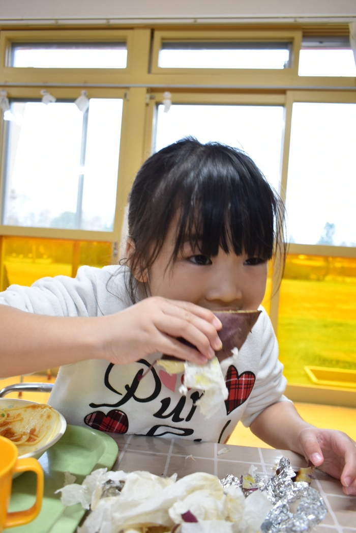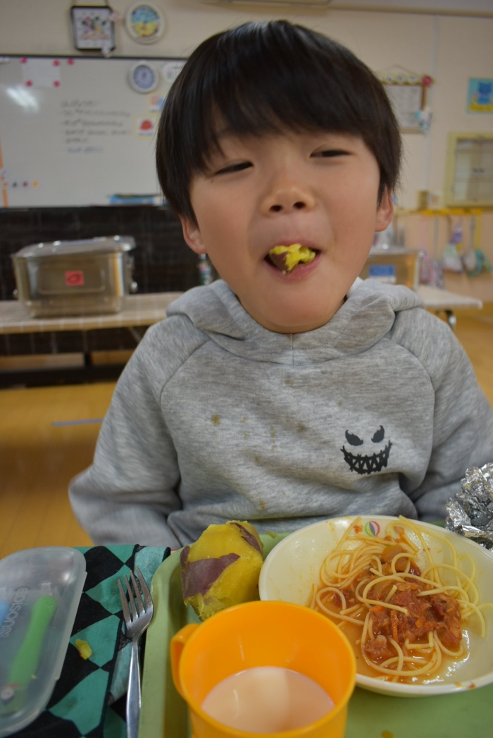 ちょうど給食時間に焼き上がり☆彡 漂ってくる甘い匂いに鼻をクンクン,熱さと格闘しながらアルミホイルを剥がしていくと真っ黄色になったサツマイモが! 大興奮で焼きたてほかほかの焼きイモを頬張り,至福の表情を浮かべていた子ども達です。