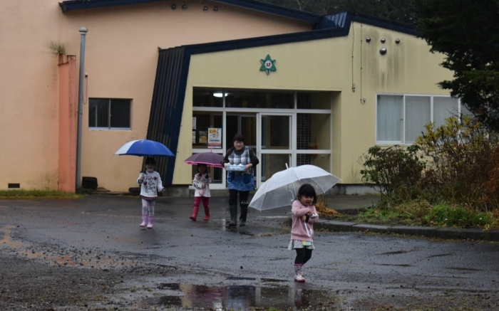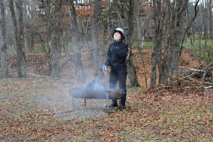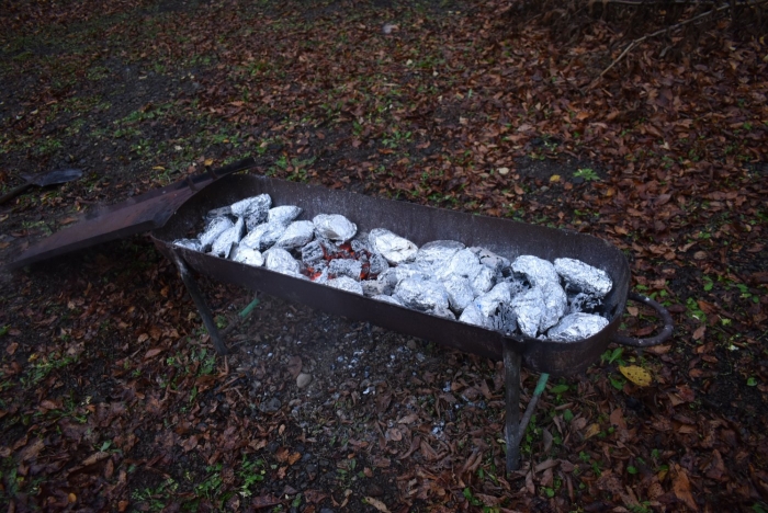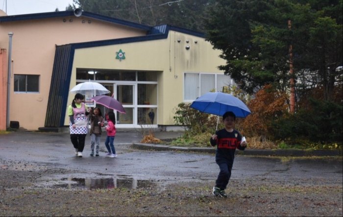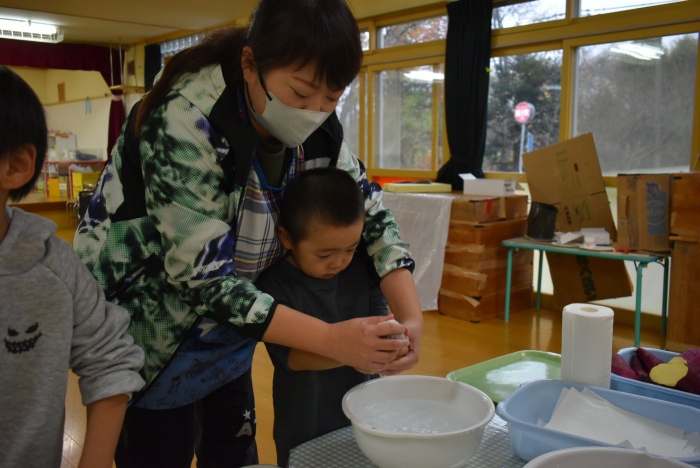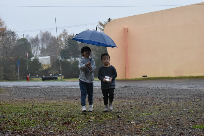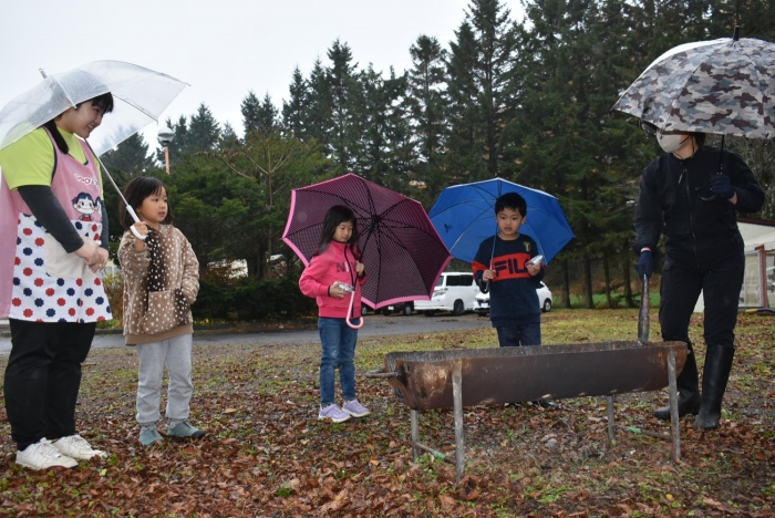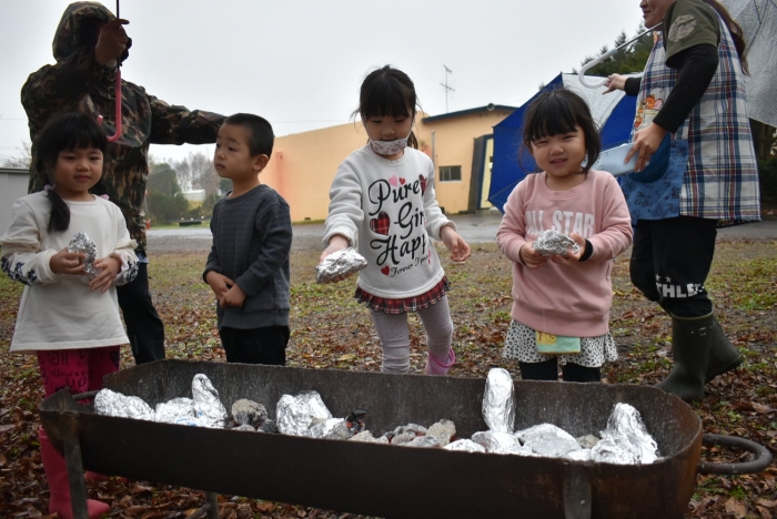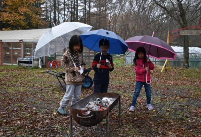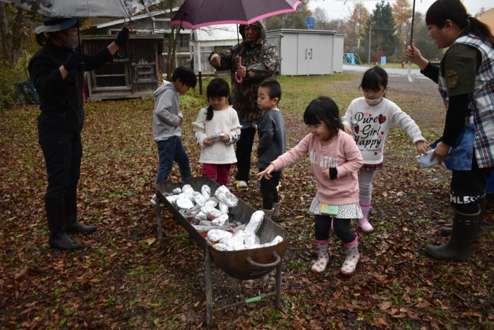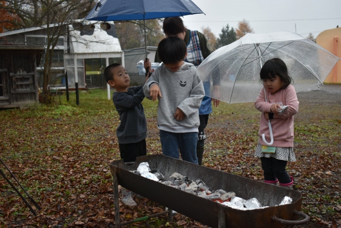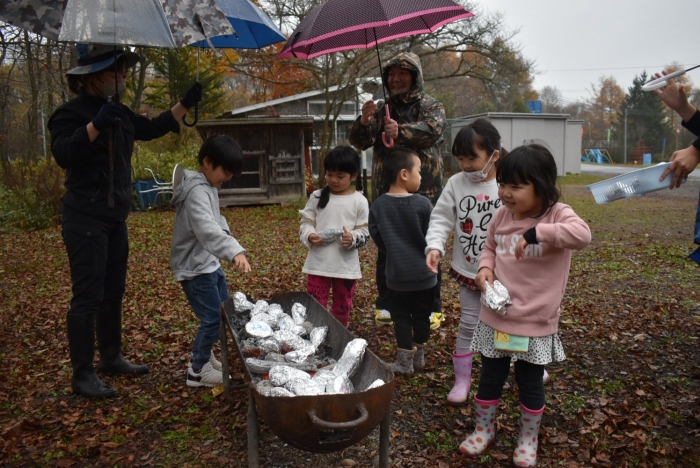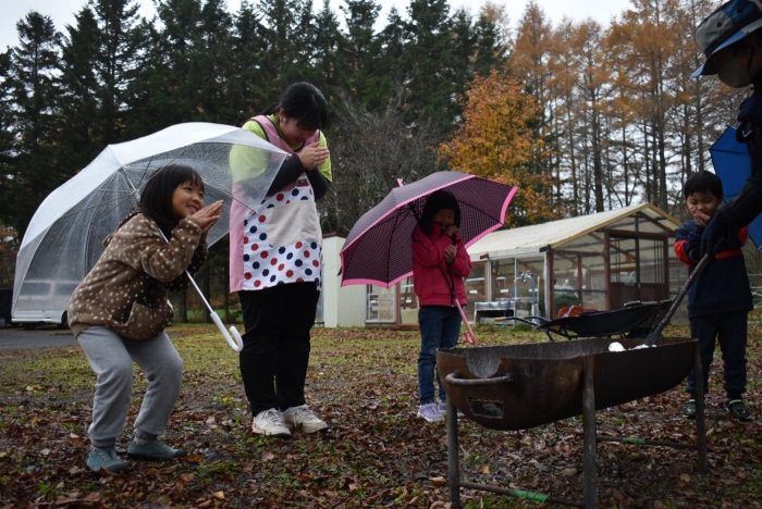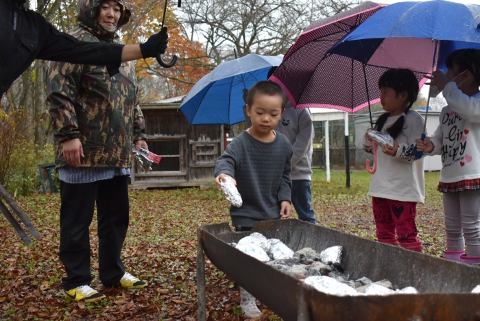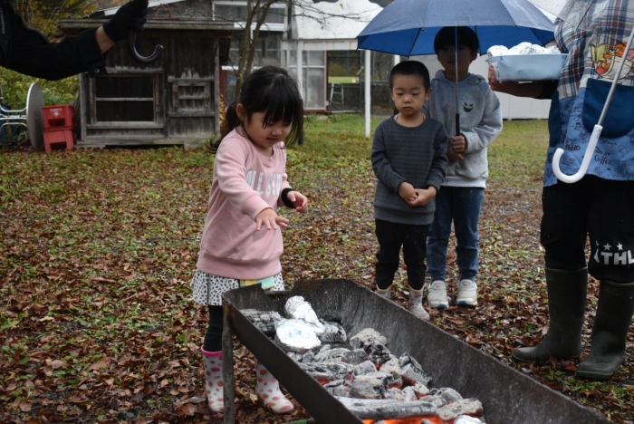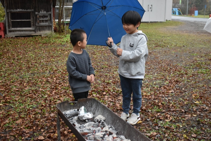 落ち葉が散り敷く季節,『 焼きイモ』が一層美味しく感じる頃となりました。 秋晴れとはいかず,怪しい雲行きでしたが,毎年恒例の焼きイモを行いました。子ども達には水漬け&ホイル包みを担当してもらいました。火おこしの途中,ポツポツと雨が降ってきましたが強行突破! 炭火を囲み,ゆったり暖をとることはできませんでしたが,傘を差しながらサツマイモを投入! 焼きあがりを心待ちに過ごしました。