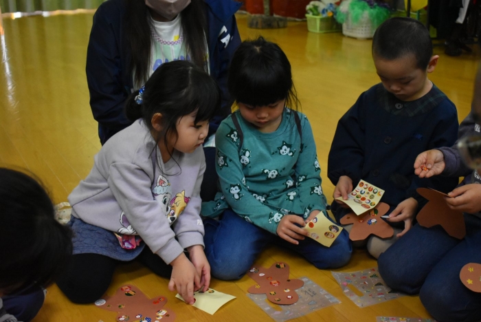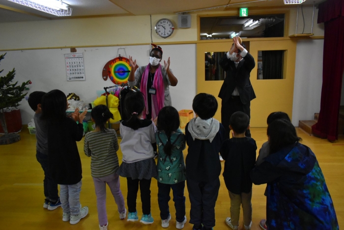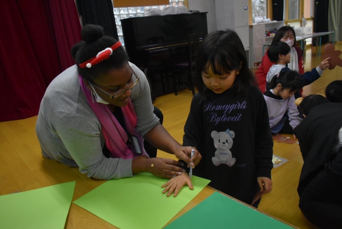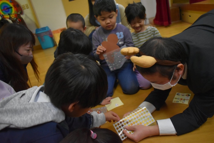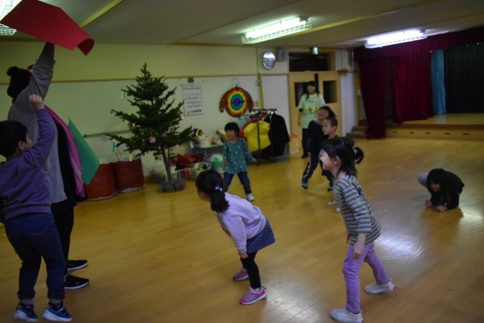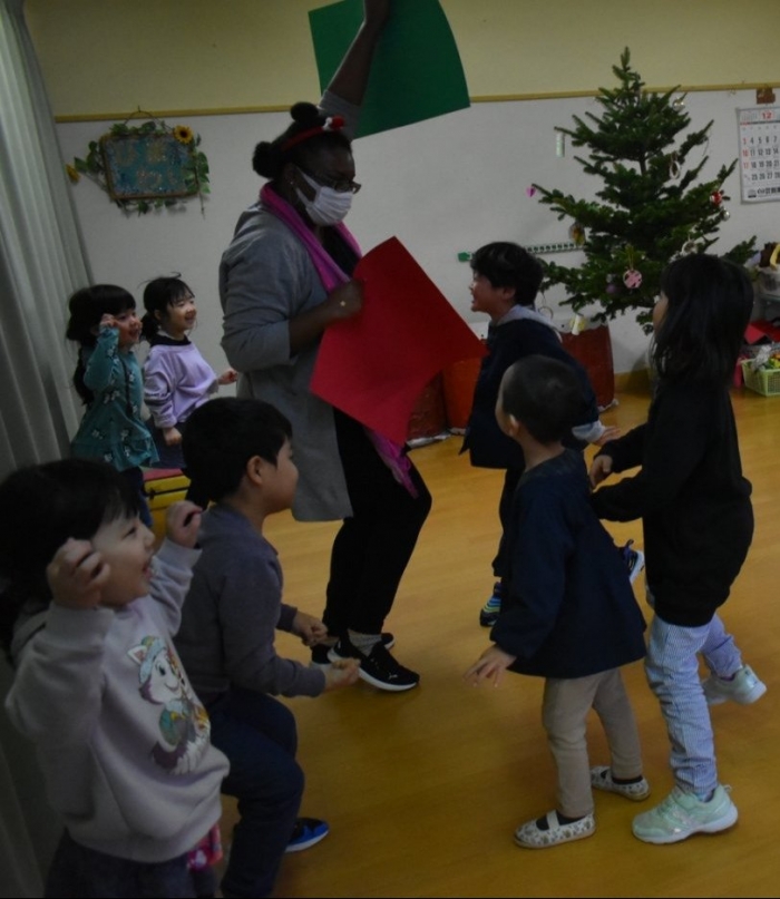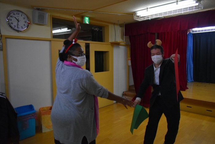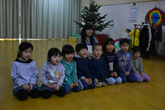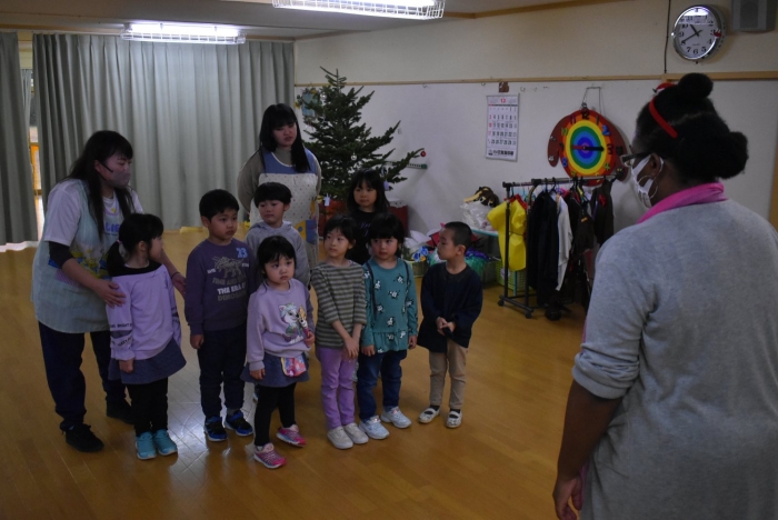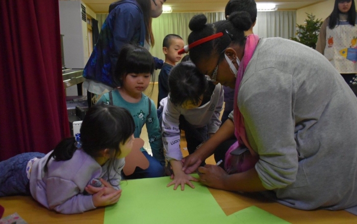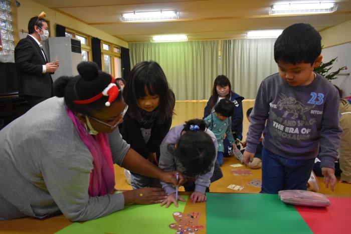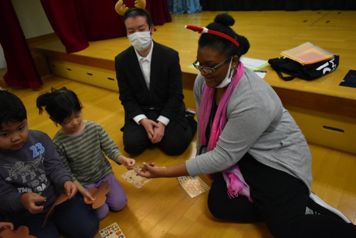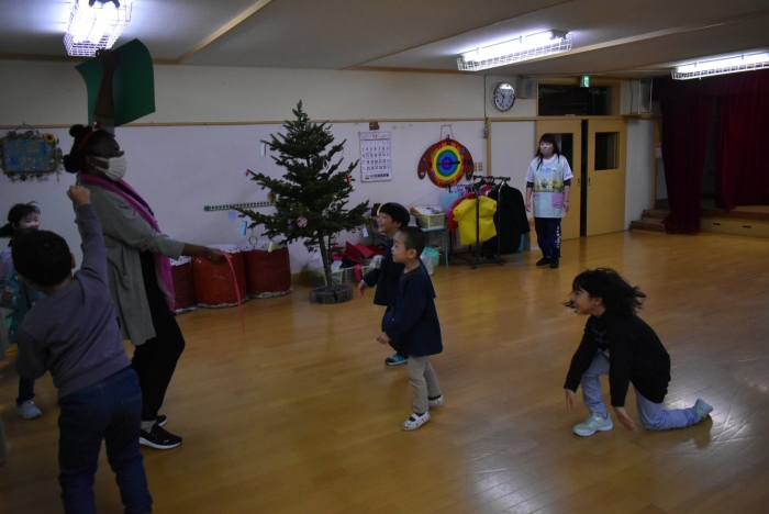 もうすぐXmasということで,サンタとトナカイに変身し「ハロー!!」と,にこやかな笑顔で登場 (^^♪ 初対面の子もいましたが,ほんわか場が和みました。Xmasバージョンの英語カードを読んだり,ジンジャ―ブレットマン(人型クッキー)の紙型にシールデコレーションをしたり,英語版『だるまさんが転んだ』『かくれんぼ』をして,遊びながら英語に親しみました。これまで,たくさん英語に触れてきたことで聴き取る力もついてきたのか,臆することなく英語を真似る子ども達に,先生方も驚きの声を上げていました。引き込まれる仕掛け・内容はもちろん,朗らかで表現力豊かなD先生とK先生に すっかり心もほぐれ終始笑顔で過ごしていた子ども達。親しみを感じた先生方との関りを通し,ますます英語って楽しい♫ 大好き♥ と感じる体験となりました。明日開催される『子どもの成長を見る会』で,D先生とK先生に再会できることを心待ちにしていました。