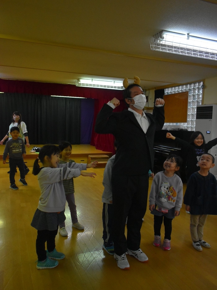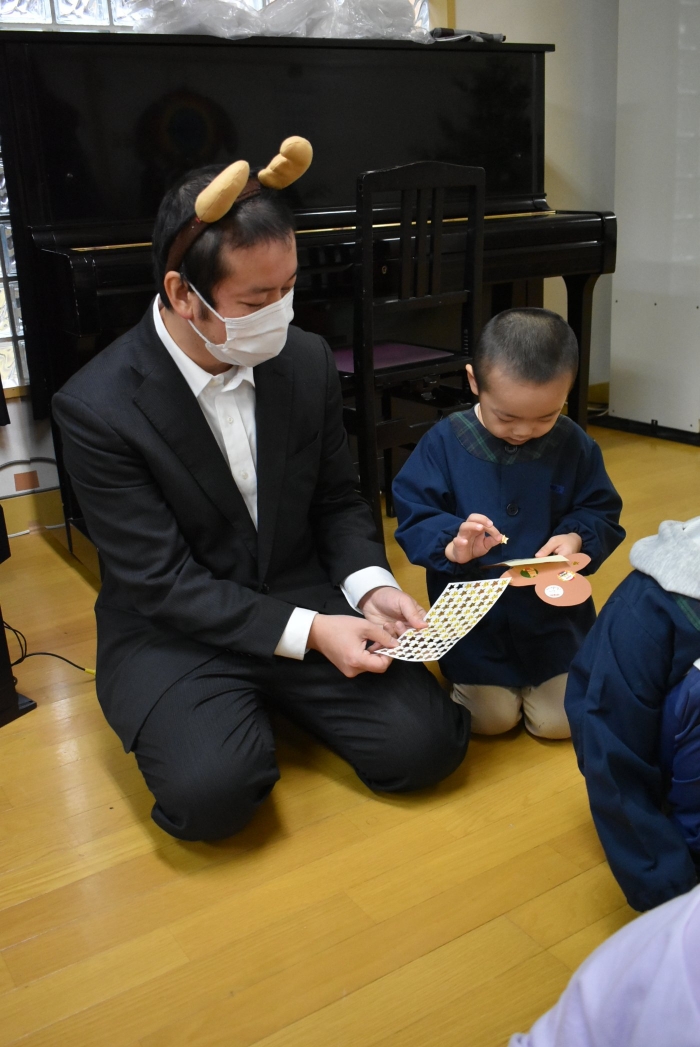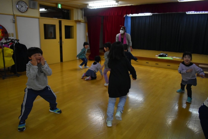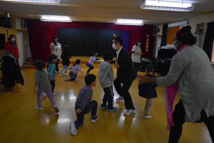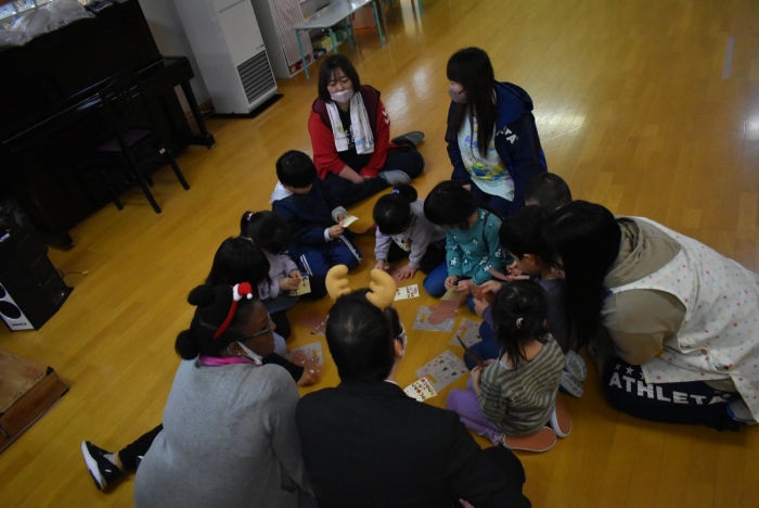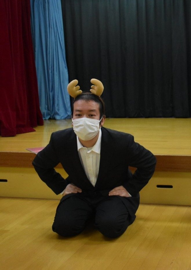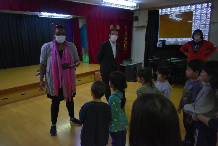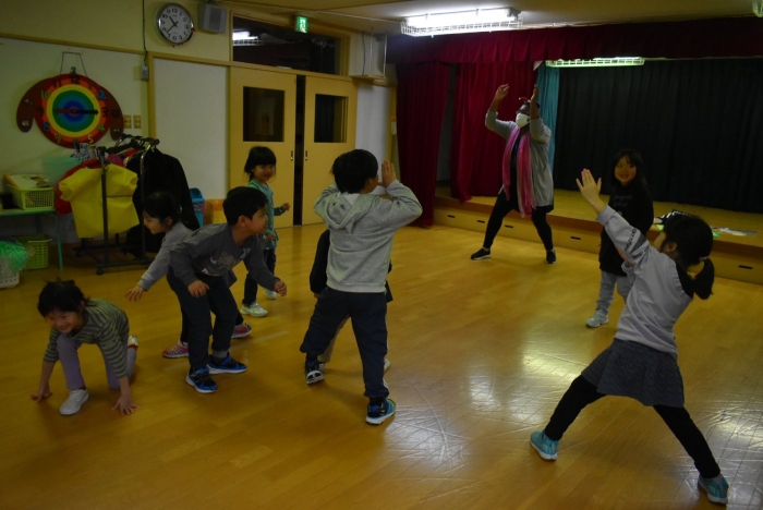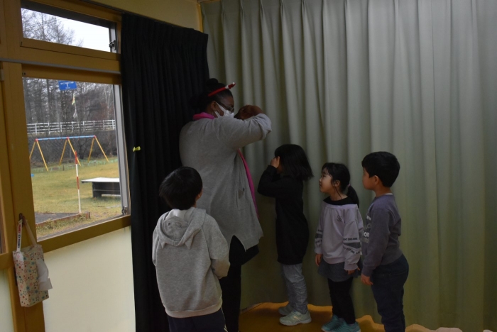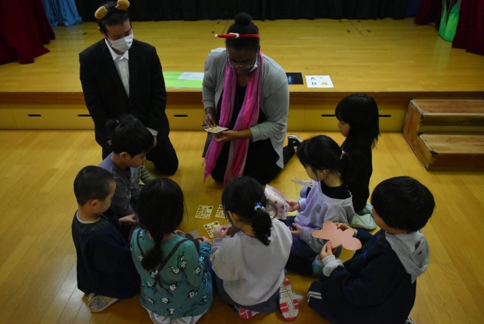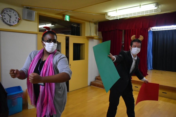 もうすぐXmasということで,サンタとトナカイに変身し「ハロー!!」と,にこやかな笑顔で登場 (^^♪ 初対面の子もいましたが,ほんわか場が和みました。Xmasバージョンの英語カードを読んだり,ジンジャ―ブレットマン(人型クッキー)の紙型にシールデコレーションをしたり,英語版『だるまさんが転んだ』『かくれんぼ』をして,遊びながら英語に親しみました。これまで,たくさん英語に触れてきたことで聴き取る力もついてきたのか,臆することなく英語を真似る子ども達に,先生方も驚きの声を上げていました。引き込まれる仕掛け・内容はもちろん,朗らかで表現力豊かなD先生とK先生に すっかり心もほぐれ終始笑顔で過ごしていた子ども達。親しみを感じた先生方との関りを通し,ますます英語って楽しい♫ 大好き♥ と感じる体験となりました。明日開催される『子どもの成長を見る会』で,D先生とK先生に再会できることを心待ちにしていました。
