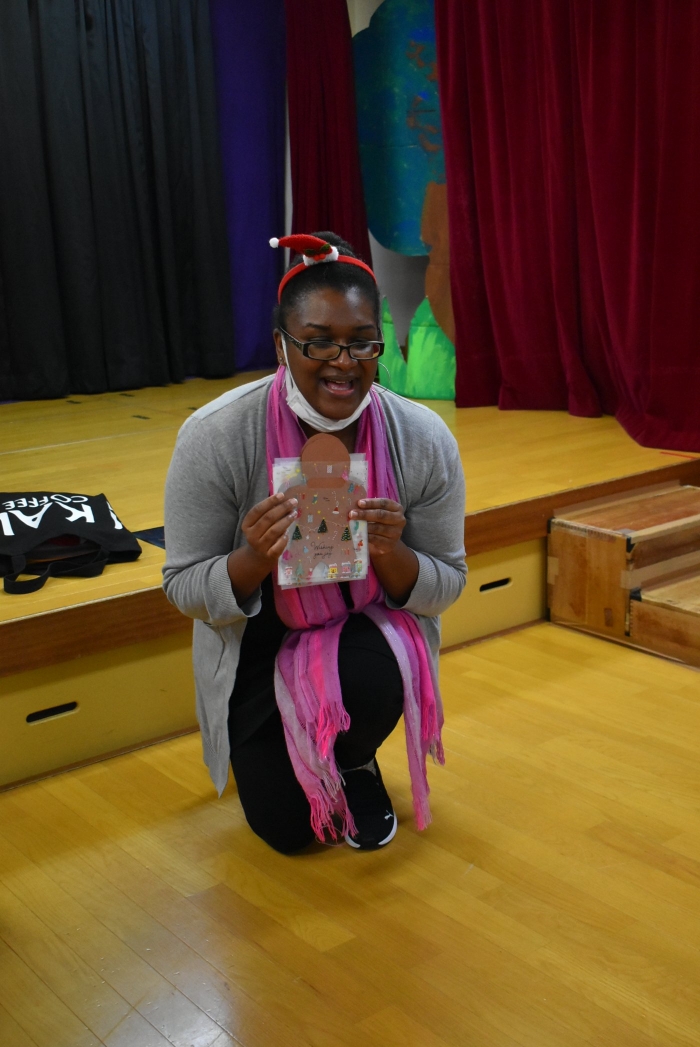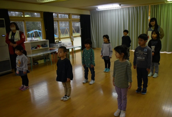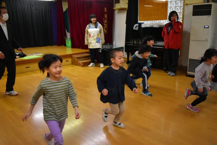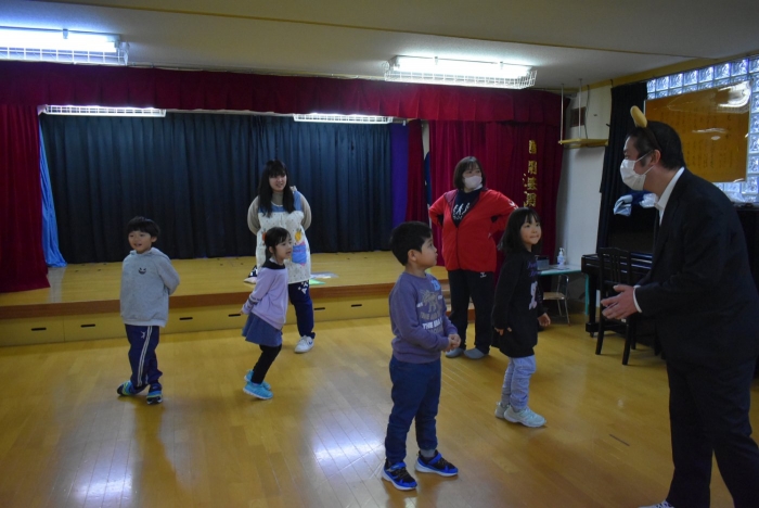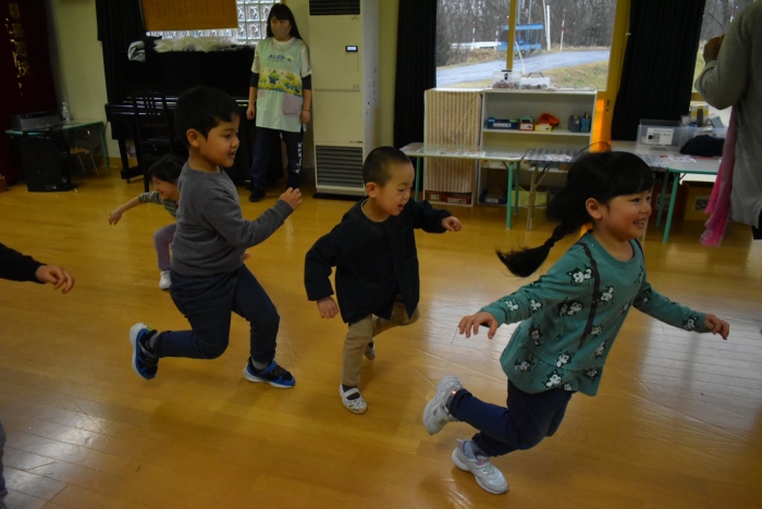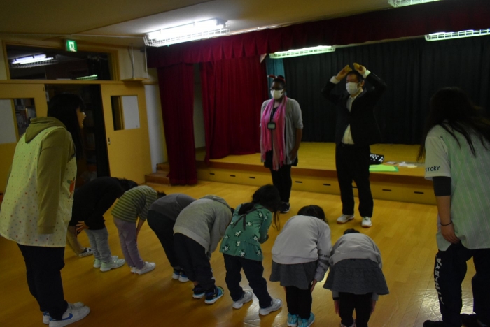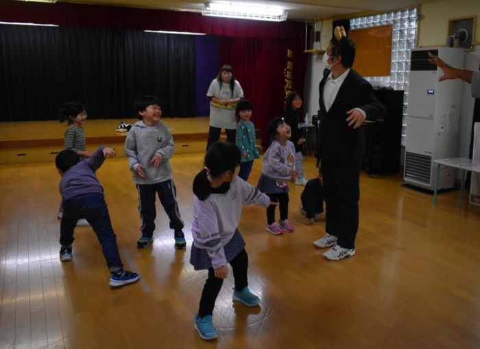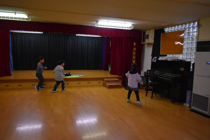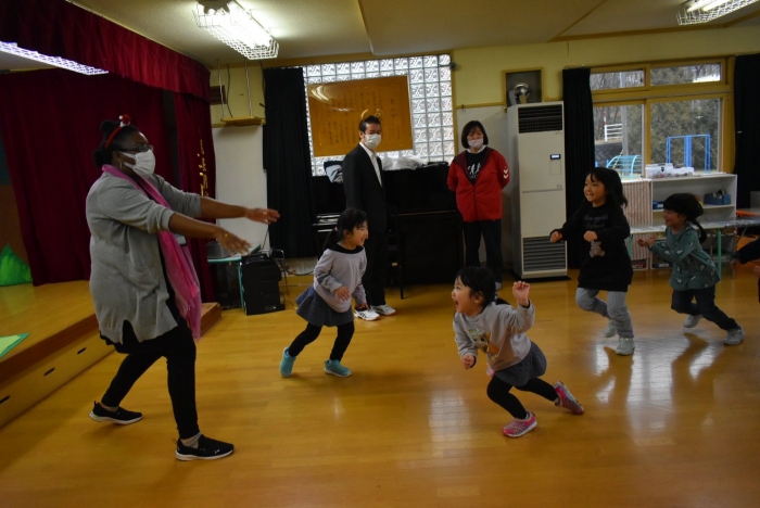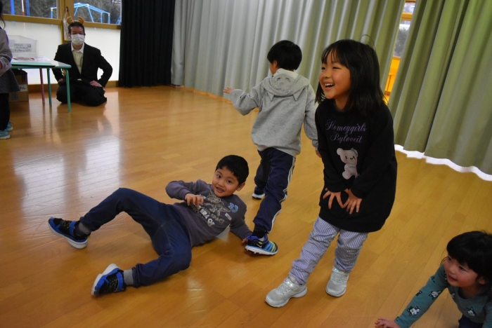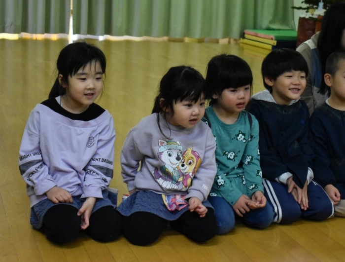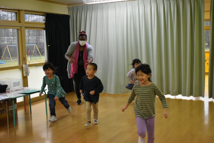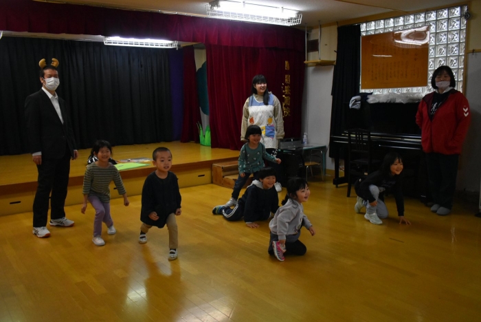 もうすぐXmasということで,サンタとトナカイに変身し「ハロー!!」と,にこやかな笑顔で登場 (^^♪ 初対面の子もいましたが,ほんわか場が和みました。Xmasバージョンの英語カードを読んだり,ジンジャ―ブレットマン(人型クッキー)の紙型にシールデコレーションをしたり,英語版『だるまさんが転んだ』『かくれんぼ』をして,遊びながら英語に親しみました。これまで,たくさん英語に触れてきたことで聴き取る力もついてきたのか,臆することなく英語を真似る子ども達に,先生方も驚きの声を上げていました。引き込まれる仕掛け・内容はもちろん,朗らかで表現力豊かなD先生とK先生に すっかり心もほぐれ終始笑顔で過ごしていた子ども達。親しみを感じた先生方との関りを通し,ますます英語って楽しい♫ 大好き♥ と感じる体験となりました。明日開催される『子どもの成長を見る会』で,D先生とK先生に再会できることを心待ちにしていました。