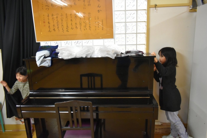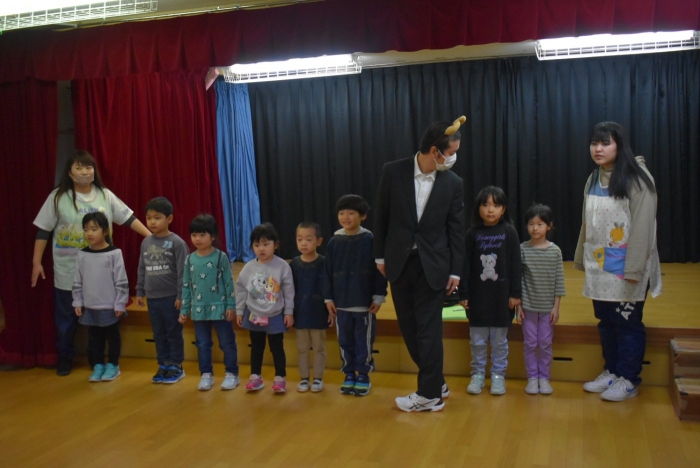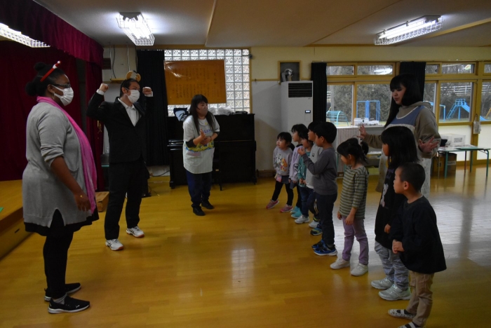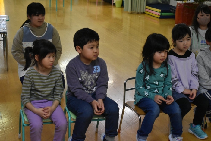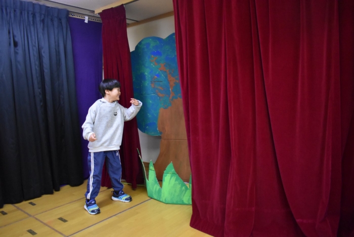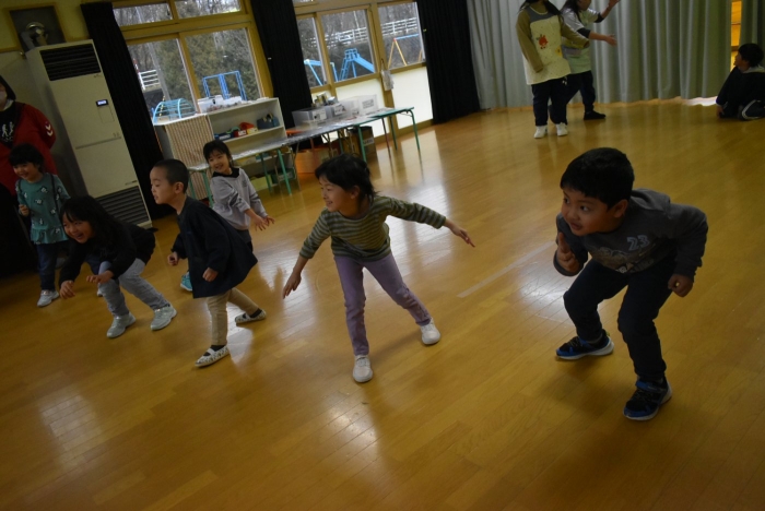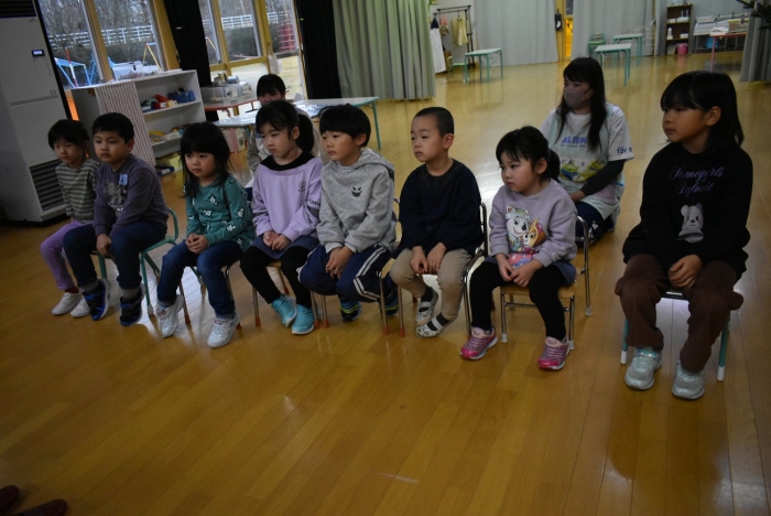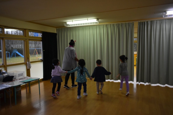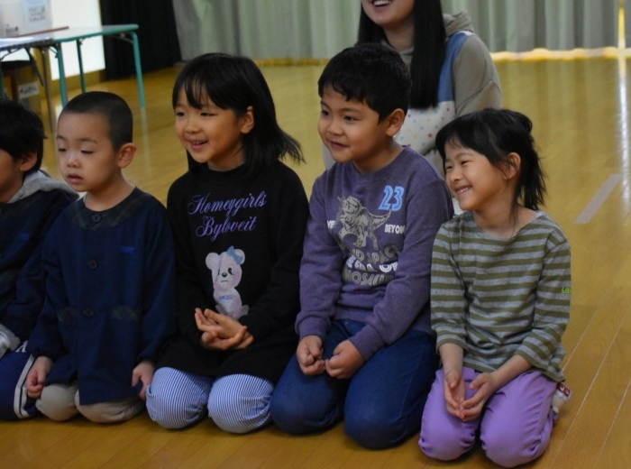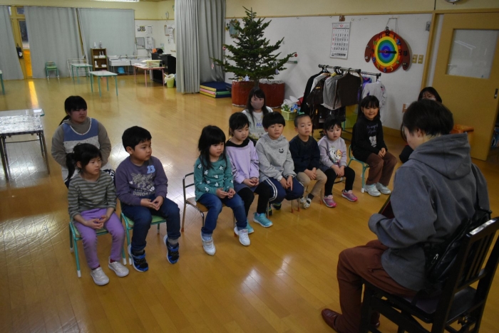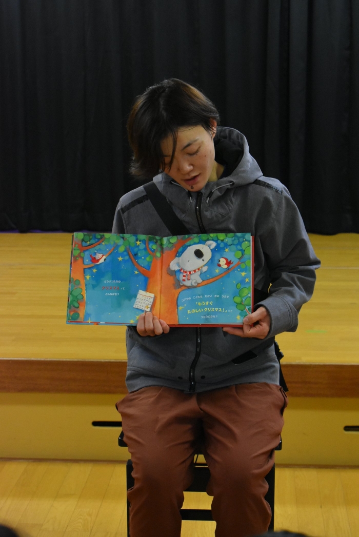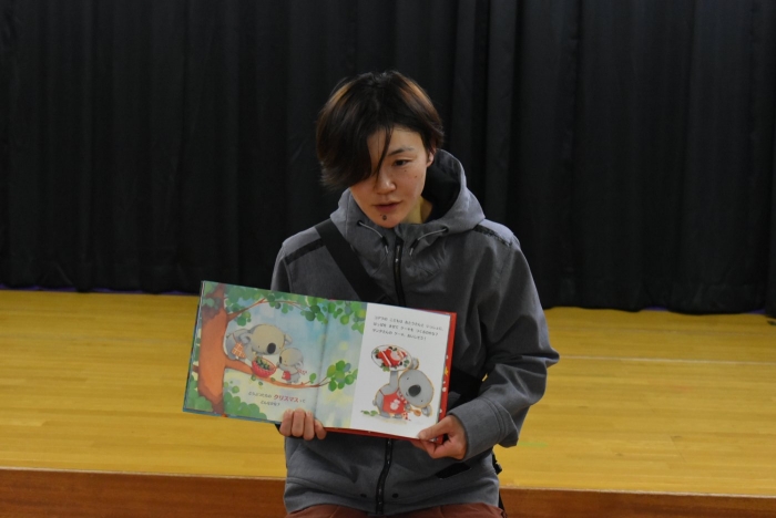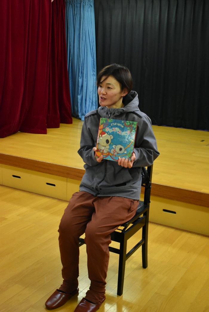 動物たちだって,きっとクリスマスをお祝いしているはず! コアラ,カメ,ペンギン,オリックス,ビーバー,ハリネズミ,カニ,バッファロー,ツル,トナカイ。様々な動物が登場し,その動物の特徴に合わせたクリスマス準備を想像し話が進んでいきます。コアラが再登場すると,木の枝がクリスマス風に装飾されているのに 子ども達は気づいたでしょうか? ほのぼの可愛い絵とお話,語り手のお母さんの ほんわか優しい声色が相まって,クリスマスを待ちわびる癒しの空間となりました。