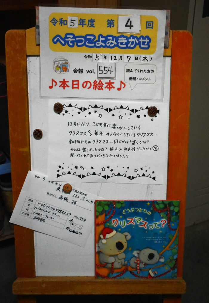 第4回,累計554回目となる『へそっこ読み聞かせ』がありました。もうすぐXmas☆彡ということで,家にある『どうぶつたちのクリスマスって?』という絵本を読み聞かせしていただきました。