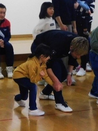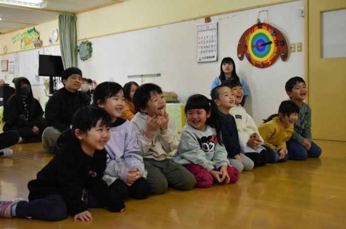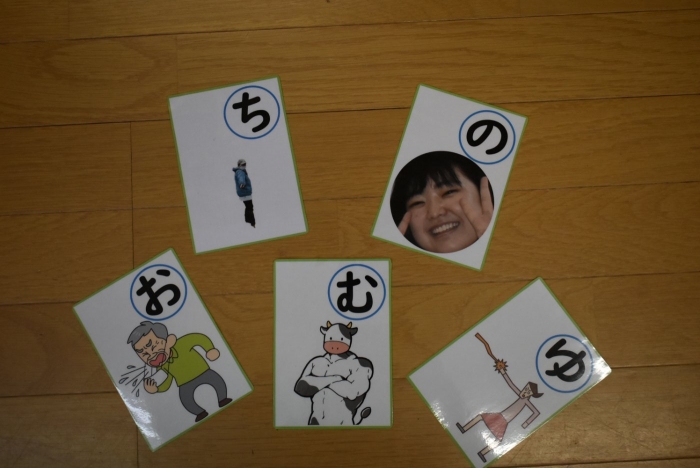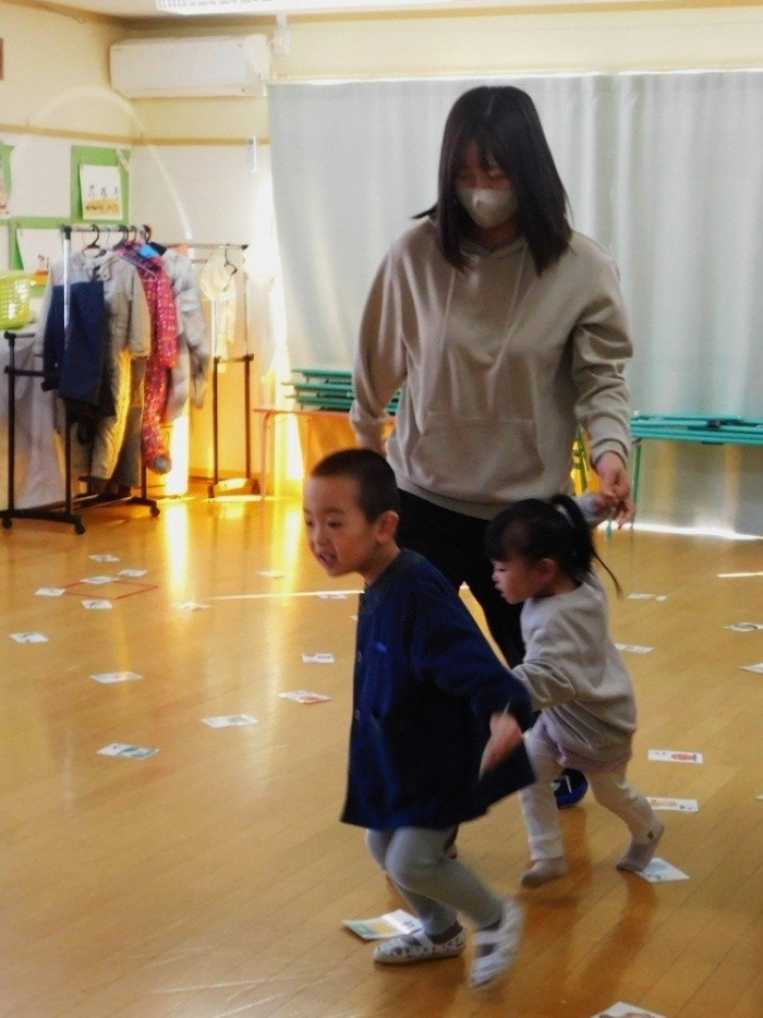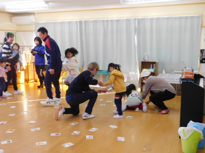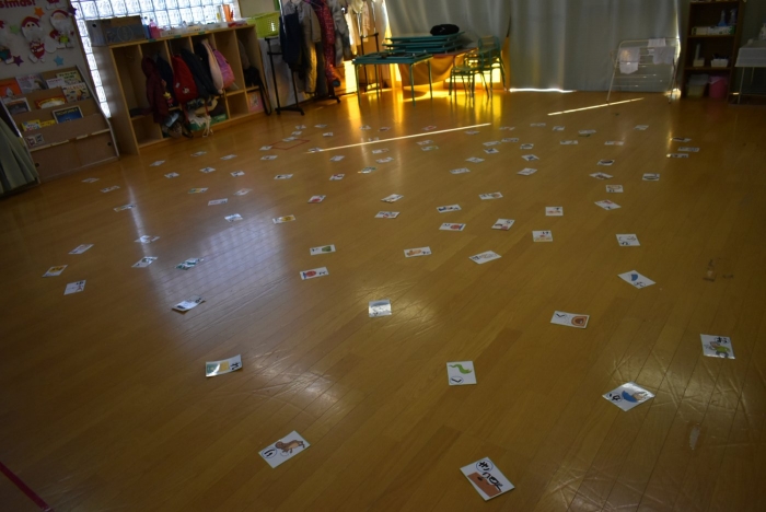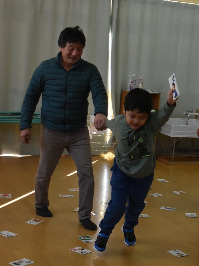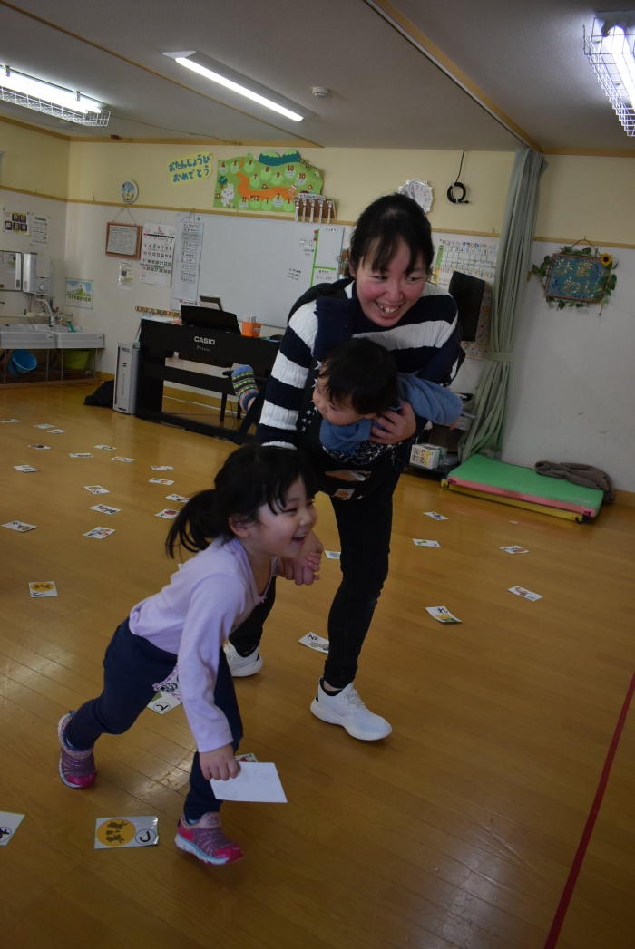 二つ目は『オリジナルカルタ』,紅白各チーム2組ずつ交互に出て,カルタを取ります。オリジナルとあって,『「む」ムキムキの牛さん』『「ゆ」指からビーム』『「の」望美(担任)のドアップ』『「「ち」小さい麻美(担任)』など,面白い札が飛び出します。笑いながらも,勝負事には手を抜かないのが中西っ子!? 全力の分,悔し泣きをする子もいると思っていましたが,予想を上回る展開となりました。でも,前年度よりは気持ちの切り替えが早くなりました。 今度の親子ゲーム,雪上お楽しみ会では,みんな笑顔で終われるでしょうか?