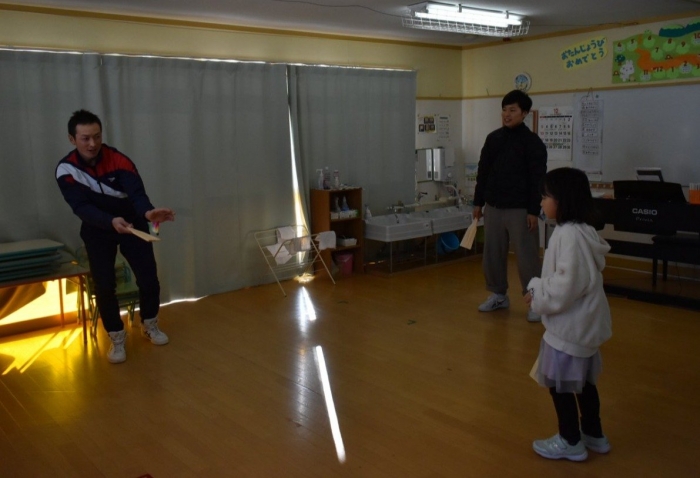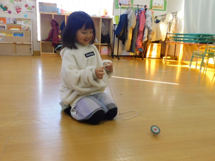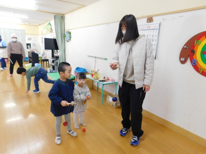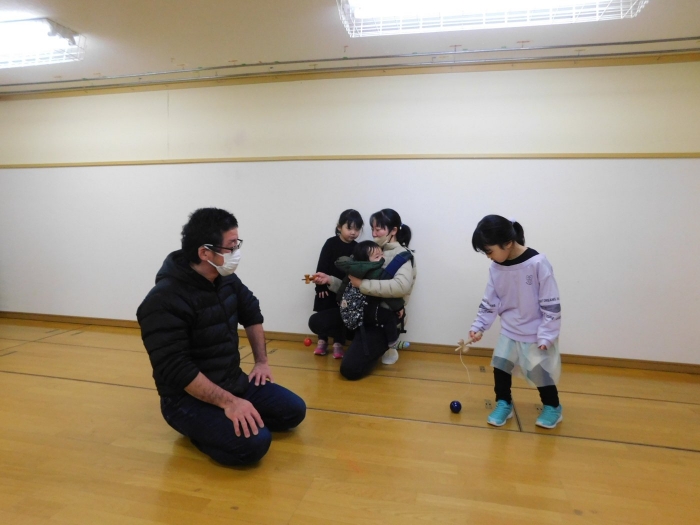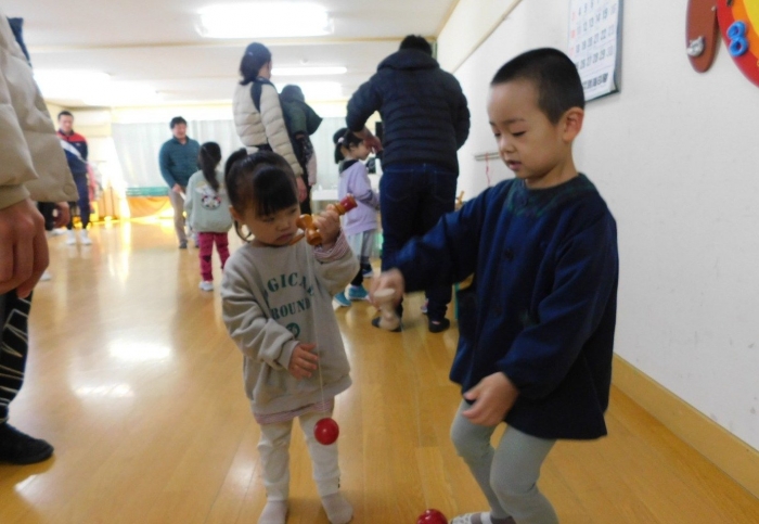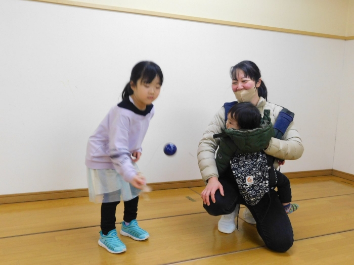 『正月遊び体験』では,コマ,剣玉,羽子板に親しみました。一石二鳥ではできないのが昔ながらの遊び。巧くいかないもどかしさを感じつつ,挑戦意欲をわかせたり,親子で技を伝授し合ったりし,少しでも出来た時には大いに喜び合っていました。