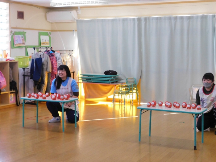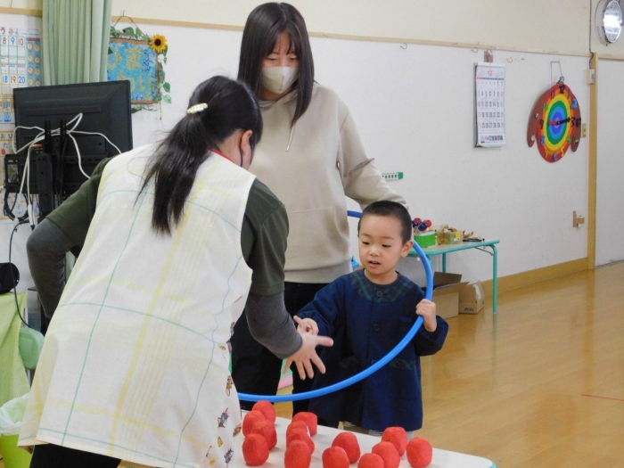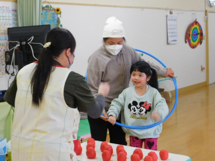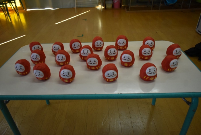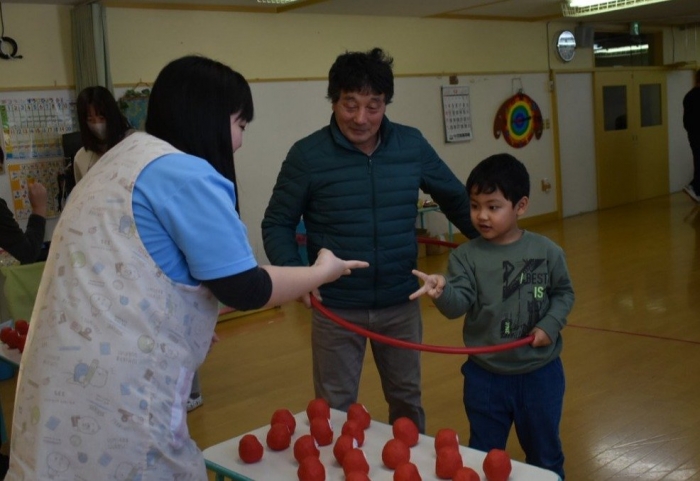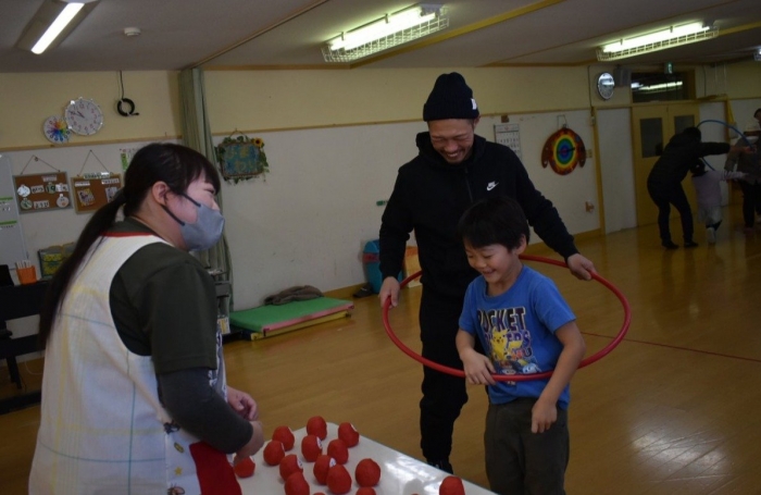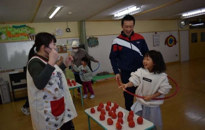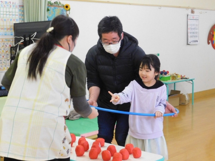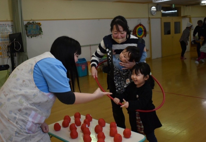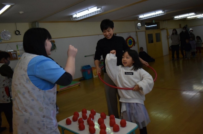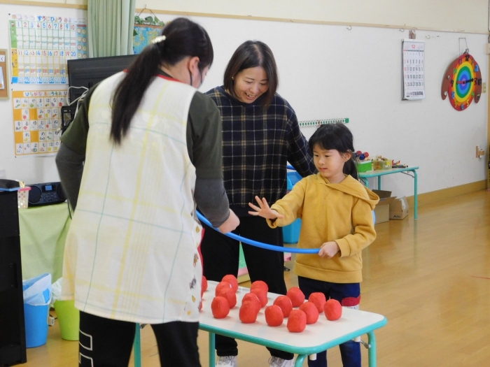 最後は,親子紅白チーム戦で2負種類のゲームを行いました。一つ目は『たるま取りゲーム』で,リレー形式のチーム戦です。フラフープをバトン代わりに,折返し地点にいる先生とジャンケン勝負! 勝つとダルマを貰え,負けると手ぶらで次の親子へバトンタッチし,受け取ったダルマの数で勝敗が決まります。ちなみに,ダルマはM先生が夜な夜な作りました。(決して暇だったわけではありませんよ(笑))ジャンケンは時の運なのですが,なぜか紅チームの折り返し地点では勝負運が強くなる先生方…。負け続きとなった紅チームの子ども達には,かなり恨まれたことと思います(笑)