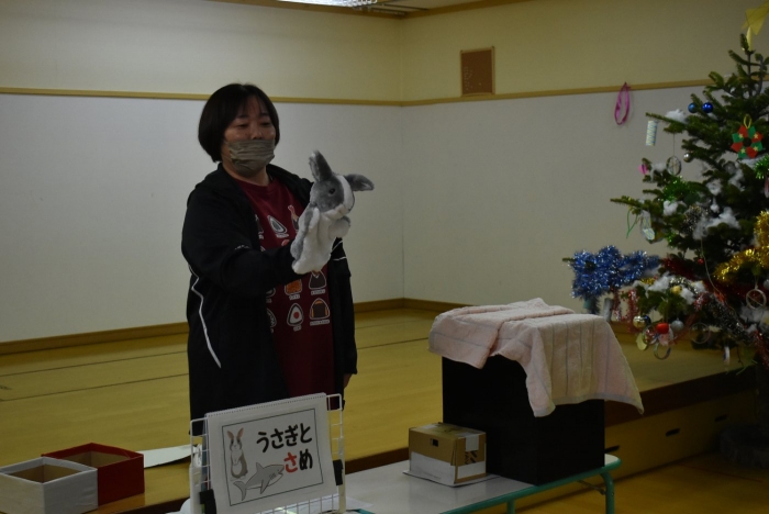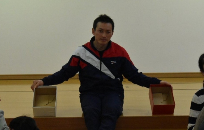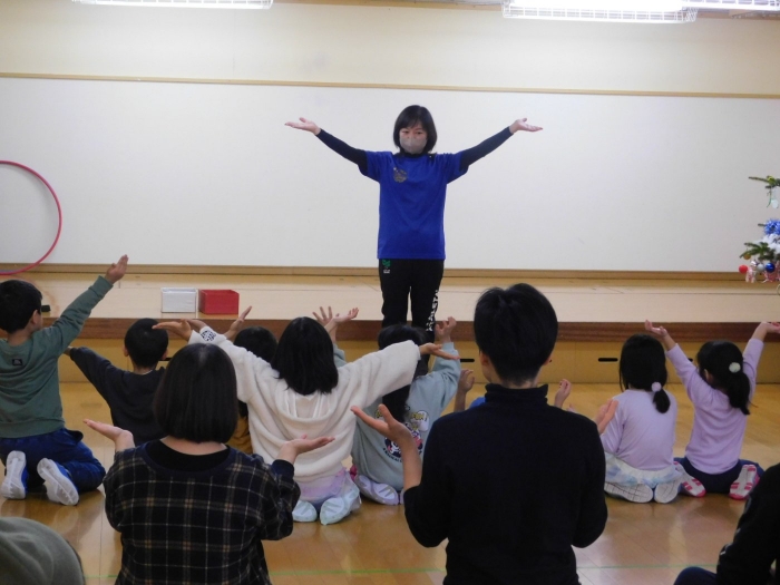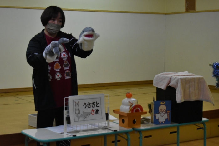 親子で楽しめる正月遊びを通し,日本古来の遊びや伝統行事に触れることをねらいに,『親子正月ゲーム大会』を実施しました。昨日も,除雪で大変お世話になりましたPTA会長からの挨拶で開会した後,正月の由来について見聞きしたり,問い掛けに答えたりしました。解説役のウサギとサメのやり取りに心を鷲掴みにされ,会場は大盛り上がり! ちなみに,このウサギ&サメはAmazonからやってきたそうです(笑) 子ども達にとって身近なコープさっぽろや東武といった話題も繰り出し,肝心の本題が頭に入っているか少々不安でしたが,正月に飾るしめ縄,門松,鏡餅,それぞれのモノ・コトには意味がある,意味が込められていることに関心を寄せていました。