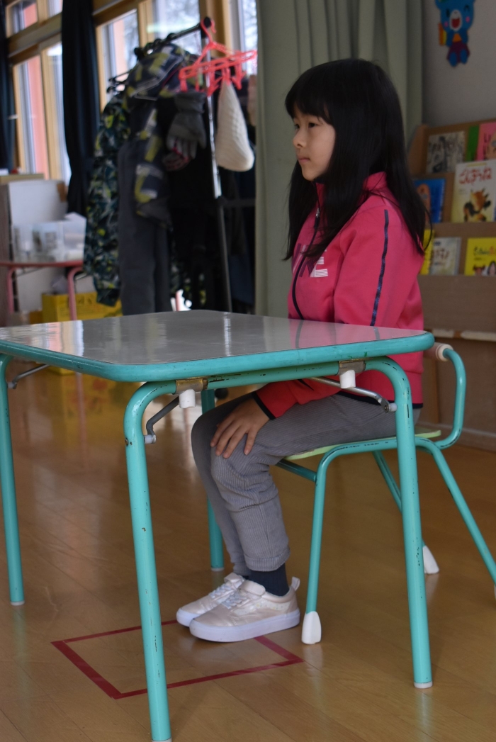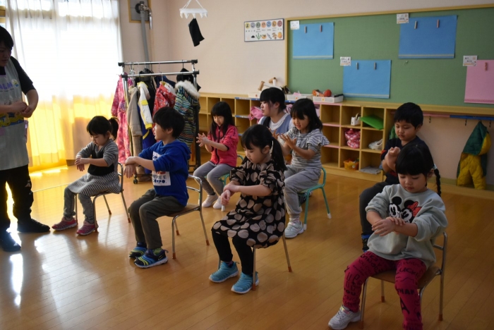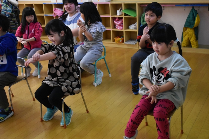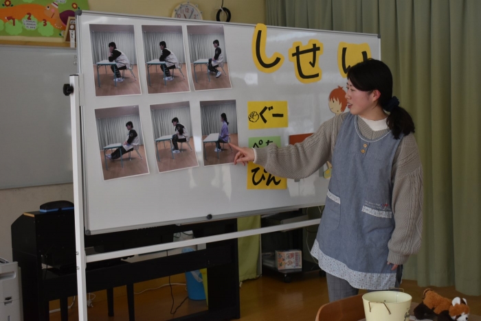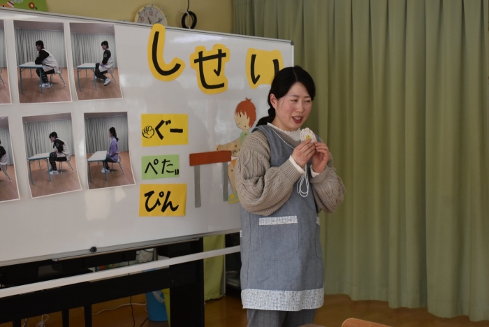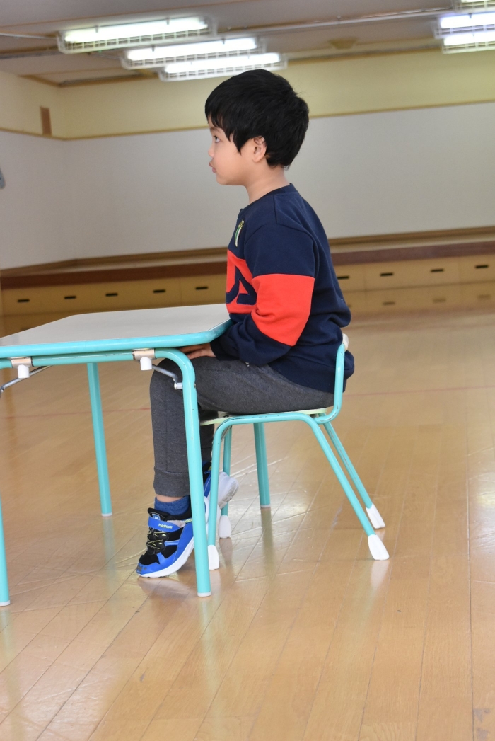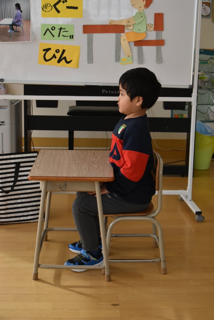 引き続き,年長組は『姿勢』について学びました。姿勢の維持に欠かせないのが床に足を付け『踏ん張る力』,その感覚を知るため,足でものを掴む・移動させる遊びを体験! 見事な足さばきで,足癖の悪いさ!?(笑)ではなく,踏ん張る力が備わっていることを実証していました。姿勢が及ぼす身体の影響について知ったり,写真を見ながら悪い姿勢・いい姿勢の選択クイズに答えたりし,「なぜ?」「どうして?」と考えることにつながっていました。『グー』『ペタ』『ピン』の感覚を意識することで正しい姿勢になること,それを小学校仕様の机と椅子でも体験! 互いの座り方を確認し,自分では気づけないことを教え合っていました。 いつも以上に座り方を意識していた年長組,見事『姿勢マスター』の認定メダルをいただきました☆彡 グー・ペタ・ピンを合言葉に,継続的に意識していきたいと思います。