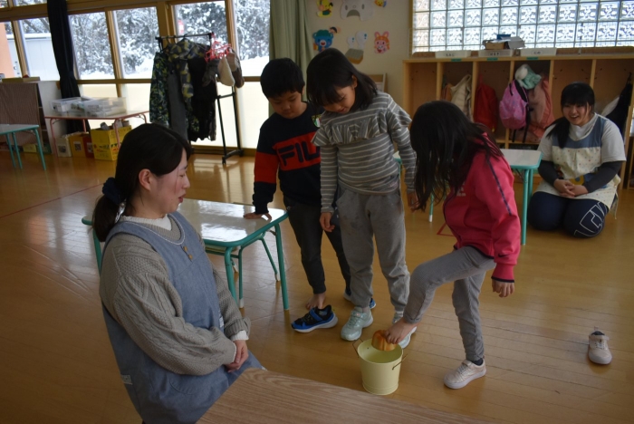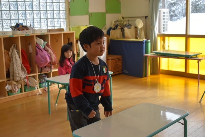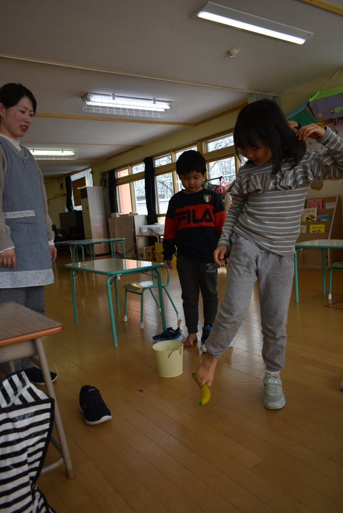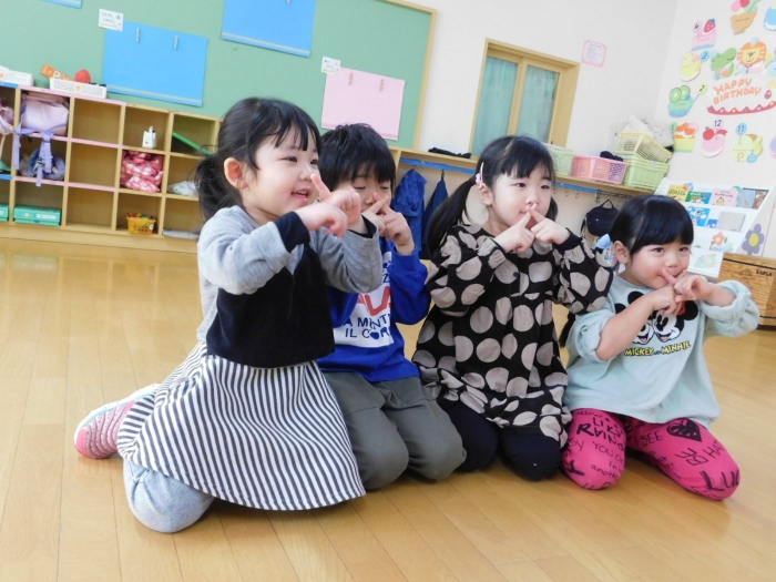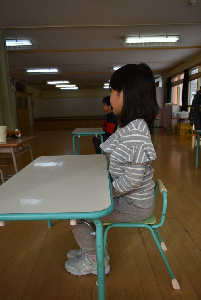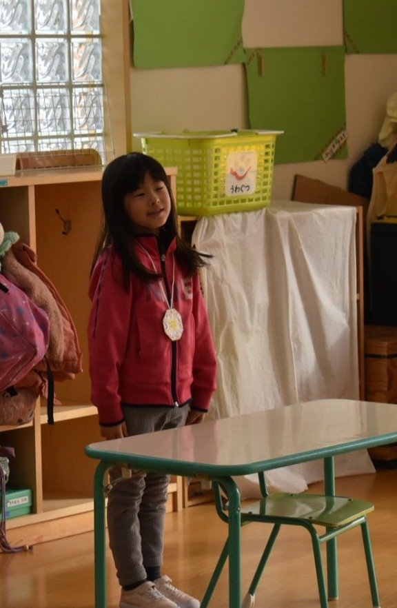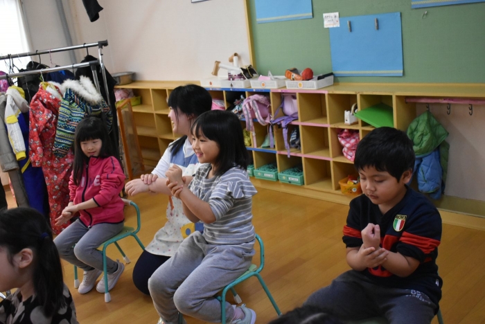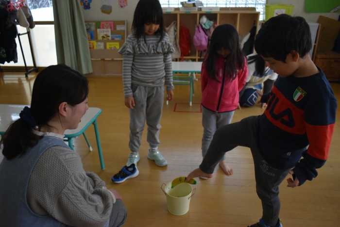 引き続き,年長組は『姿勢』について学びました。姿勢の維持に欠かせないのが床に足を付け『踏ん張る力』,その感覚を知るため,足でものを掴む・移動させる遊びを体験! 見事な足さばきで,足癖の悪いさ!?(笑)ではなく,踏ん張る力が備わっていることを実証していました。姿勢が及ぼす身体の影響について知ったり,写真を見ながら悪い姿勢・いい姿勢の選択クイズに答えたりし,「なぜ?」「どうして?」と考えることにつながっていました。『グー』『ペタ』『ピン』の感覚を意識することで正しい姿勢になること,それを小学校仕様の机と椅子でも体験! 互いの座り方を確認し,自分では気づけないことを教え合っていました。 いつも以上に座り方を意識していた年長組,見事『姿勢マスター』の認定メダルをいただきました☆彡 グー・ペタ・ピンを合言葉に,継続的に意識していきたいと思います。